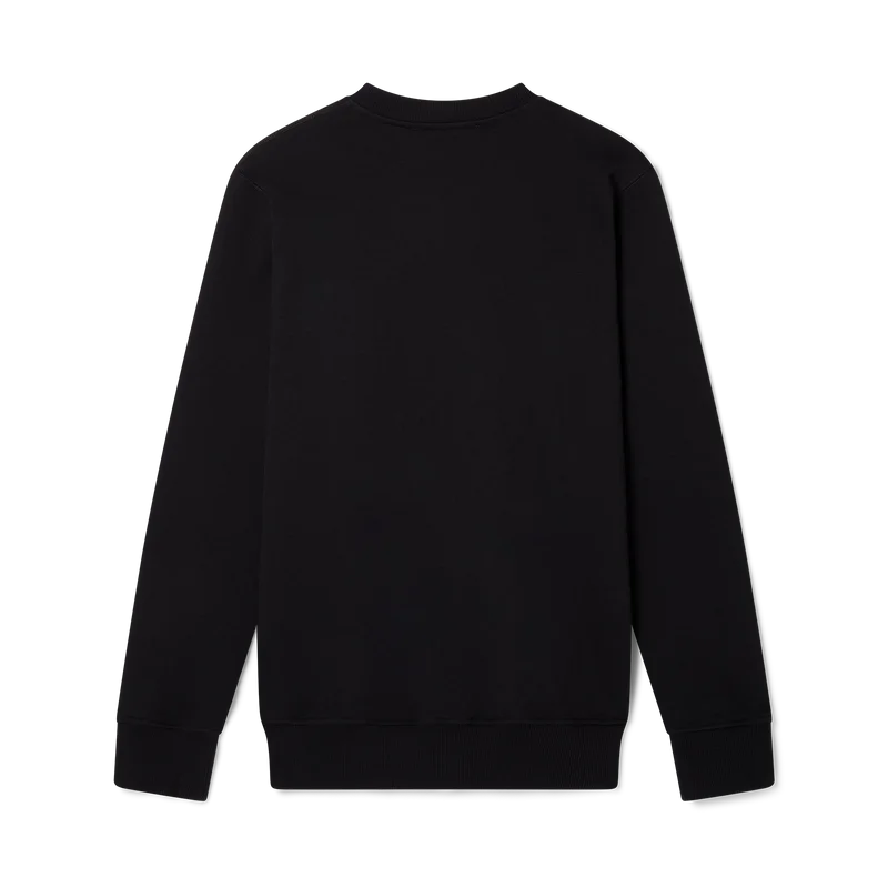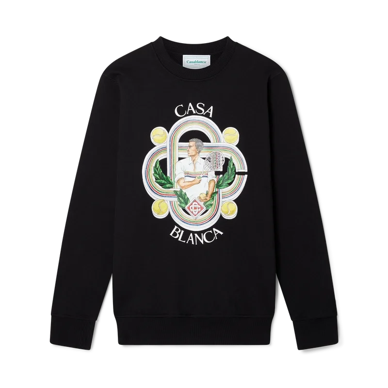 Le Joueur-tröjan i svart ekologisk bomull med screentryck har säsongsanpassade motiv som införlivar husets signaturikonografi inom tennis. Den har en klassisk rund hals, långa ärmar och ett Casablanca Paris-märke och är designad för en avslappnad passform.