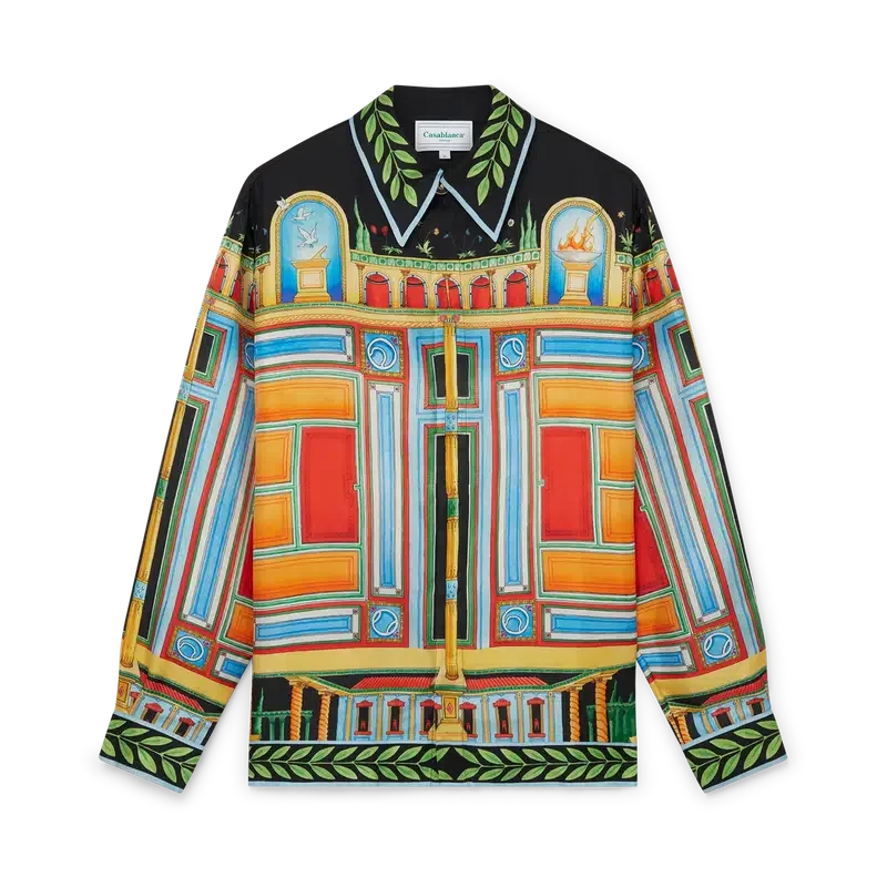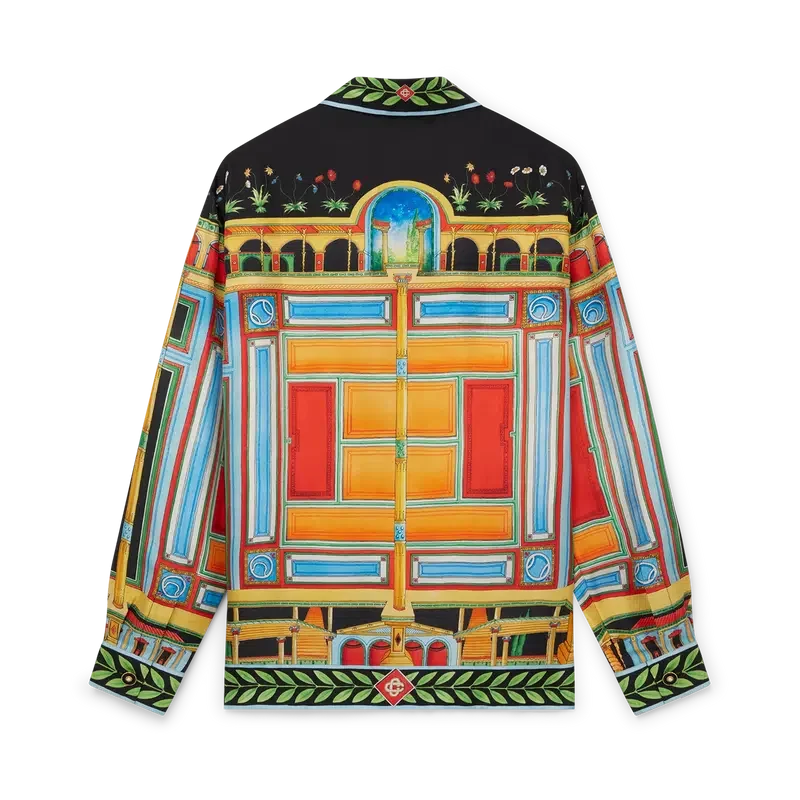 Le Palais En Fleur silkeskjorta är en långärmad skjorta med heltryckt mönster med säsongsbetonade motiv inspirerade av Pompejis arkitektoniska historia, dess livfulla färger och symmetri, tillverkad av silketwill. Kompletterad med husets signaturknappar i guldkantade pärlor, knäppning, kubansk krage och signaturmotiv med lagerblad på manschetter, fåll, krage och knäppning.