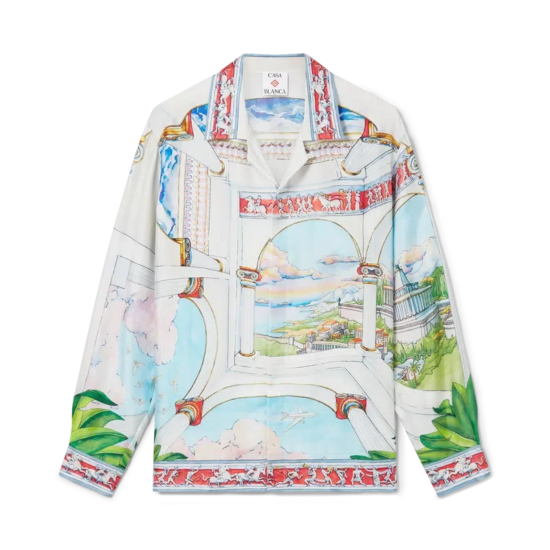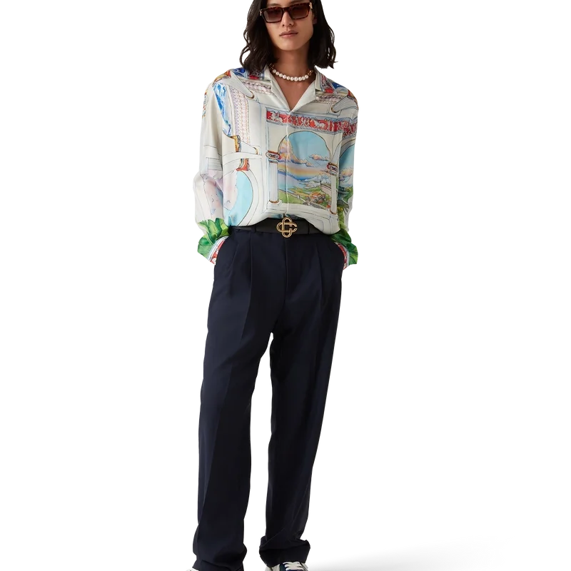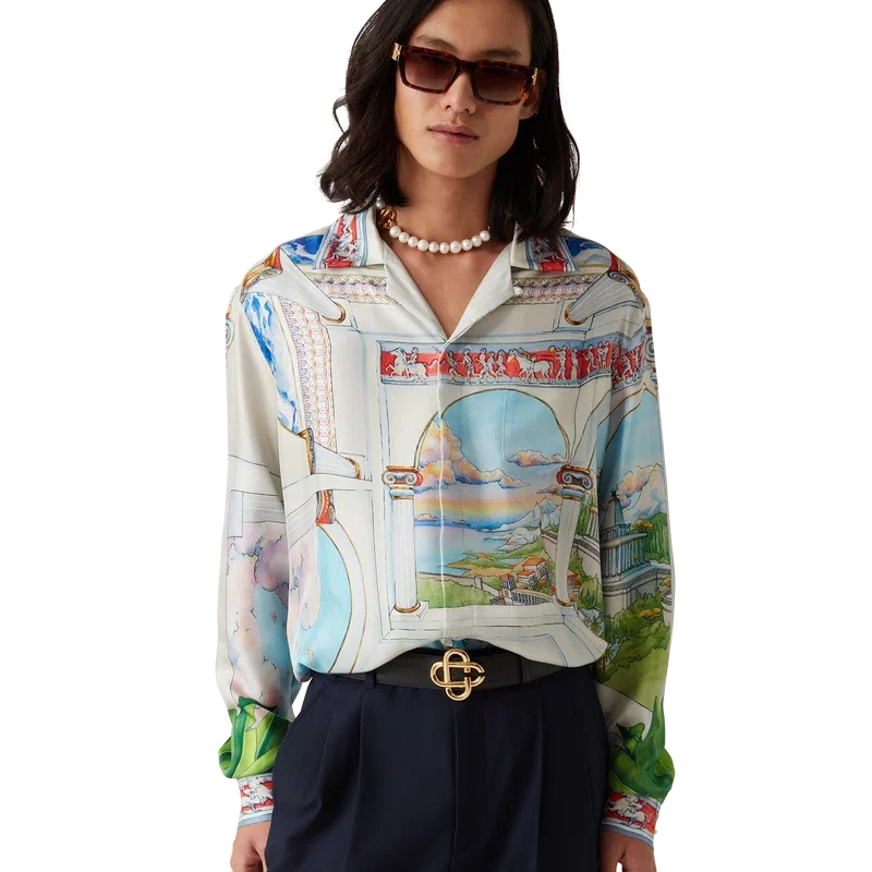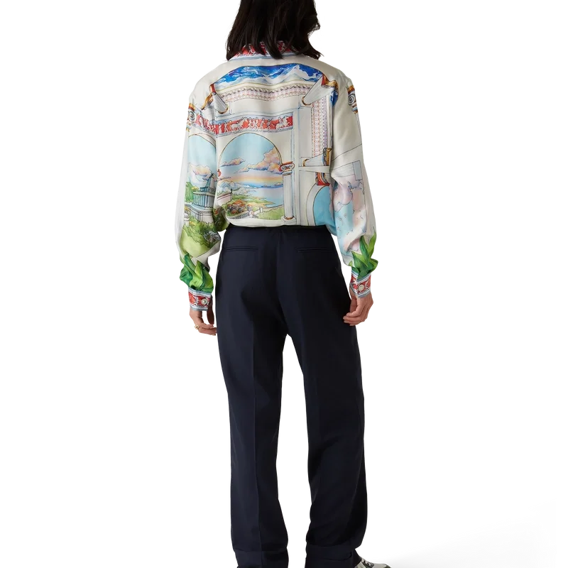 Le Passage-silkeskjortan är en långärmad modell tillverkad av silketwill med husets säsongsbetonade konstverk – som presenterar fyra olika dimensioner som leker med perspektiv och arkitektur. Kompletterad med krage, knäppning, sammankopplade Cc-märkta corozo-knappar, signaturknappar med guldkant och pärla vid kragen och på manschetterna, samt grekisk nyckelinspirerade kantdetaljer på kragen, manschetterna och nederkanten.