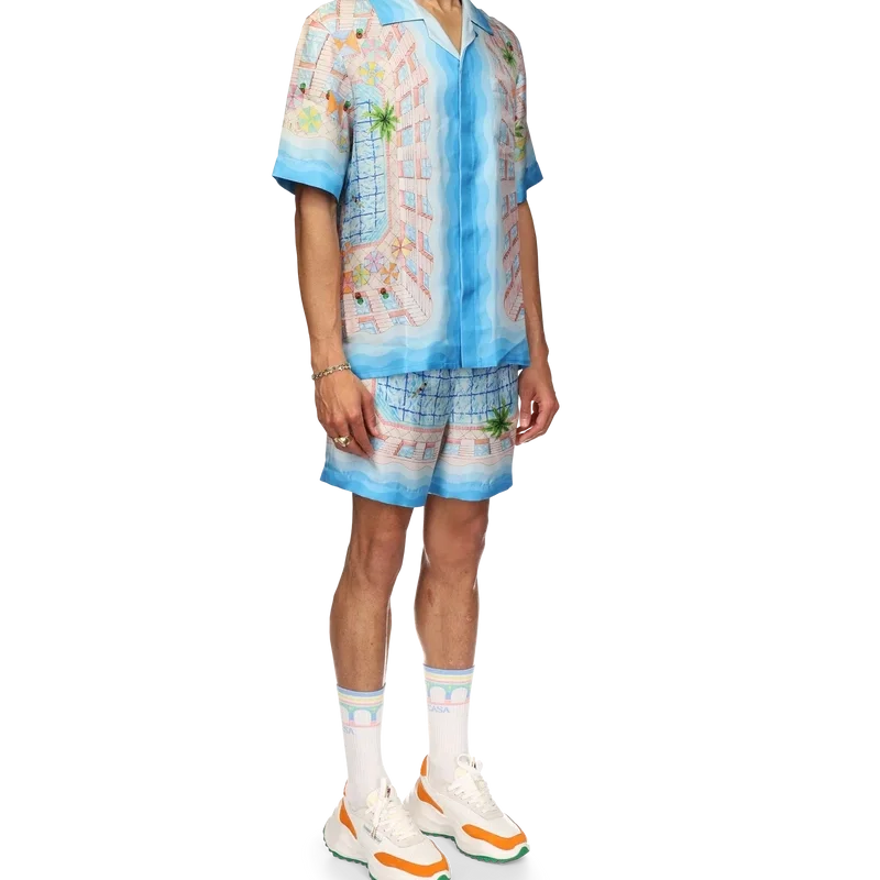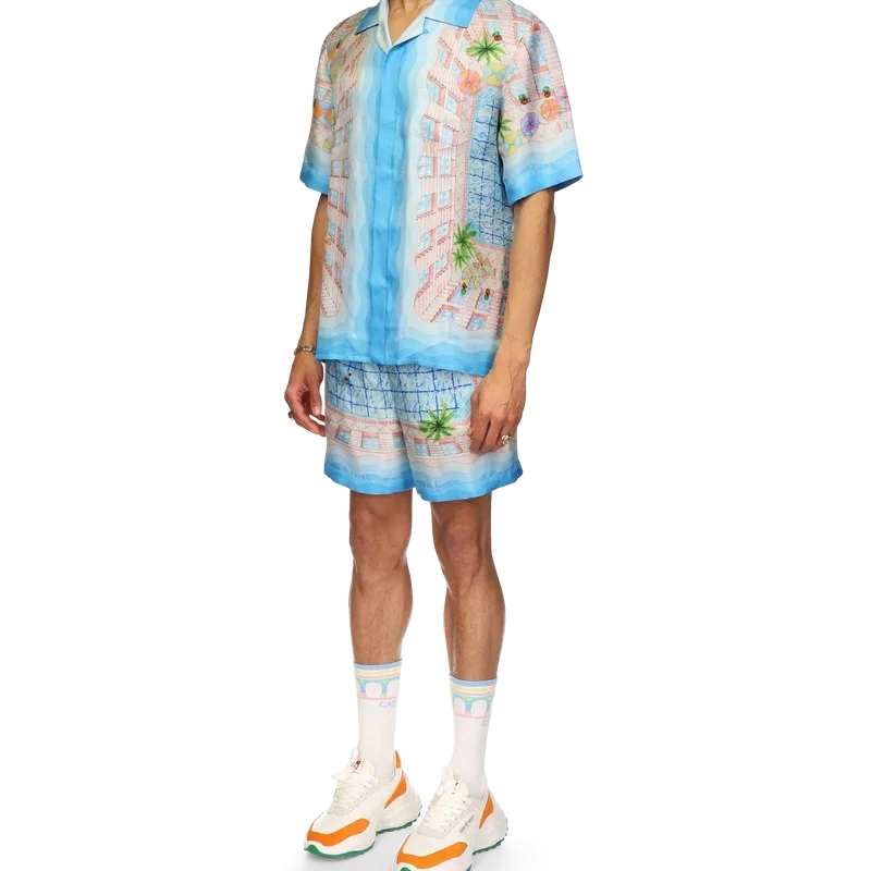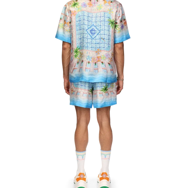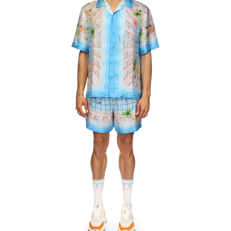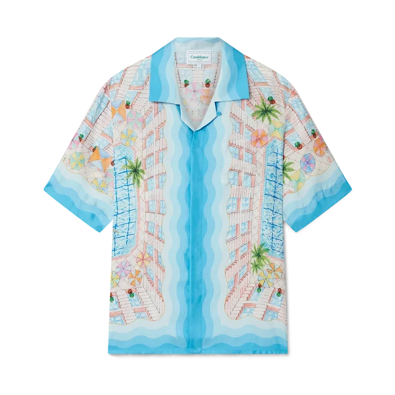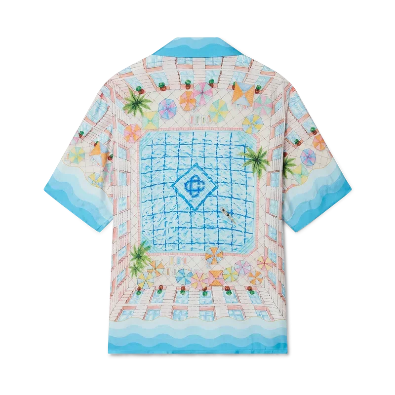 Le Plongeon silkskjorta är en kortärmad, tryckt modell tillverkad av silketwill med säsongsbetonat mönster inspirerat av en vacker dag vid hotellets pool och reselivets idealism sett från ovan – vilket ger ett nytt perspektiv. Färgpaletten är ljus och idealistisk och består av mjuka pastellfärger. Skjortan har knäppning fram, kubansk krage, bröstficka och kontrasterande detaljer i form av Memphis-våginspirerade gradientränder på manschetter, krage, fåll och knäppning.