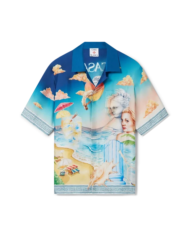 Le Plongeon-silkesskjortan är en kortärmad skjorta med heltryckt mönster, tillverkad i silketwill med husets säsongsbetonade tryck, inspirerat av den fortsatta studien av den klassiska skönheten och den samtida charmen i det antika Grekland, med husets designelement. Kompletterad med signaturknappar i corozo med det sammanflätade CC-logotypen, knäppning, kubansk krage och bröstficka.