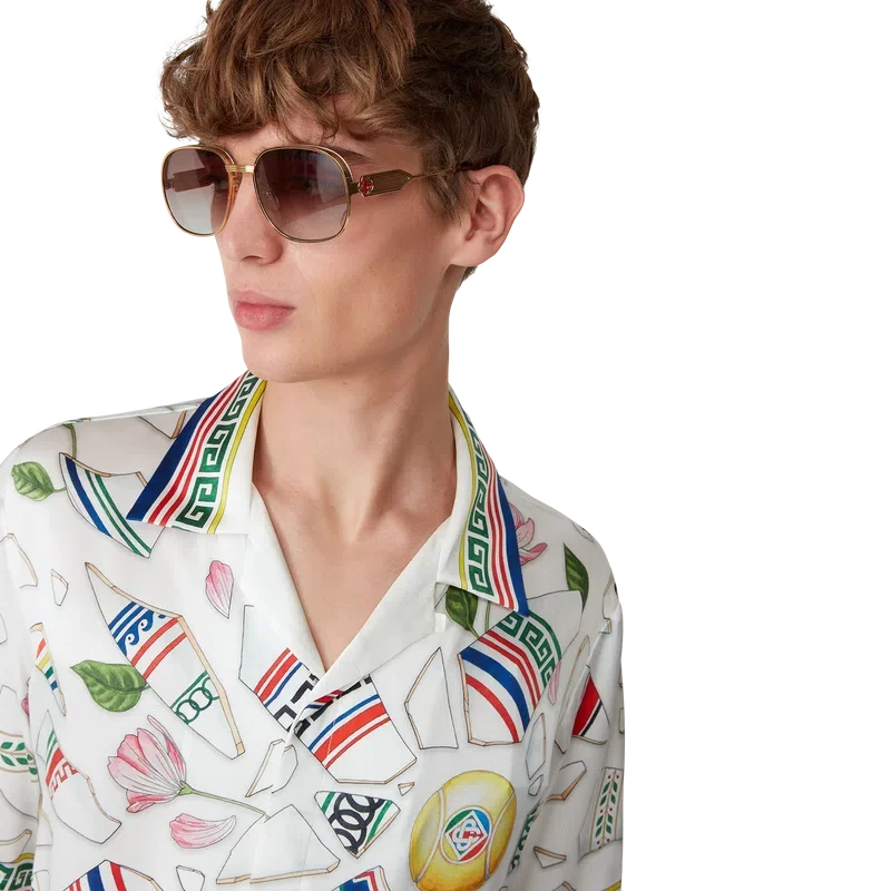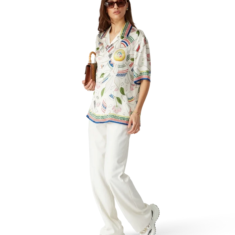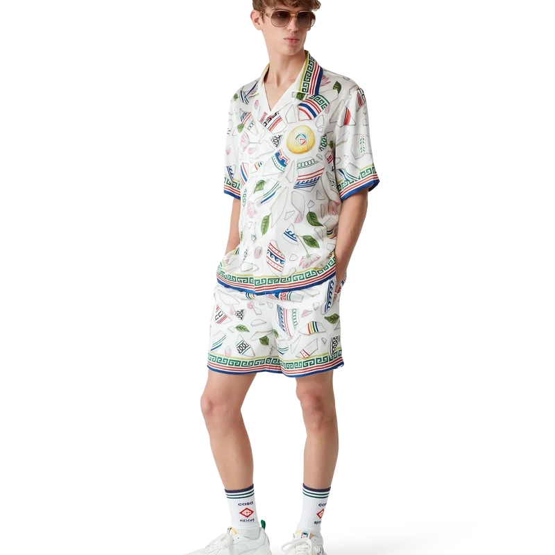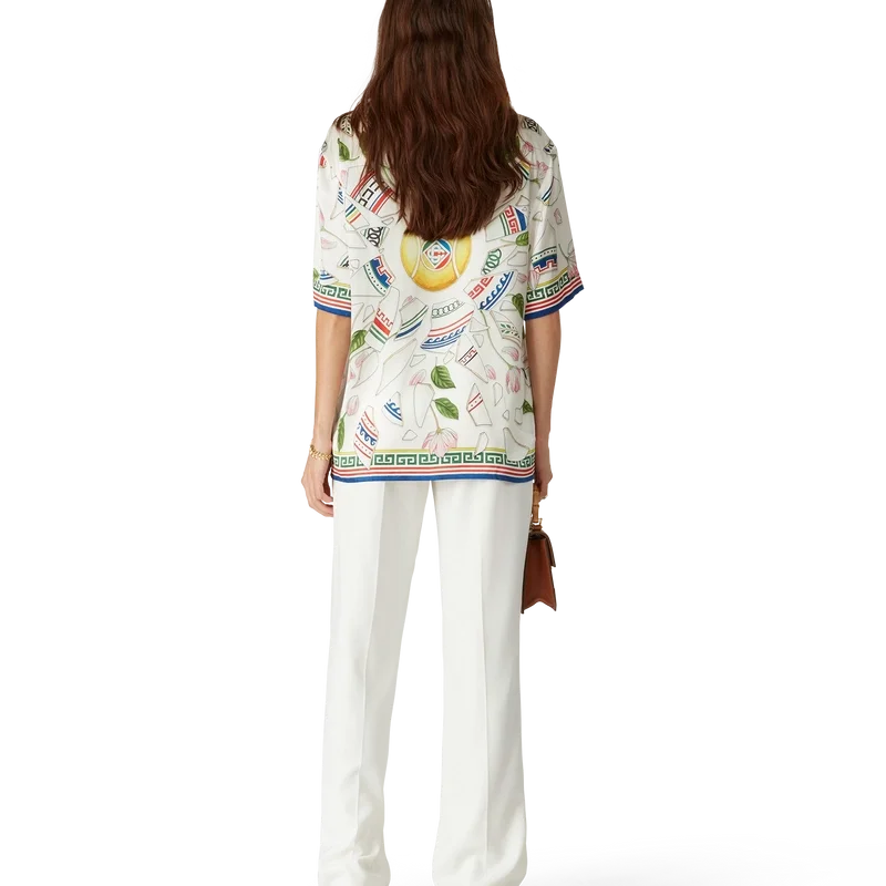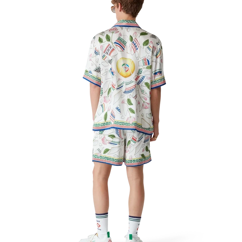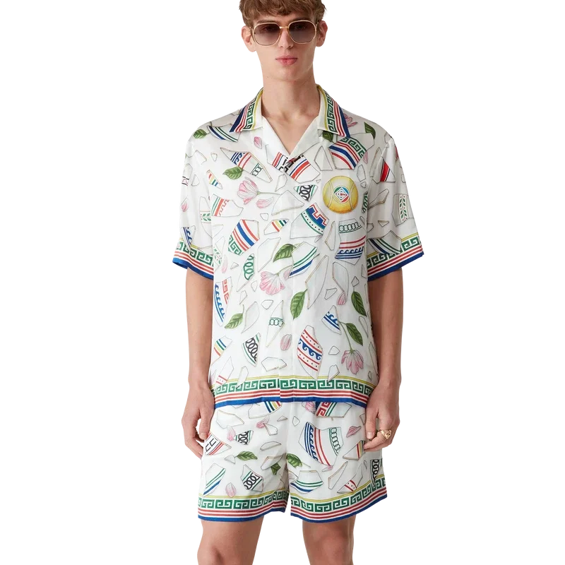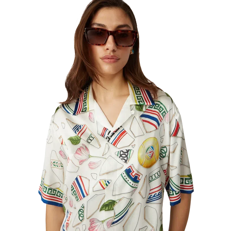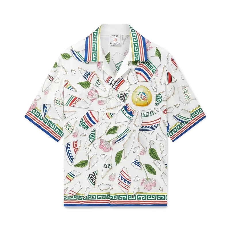 Le Vase Brise-silkeskjortan är en kortärmad skjorta med heltryckt mönster, tillverkad i silkesatintyg med husets säsongsbetonade konstverk som föreställer fragment av en trasig vas. Kompletterad med signaturknappar i corozo med det sammanflätade CC-logotypen, knäppning, kubansk krage och detaljer inspirerade av grekiska nyckelmönster på manschetter, krage och nederkant.