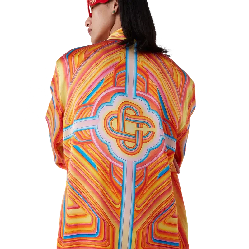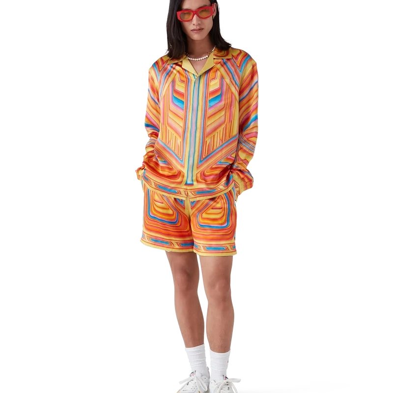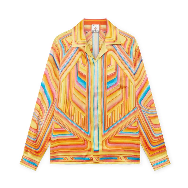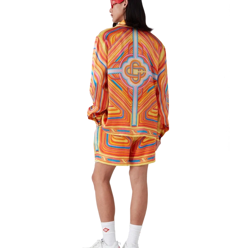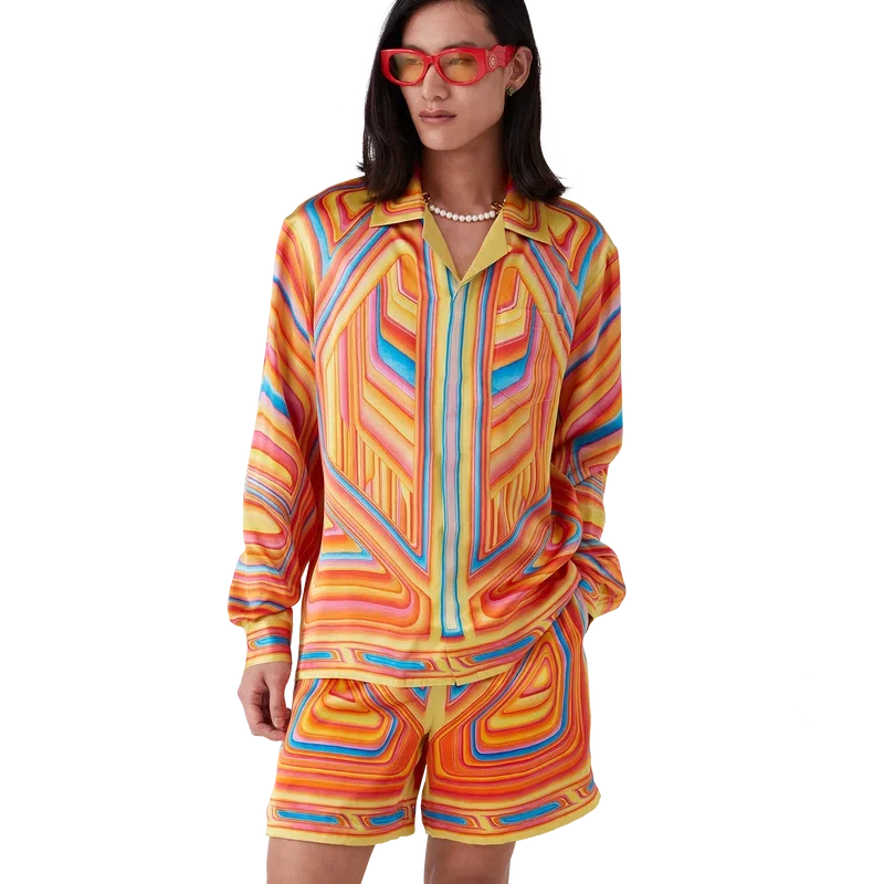 Silkeskjortan Low Rider har ett heltäckande tryck och är tillverkad i silkesatintyg med ett motiv som anspelar på de poppiga färgerna och airbrush-teknikerna som används på Low Rider-bilar, samt Casablanca-logotypen. Den har kubansk krage, bröstficka, dold knäppning med sammankopplade Cc-knappar i corozo samt en emaljknapp med guldkant på varje manschett.