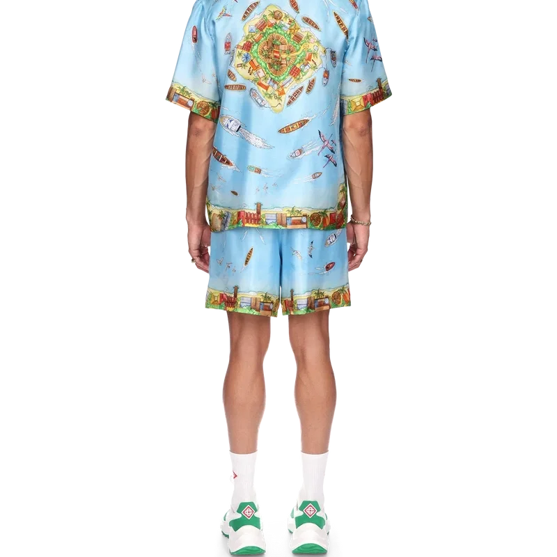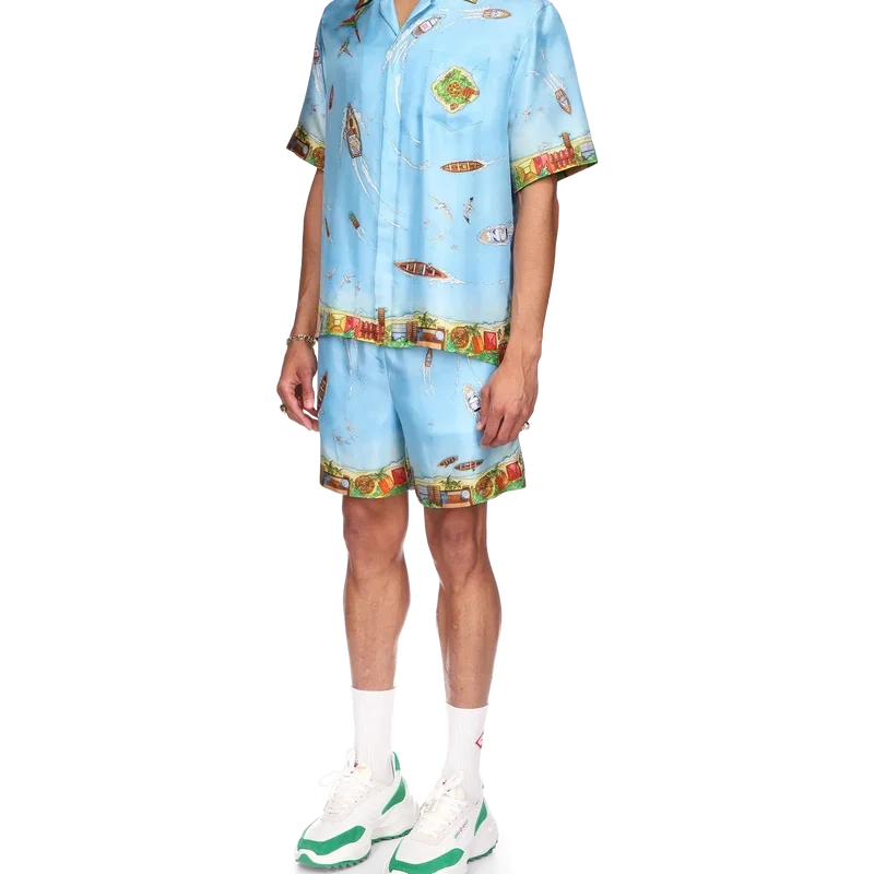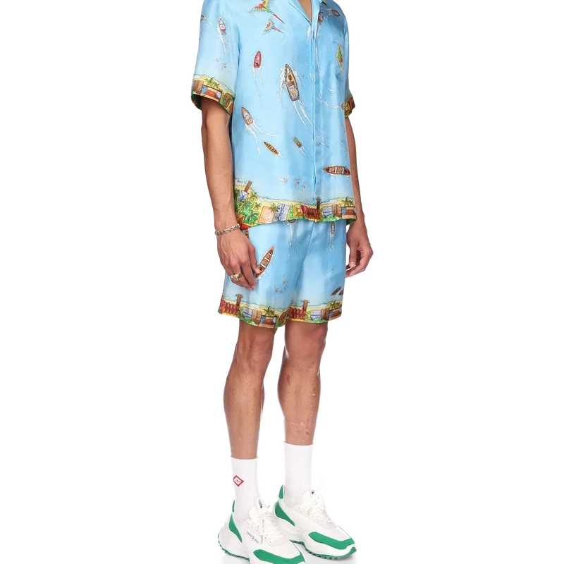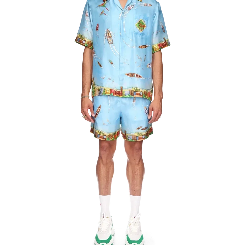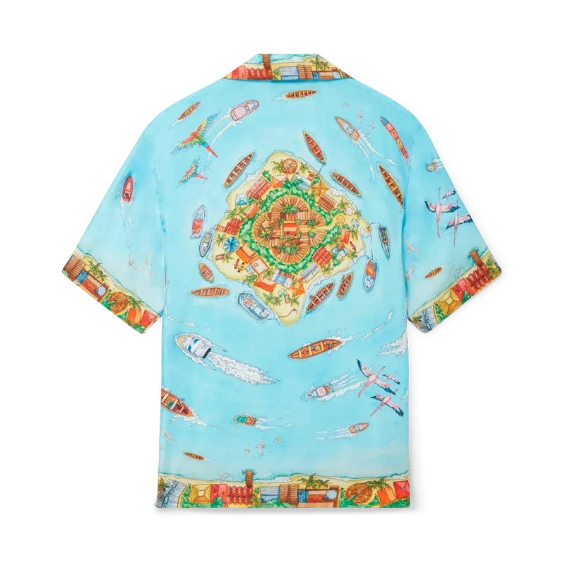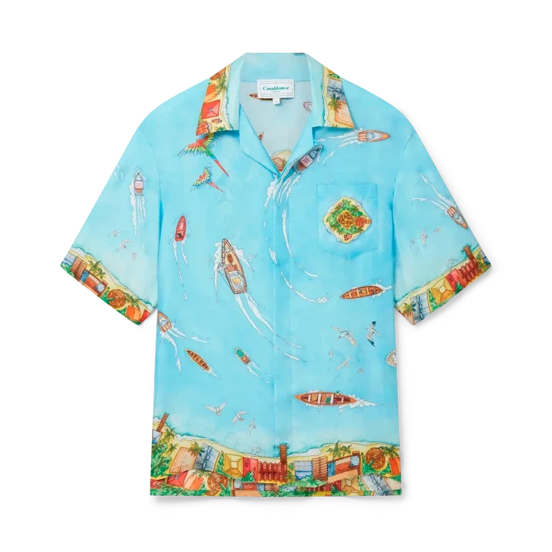 Maison Sur Piloti silkeskjorta är en kortärmad modell med heltryck, inspirerad av vattenbyarna i Lagos, gemenskapen och energin, båtarnas cirkulära rörelser, färgerna och kontrasten mellan trä och vatten. Tillverkad i silketwill och försedd med knäppning, bröstficka och öppen kubansk krage.