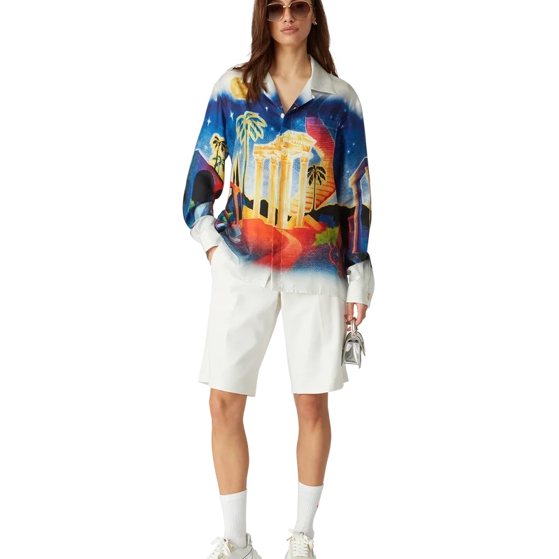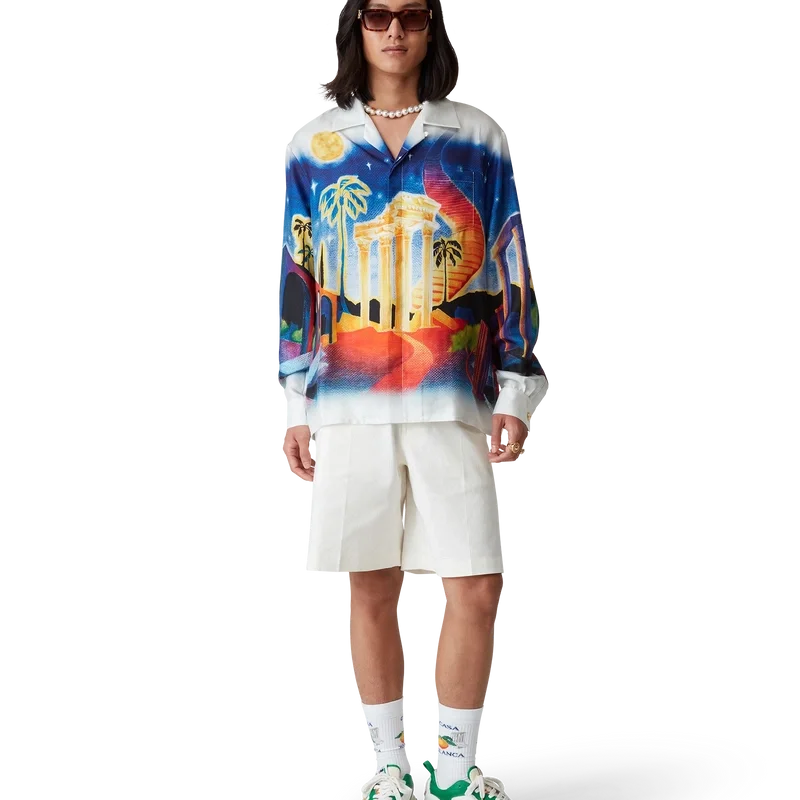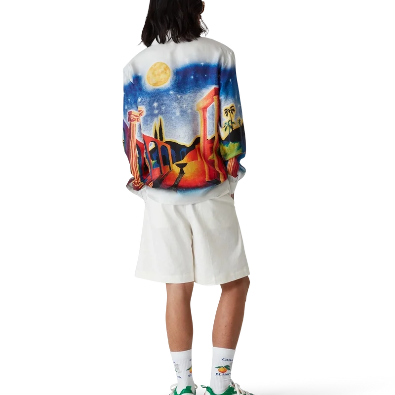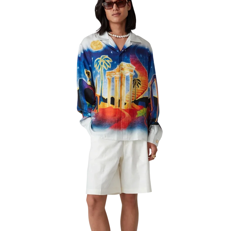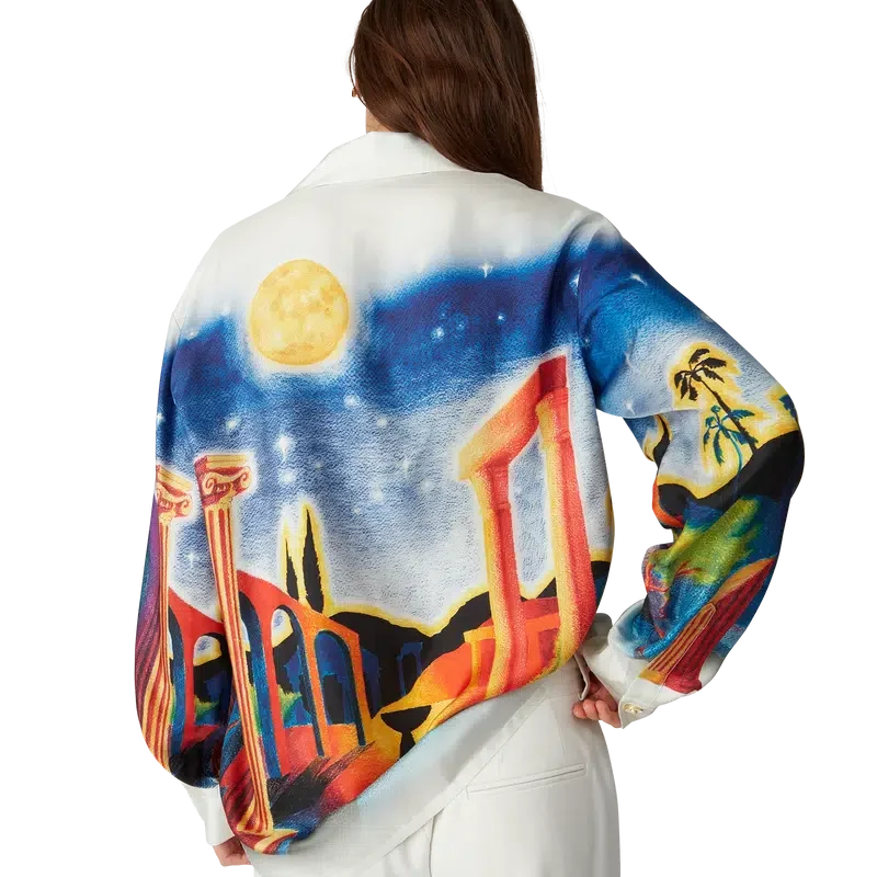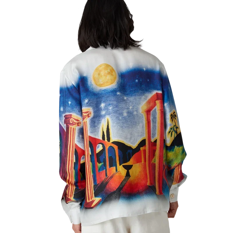 Midnight Acropolis-silkeskjortan är en långärmad skjorta med heltryckt mönster, tillverkad av silkestwill som hyllar den vackra natten i det antika Grekland med det vackra ljuset från templet och himlen. Kompletterad med kubansk krage, guldfärgade emaljknappar på ärmarna och knäppning fram med sammankopplade Corozo-knappar med Cc-märkning.