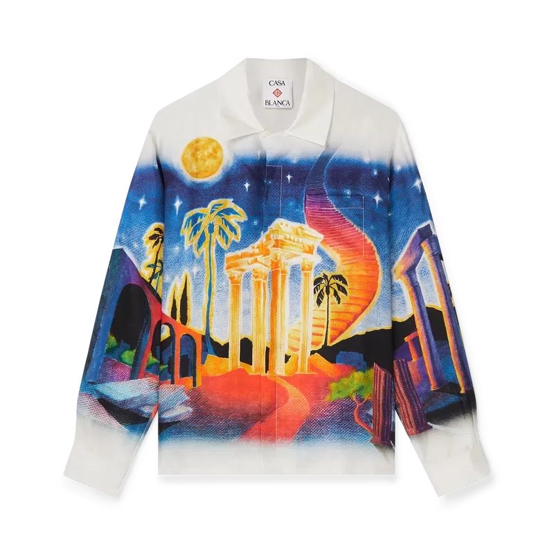 Midnight Acropolis-silkeskjortan med långa ärmar har ett heltäckande tryck och är tillverkad av silketwilltyg som hyllar den vackra natten i det antika Grekland med ljuset från templet och himlen. Den kompletteras med kubansk krage, guldfärgade emaljknappar på ärmarna och knäppning fram med sammanlänkade Cc-märkta corozo-knappar.
