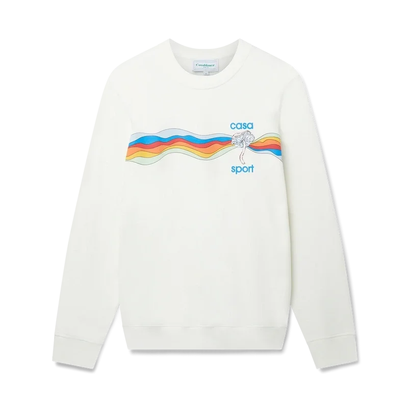 Mind Vibrations-tröjan i ekologisk bomull med screentryck är en unisex-tröja med ett säsongsbetonat motiv inspirerat av jordens läkande kraft och naturens förmåga att läka själen. Komplett med klassisk rund hals, långa ärmar och Casablanca Paris-märkesetikett, designad för en avslappnad passform.
