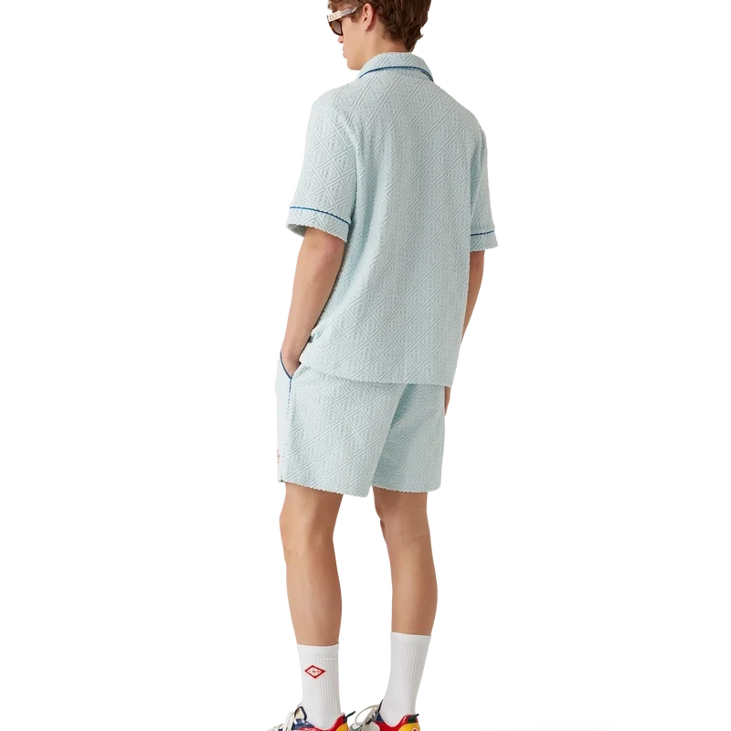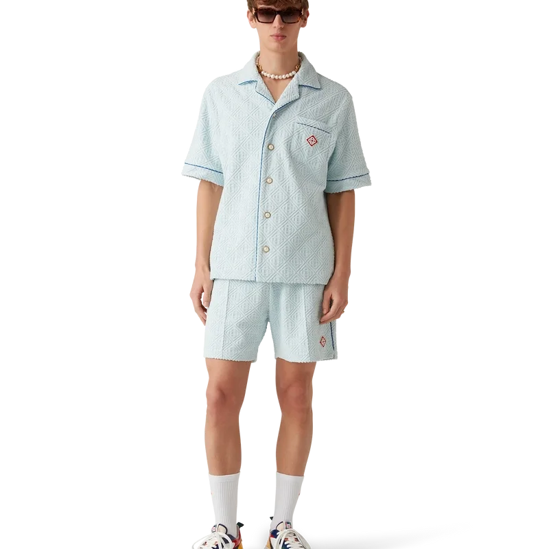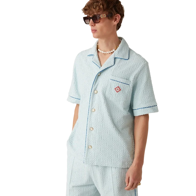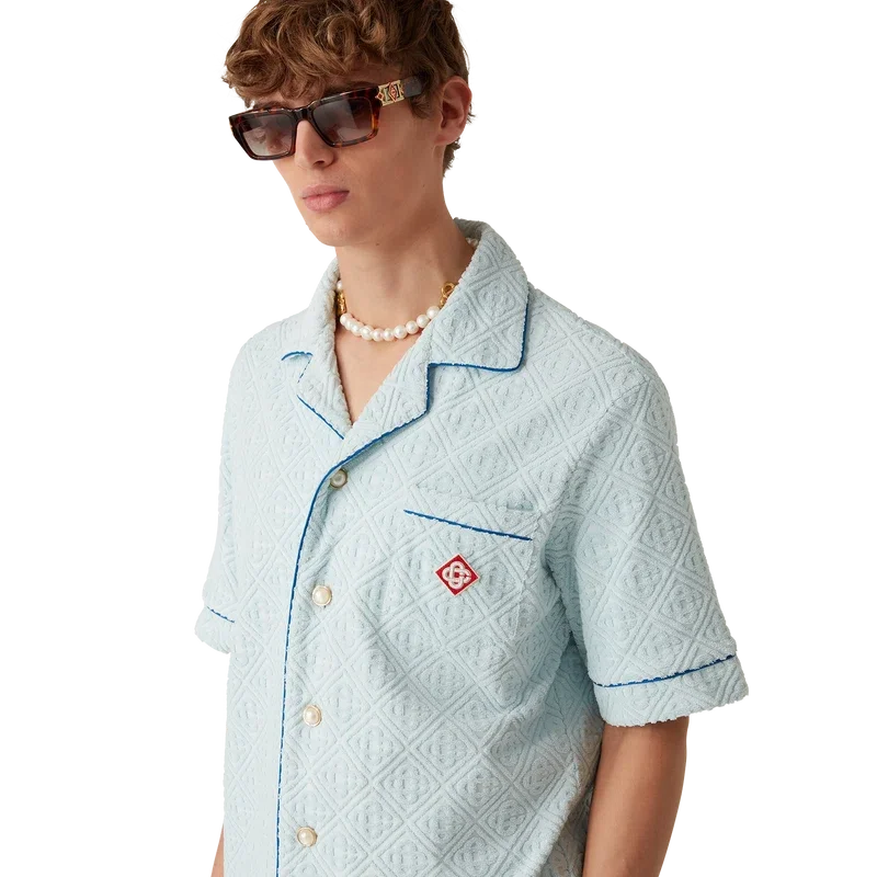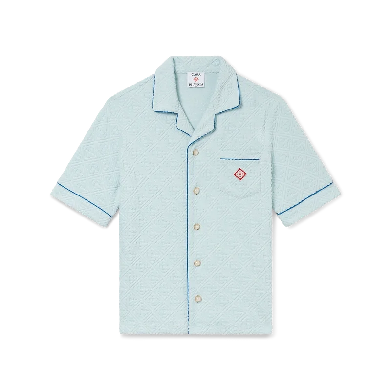 Monogram-frottétröjan är en kortärmad skjorta tillverkad av ett frottétyg i bomullsblandning med monogram och prydd med husets signaturdiamantlogo. Kompletterad med bröstficka, kontrastkant, guldkantade pärlknappar och kubansk krage.