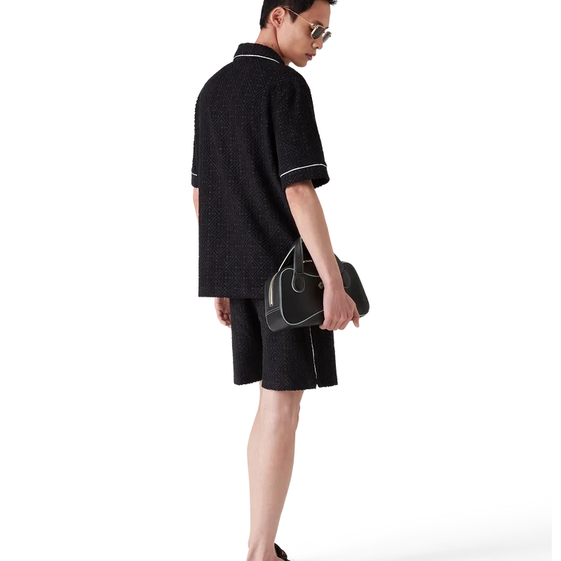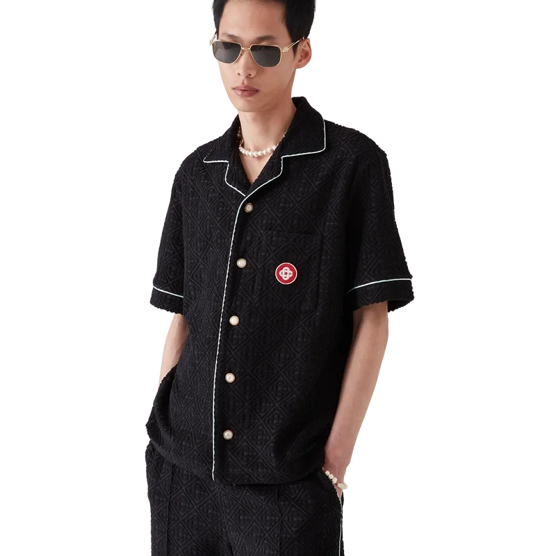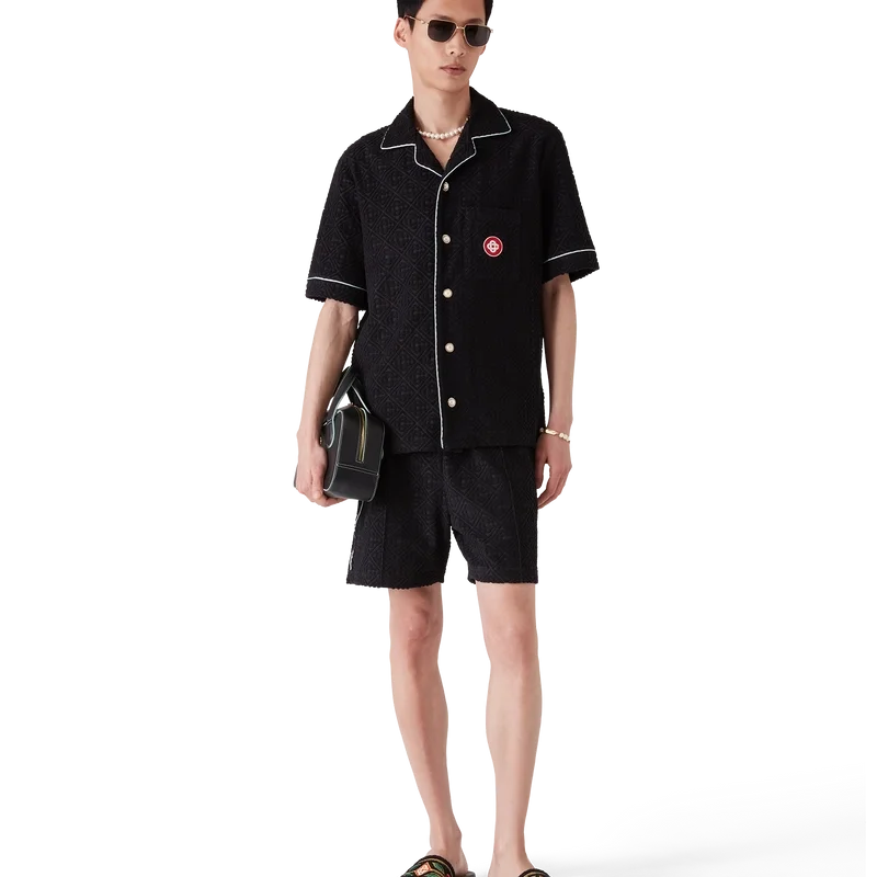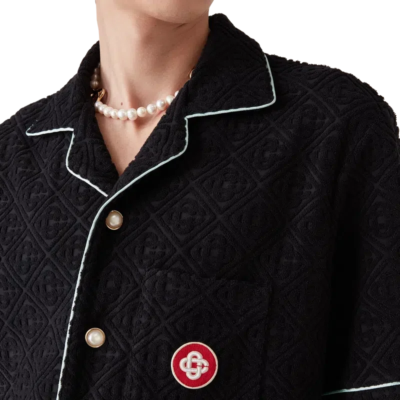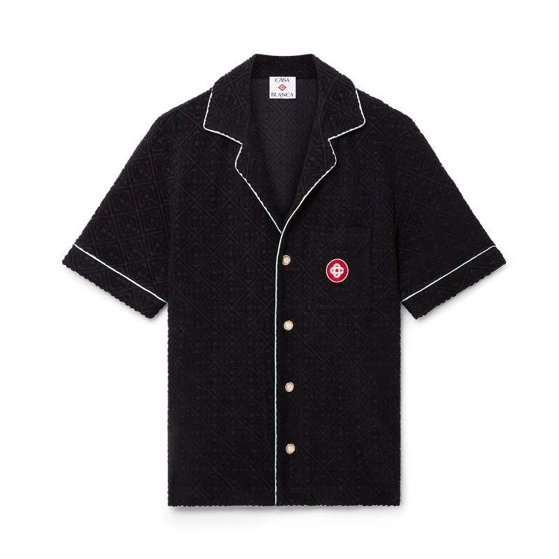 Den kortärmade skjortan i frotté med monogram är en klassisk design tillverkad av ett frottétyg med monogram. Den har knäppning, signaturknappar med guldkant och pärlemor, en bröstficka samt pipingdetaljer på krage, knäppning, manschetter och bröstficka.