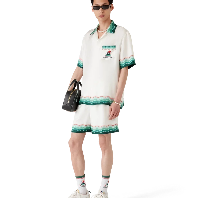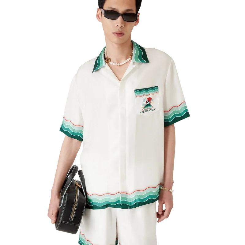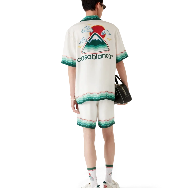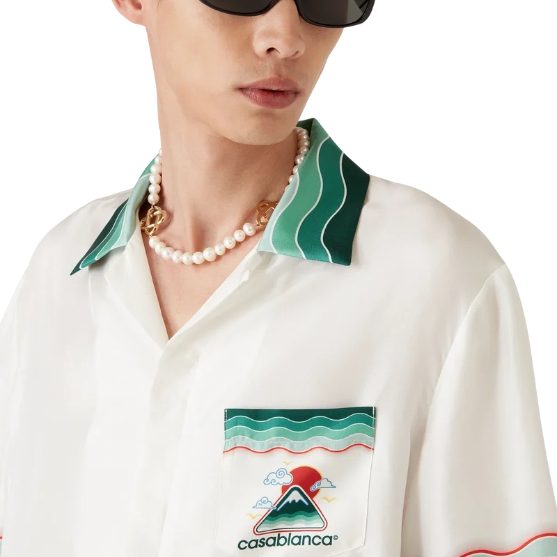 Montagne Ondulee-silkeskjortan är en kortärmad skjorta med heltryckt mönster som visar husets säsongsbetonade konstverk – med inspiration från Japans rika ikonografi för denna kollektion, med en enkel layout och konstverk som förmedlar ett starkt visuellt budskap med bara några få linjer och färger, vilket gör den till ett av kollektionens symboler – tillverkad av silketwill. Kompletterad med kubansk krage, dold knäppning, Corozo-knappar med sammanflätat CC-logo och randiga detaljer inspirerade av Memphis-vågorna på krage, manschetter och nederkant.