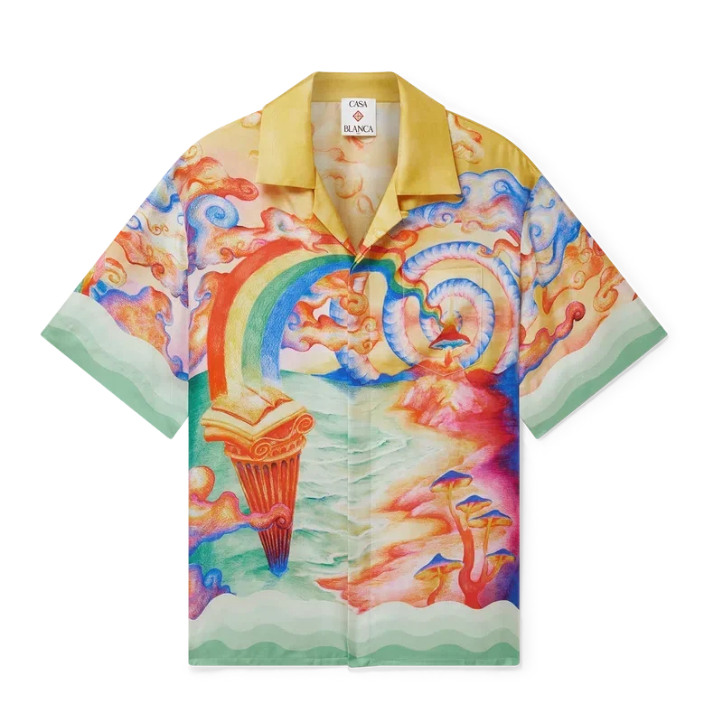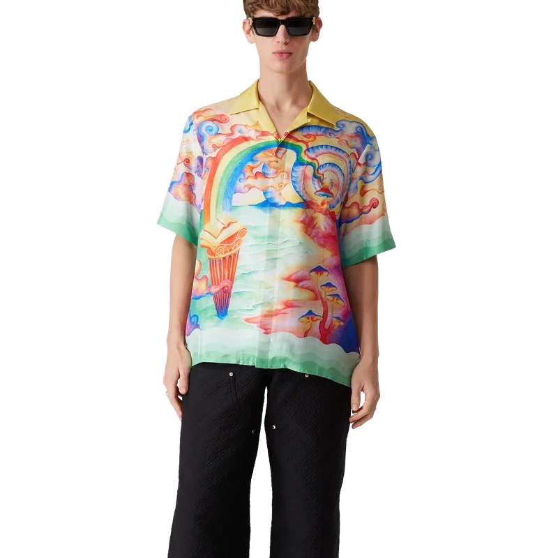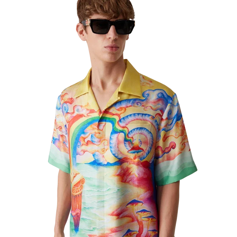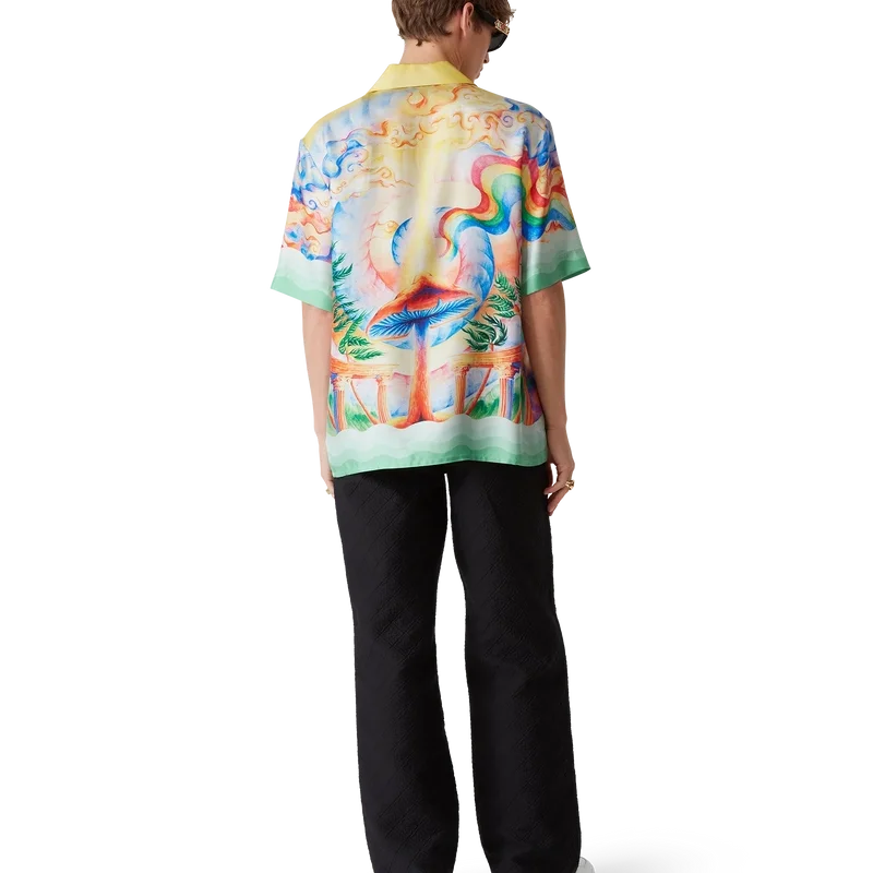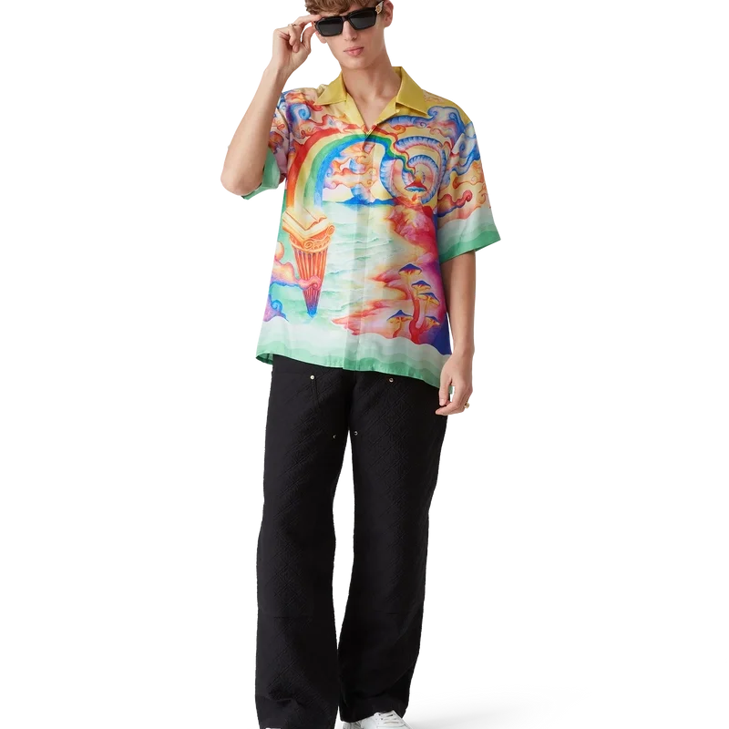 Silkeskjortan ”Nature’s Teacher” är en kortärmad modell med heltryckt mönster, tillverkad i silketwill och prydd med husets säsongsbetonade konstverk, inspirerat av Eleusis-ritualen och temat ”strävan efter kunskap” som präglade förra säsongen. Den kompletteras med signaturknappar i corozo med det sammanflätade CC-logotypen, knäppning, kubansk krage, bröstficka och detaljer i gradient som är inspirerade av Memphis-vågorna på manschetter och nederkant.