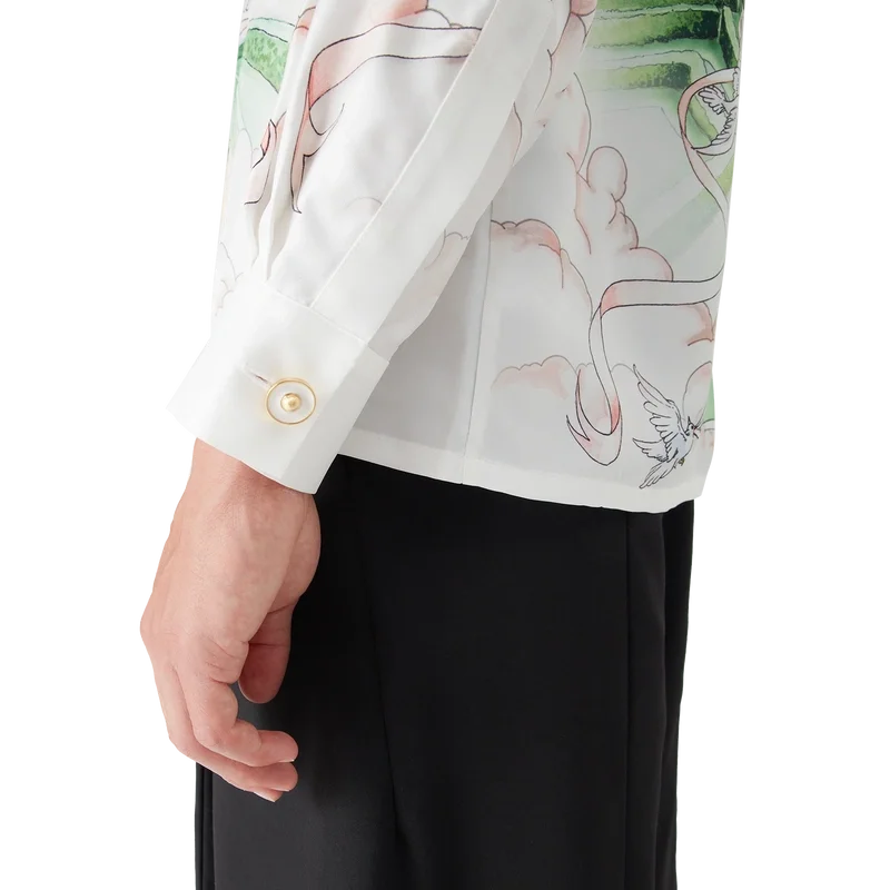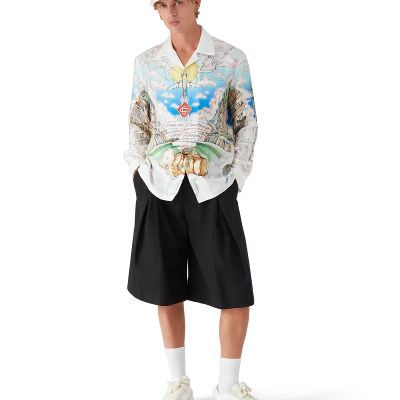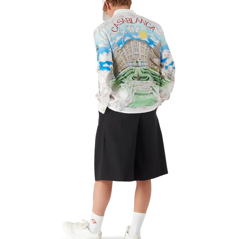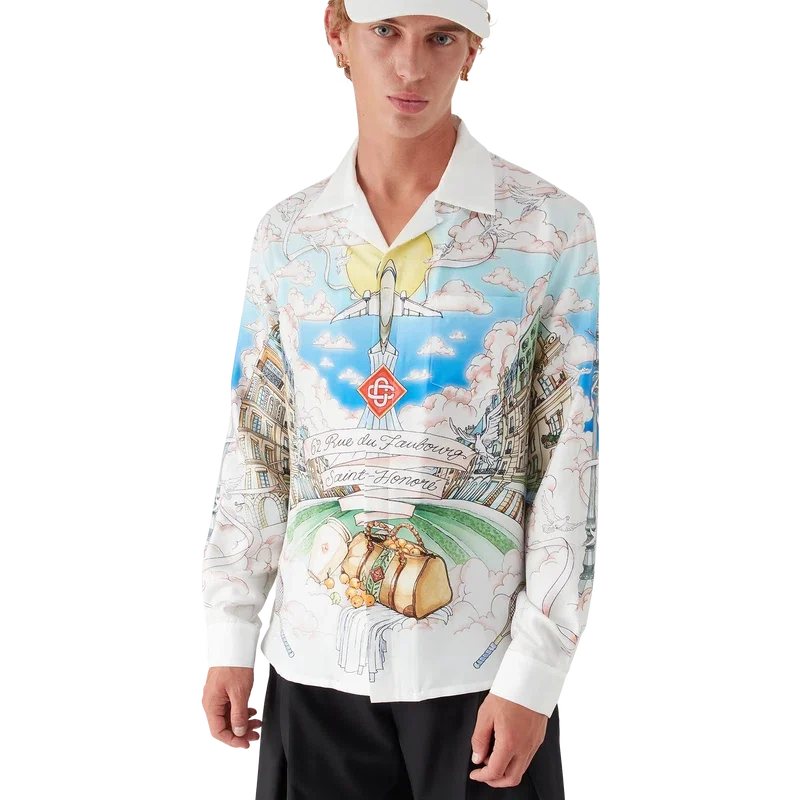 La Vie Parisienne långärmad silkesskjorta är en heltryckt modell, exklusivt designad för vår flaggskeppsbutik, med motiv inspirerade av arkitektur, tennis, natur och resor, som avbildar vår butik i Paris, belägen på Rue Du Faubourg Saint-Honora, en av världens mest historiska gator för mode och design och en symbol för fransk elegans och sofistikation. Kompletterad med kubansk krage, knäppning, Corozo-knappar med sammanflätat CC-logo och emaljknappar med guldkant vid manschetterna. Denna modell finns exklusivt på Casablancaparis.com och i vår butik i Paris.
