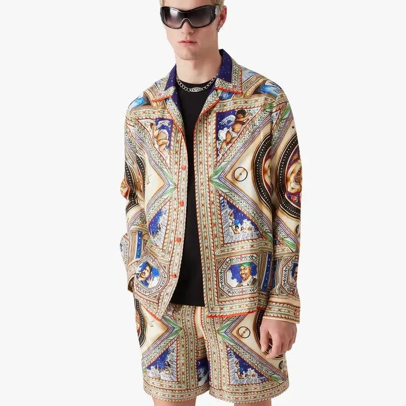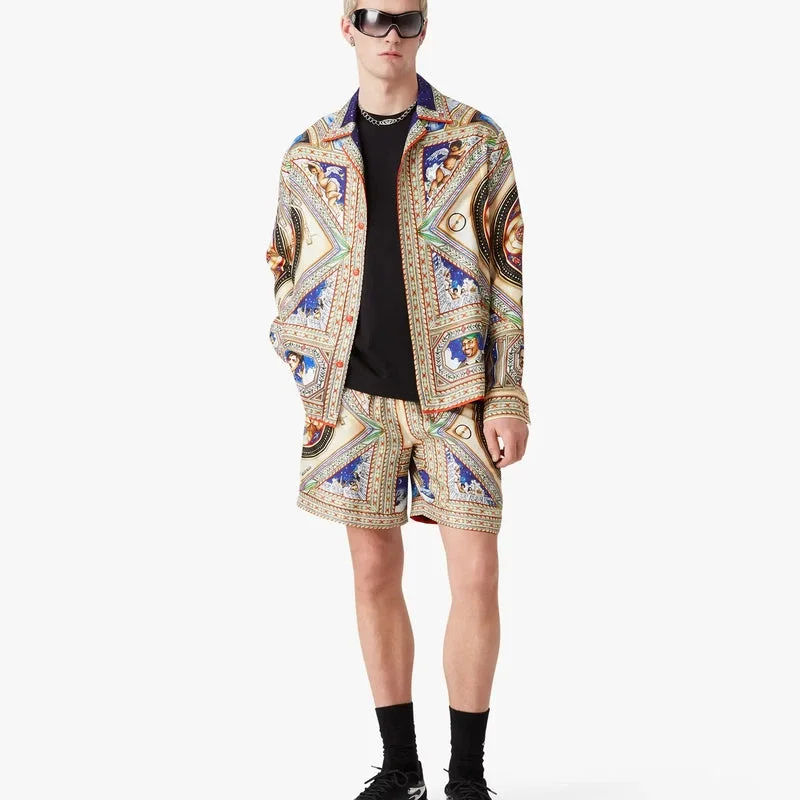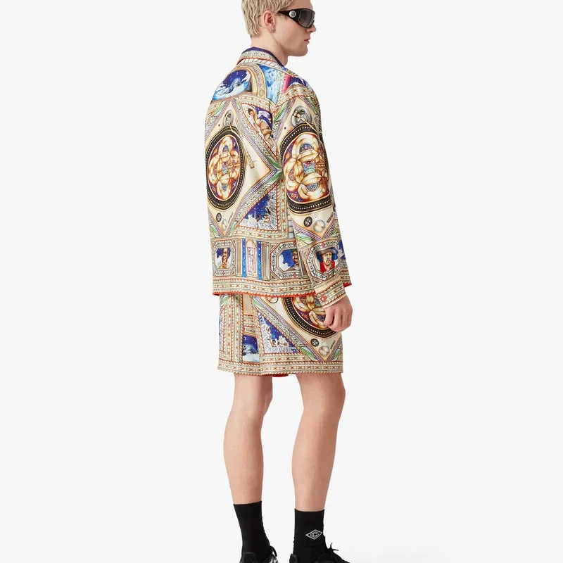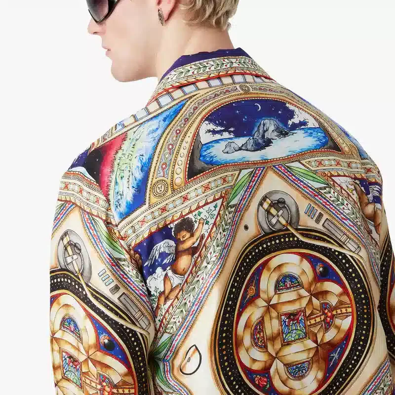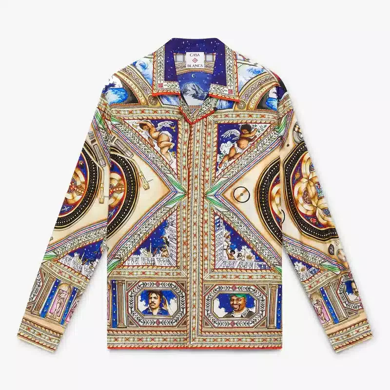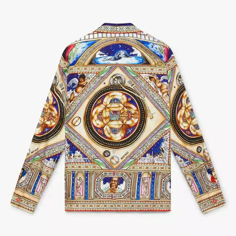 Den långärmade silkesskjortan Plafond Orne De Musique har ett heltäckande tryck med motiv inspirerade av de utsmyckade och intrikata målade renässanstaken som skildrar de tidlösa teman musik och dans. Kompletterad med kubansk krage, knäppning, sammankopplade Cc-logotypknappar i corozo, en bröstficka, husets guldfärgade emaljknappar på manschetterna samt detaljer på krage, knäppning och fåll.