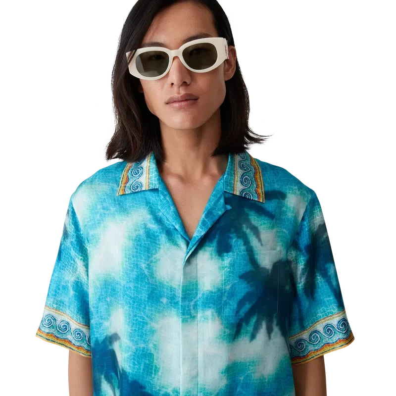 Silkeskjortan med Poolside-emblem har ett heltäckande tryck med handmålade motiv som skapats speciellt för kollektionen och är tillverkad av silketwill. Den har knäppning fram, sammankopplade Cc-logotypknappar i corozo, en bröstficka, kubansk krage och kantdetaljer inspirerade av grekisk mosaik på krage, manschetter och nederkant.