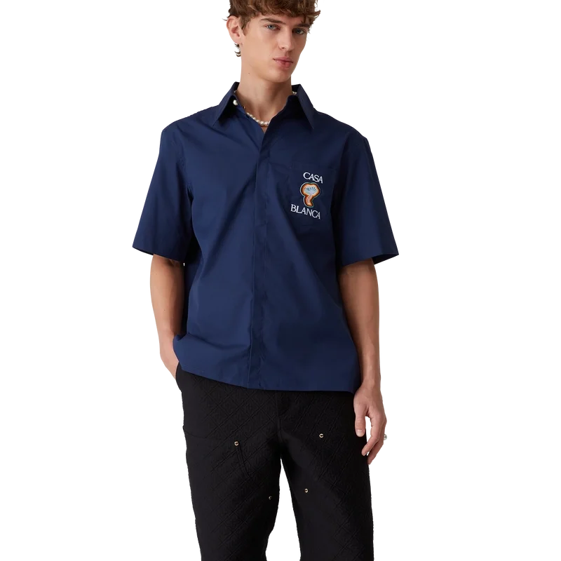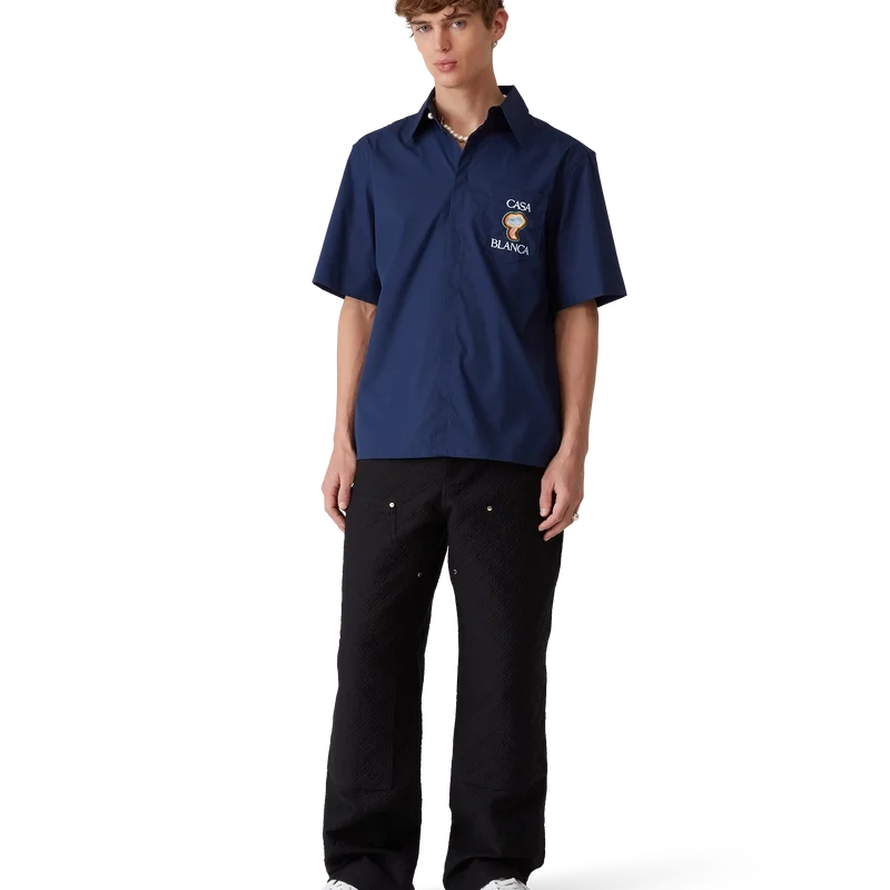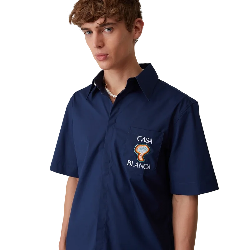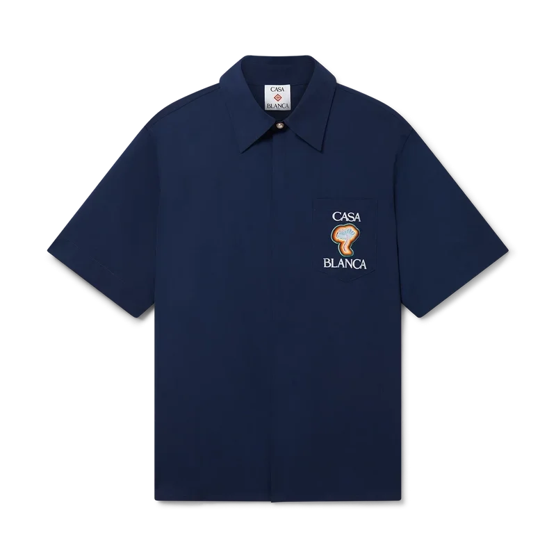 Rainbow Mushroom-skjortan är en kortärmad modell tillverkad av ett polyestermaterial och har säsongsbetonade motiv inspirerade av ett klassiskt designelement – svampen – med flerfärgade kanter. Den kompletteras med en bröstficka, en spetsig krage, en dold knäppning med sammankopplade Cc-logotypknappar i corozo samt märkets signaturknappar med guldkant och pärlemor vid kragen.