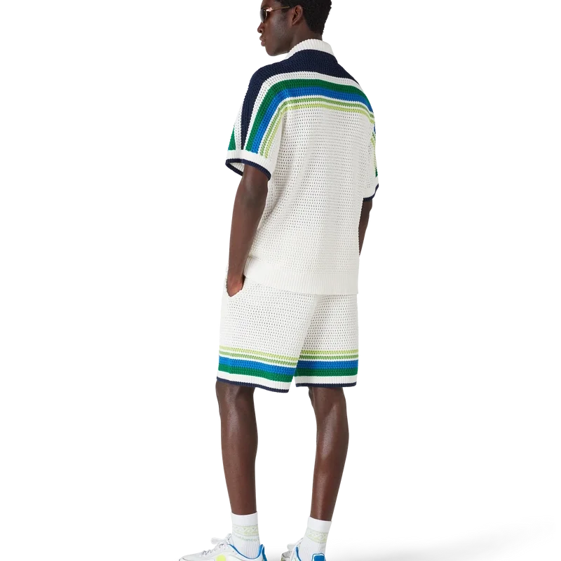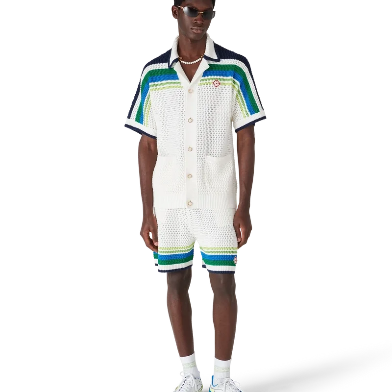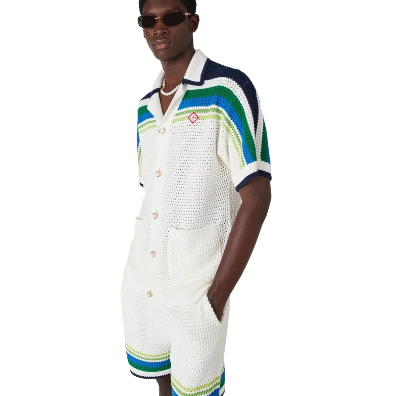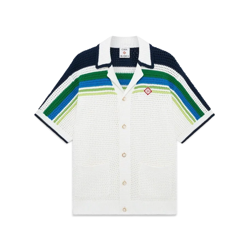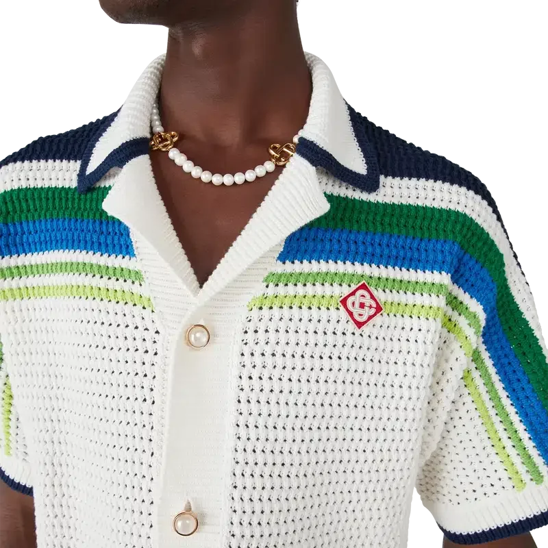 Den randiga stickade skjortan är en elegant bomullsdesign med randiga detaljer över axlarna, bröstet och ärmarna. Kompletterad med ribbad krage, muddar och nederkant, knäppning fram, påsydda fickor fram och signaturknappar med guldkant och pärlor.
