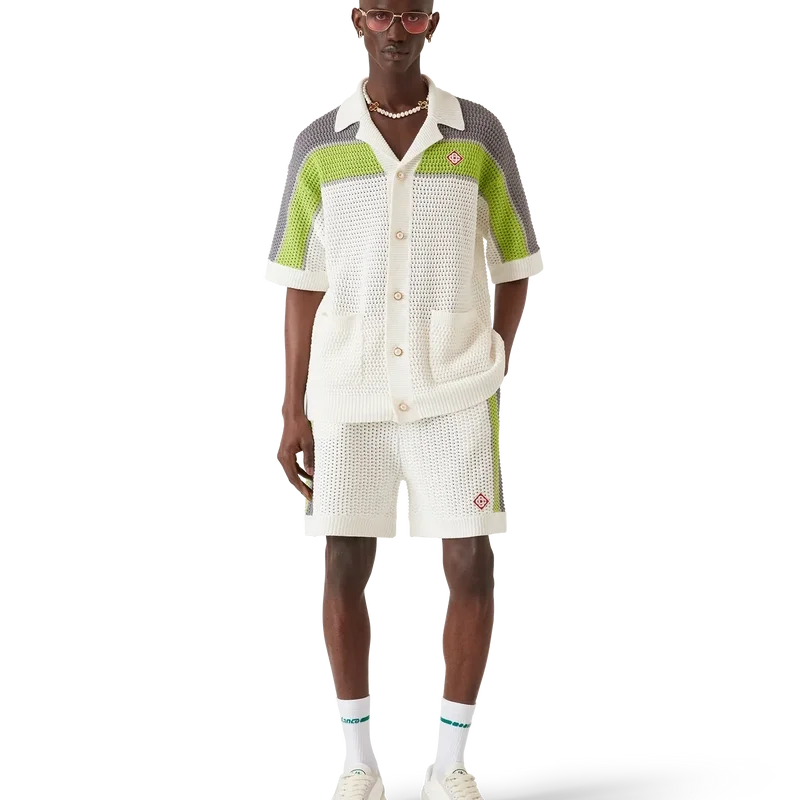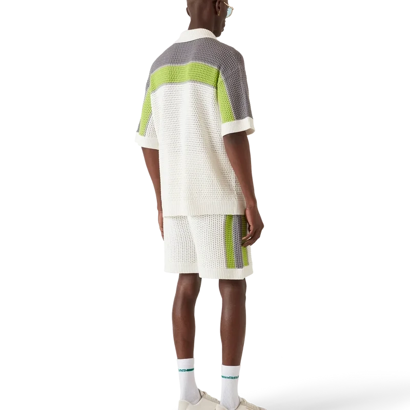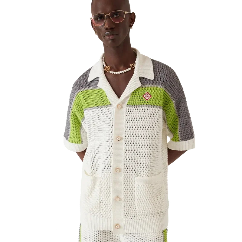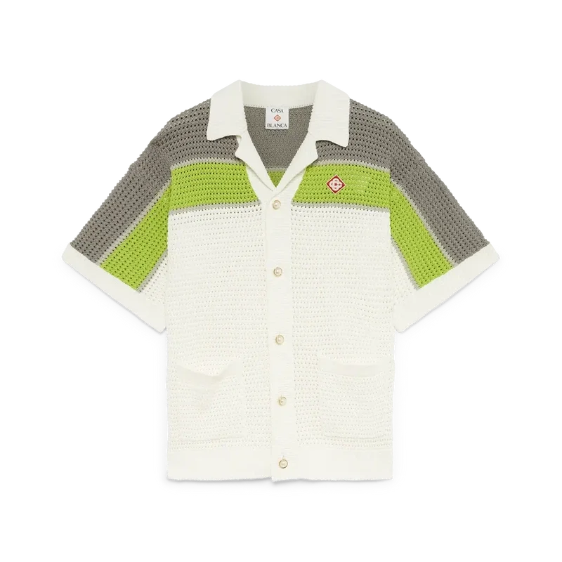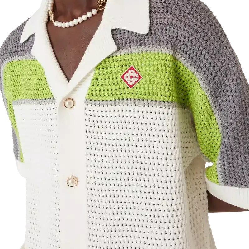 Den randiga virkade skjortan är en raffinerad klassisk design med husets sneda logotyp och randiga detaljer över axlar, bröst och ärmar, i naturliga färger. Avslutad med ribbad krage, manschetter och fåll, knäppning fram, påsydda fickor fram, signaturknappar med guldkant och pärlor samt en avslappnad silhuett.