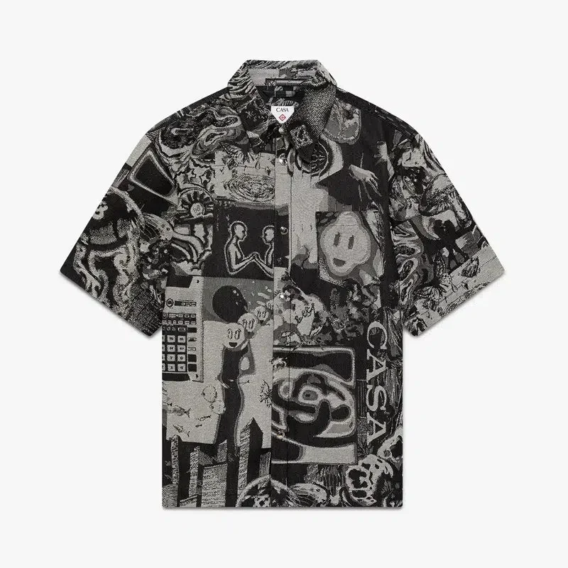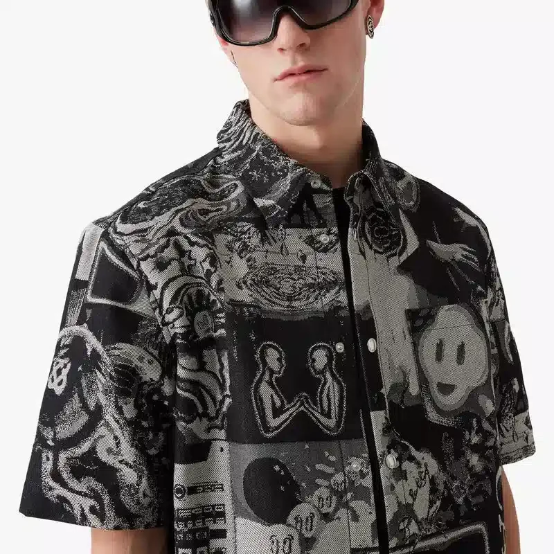 Rave Collage kortärmad denimskjorta är en raffinerad design tillverkad av jacquard-denimtyg, med säsongsanpassade motiv som tolkar en rörig samling rave-flyers och ikonografi omvandlad till en kornig textur genom en jacquard-denimväv. Komplett med kubansk krage, knäppning, silverpläterade knappar och en bröstficka.