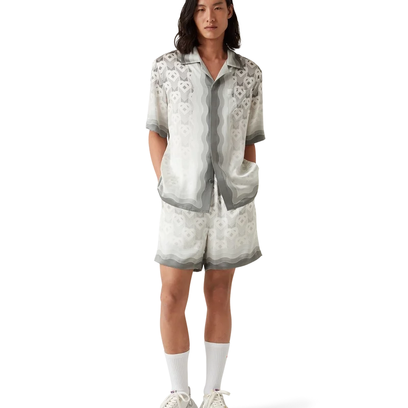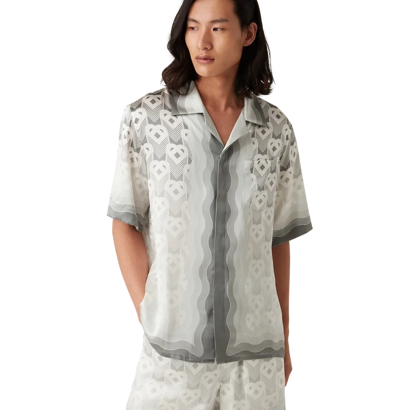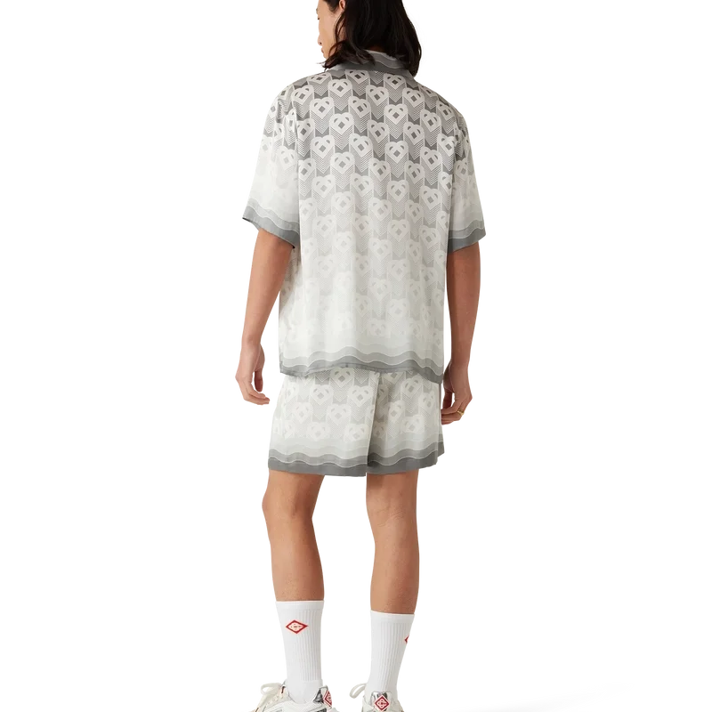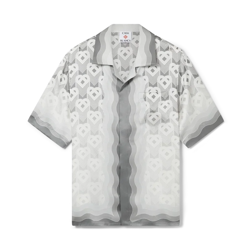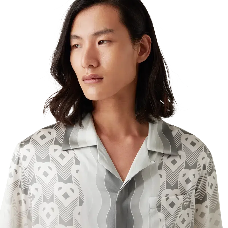 Silkeskjortan med hjärtmonogram i gradient är ett heltäckande tryckt mönster med husets hjärtmonogram på säsongens silverfärgade gradientbakgrund. Tillverkad av ett monogramtyg i silkesatin och avslutad med krage, bröstficka samt krage, manschetter, fåll och knäppning med gradientdetaljer inspirerade av Memphis-vågen.