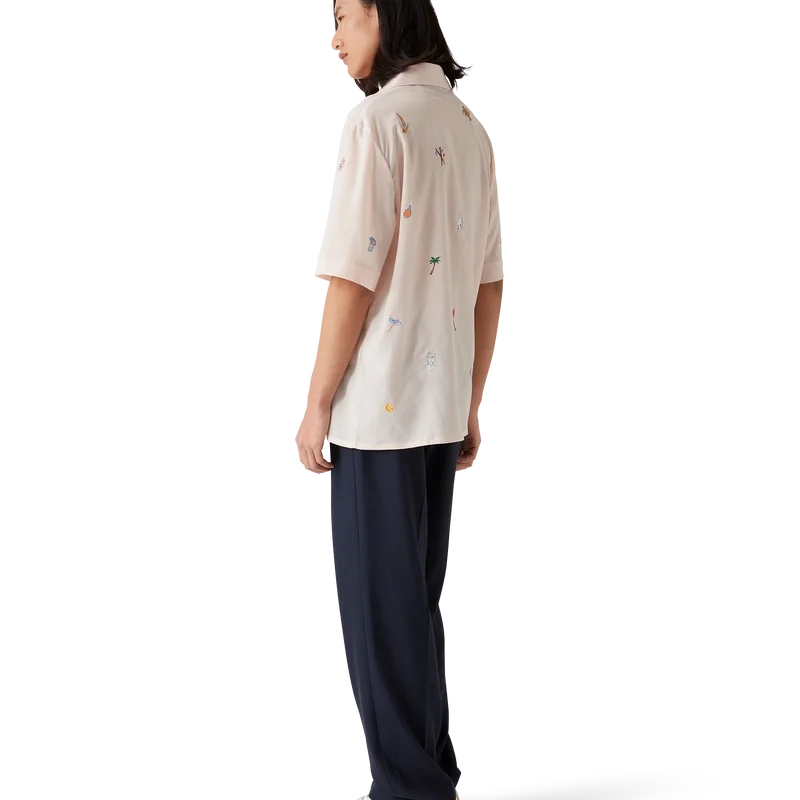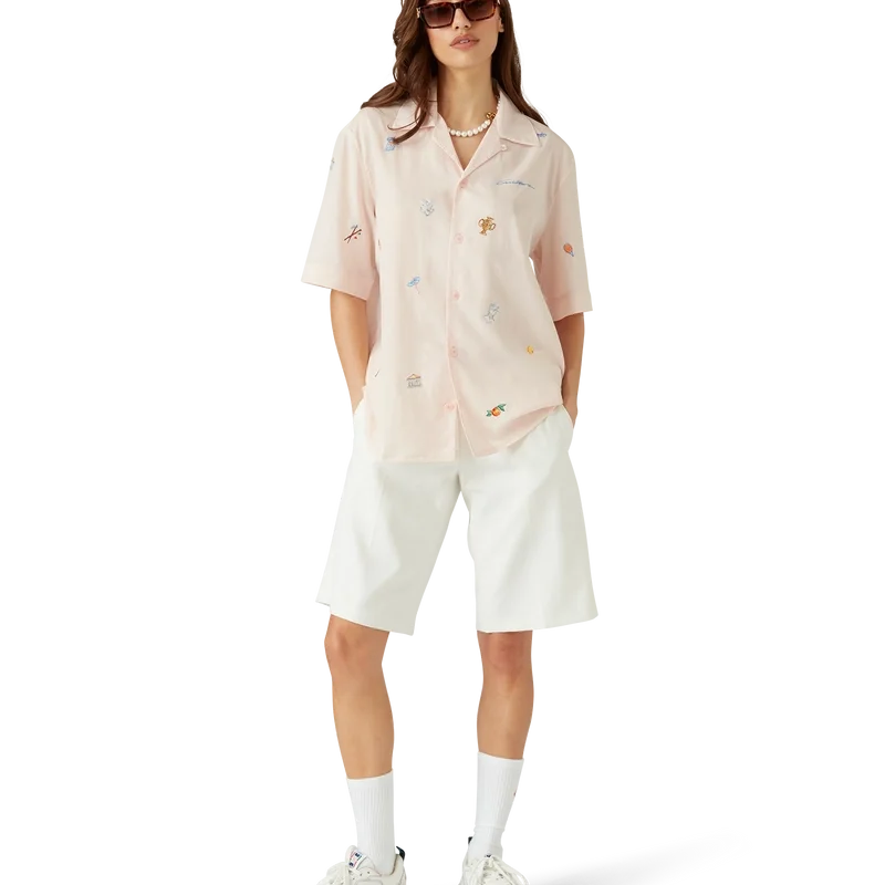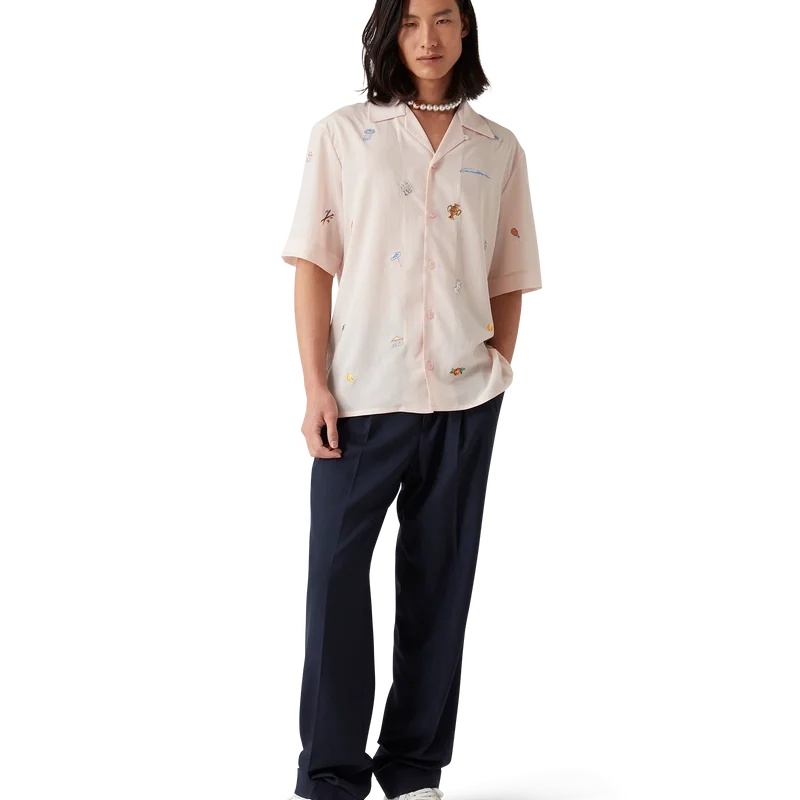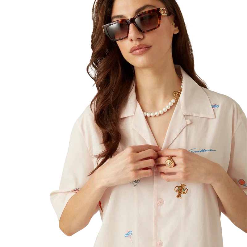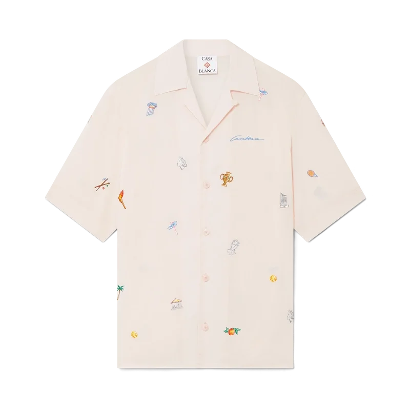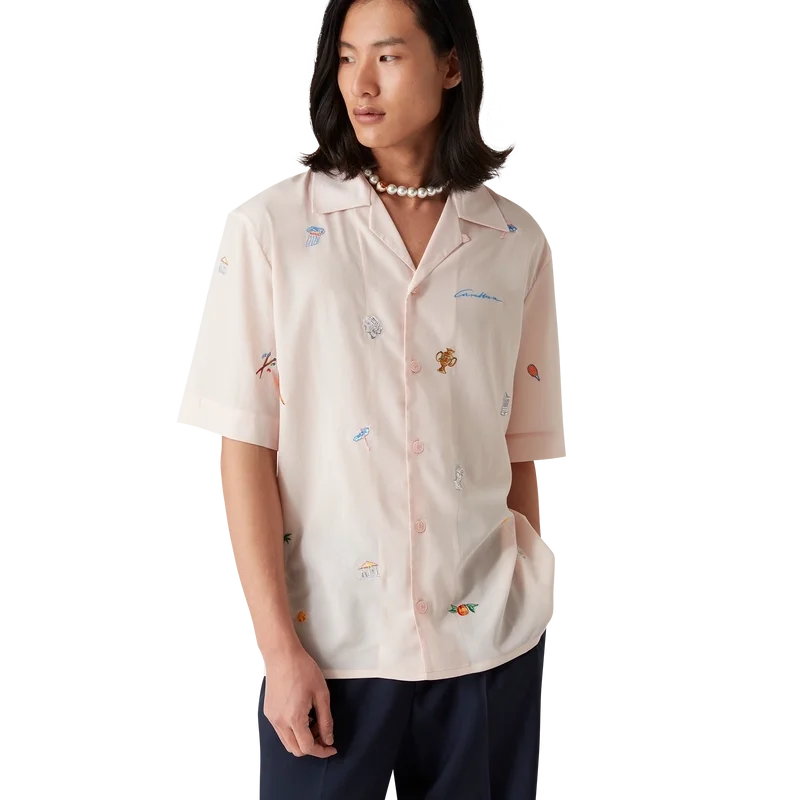 Skjortan med broderat motiv är en kortärmad modell tillverkad av ett broderat tyg med broderade motiv som representerar husets symbolik med natur, tennis och arkitektur. Avslutas med knäppning, sammanlänkade CC-logotypknappar i corozo och en kubansk krage.