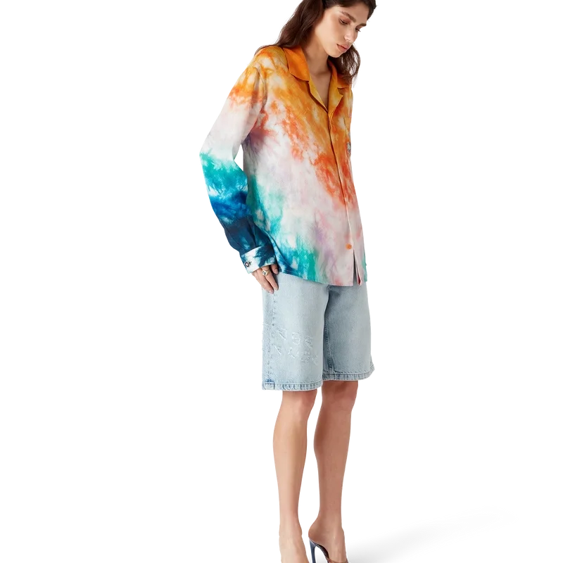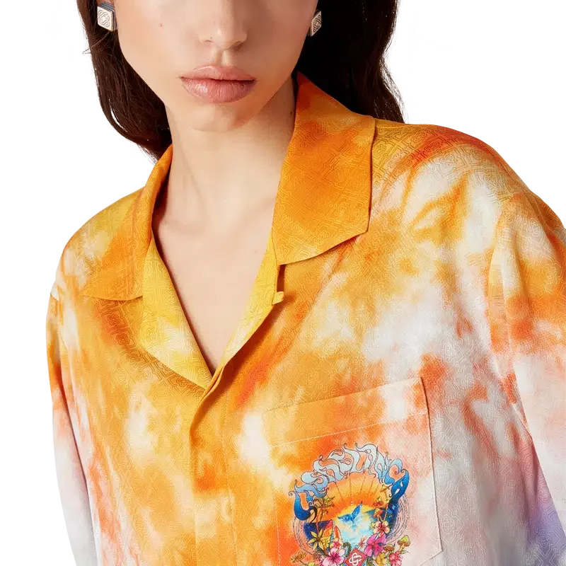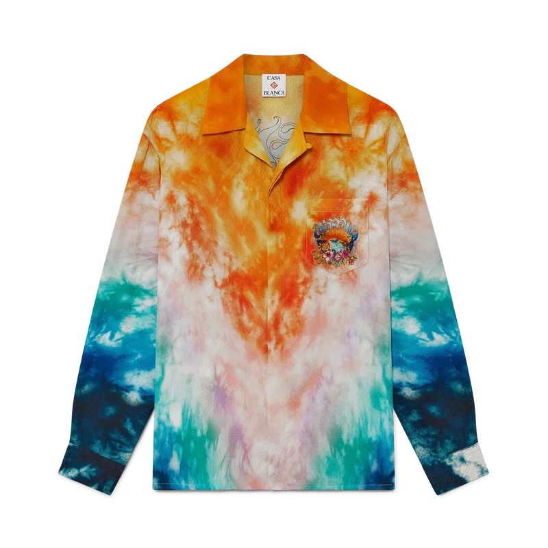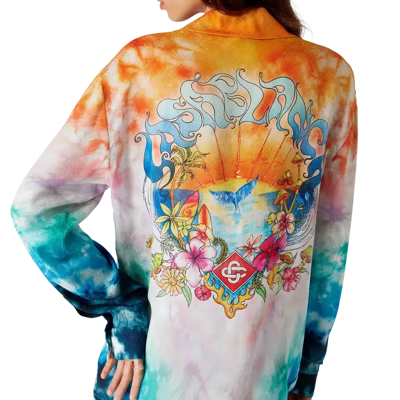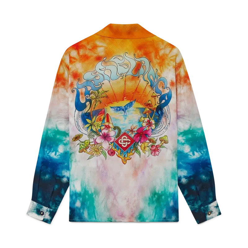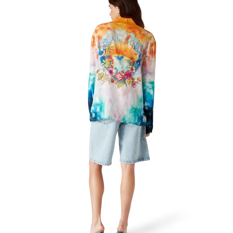 Surf Trip långärmad silkesskjorta är ett tryckt mönster tillverkat av silkesväv med säsongsbetonade motiv inspirerade av den klassiska surfkulturen i Malibu, med typografi från den tiden på en tie-dye-bakgrund som anspelar på hippiekulturen. Avslutas med kubansk krage, dold knäppning, sammankopplade Cc-logotypknappar i corozo och guldkantade emaljknappar på manschetterna.