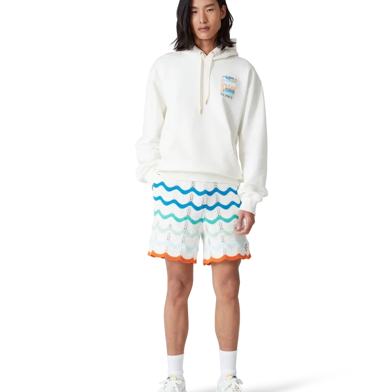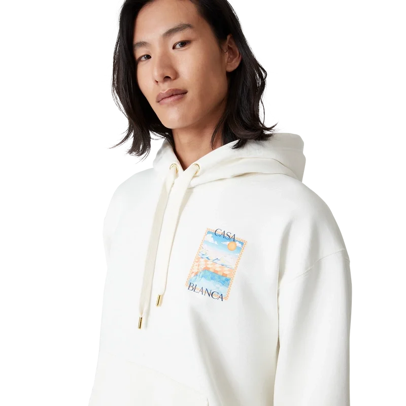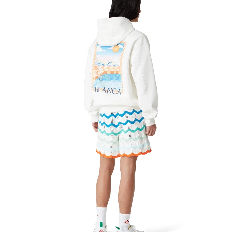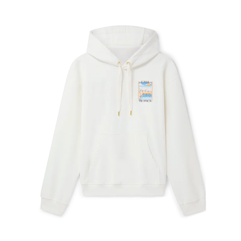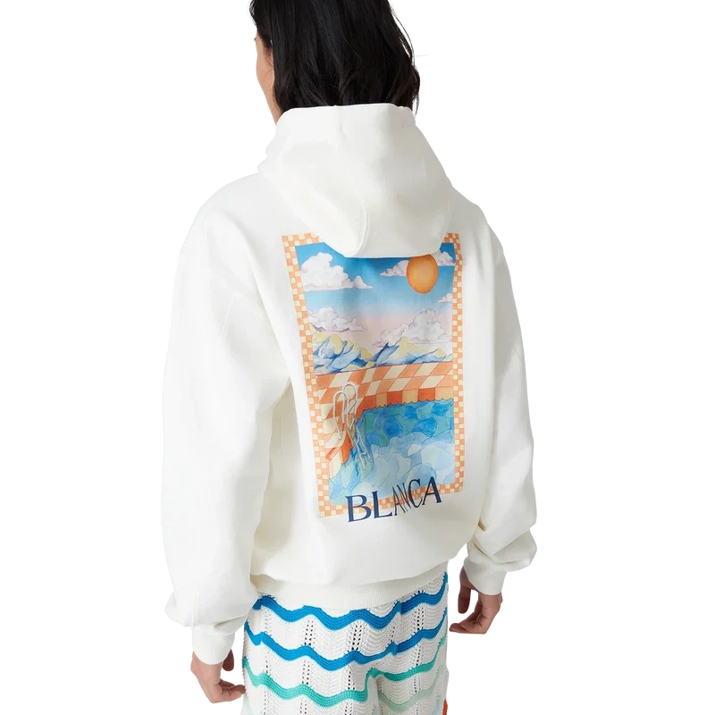 Huvtröjan ”Surreal Pool” är en klassisk långärmad modell tillverkad av ekologisk bomull med handmålade motiv som skapats speciellt för kollektionen. Den har huva, dragsko med gulddetaljer samt ribbade muddar, krage och nederkant.