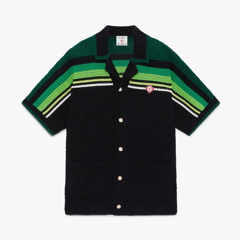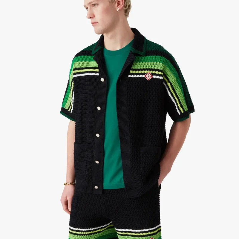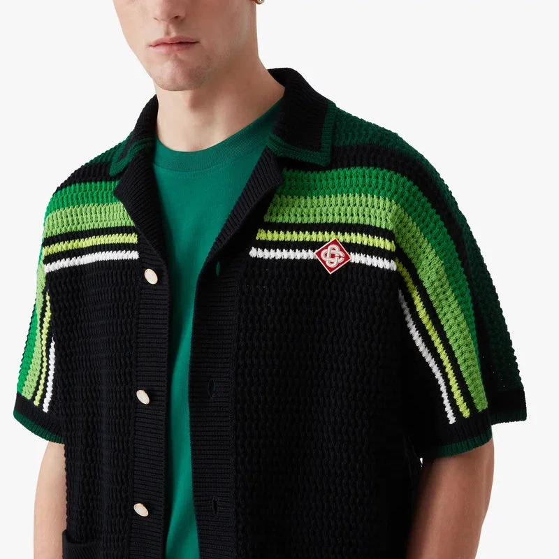 Den svart- och grönrandiga kortärmade skjortan har en raffinerad virkad design med husets signaturdiamantlogo och gröna och limegröna randdetaljer över axlar, bröst och ärmar. Avslutas med ribbad krage, manschetter och nederkant, knäppning fram, påsydda fickor fram och signaturknappar med guldkant och pärlor.