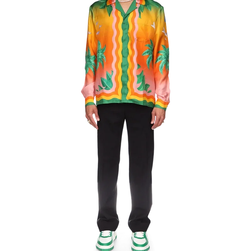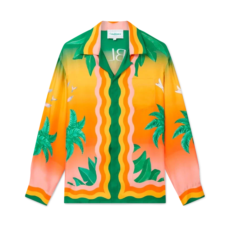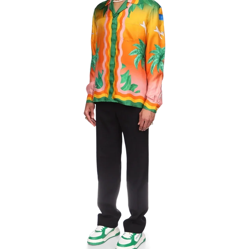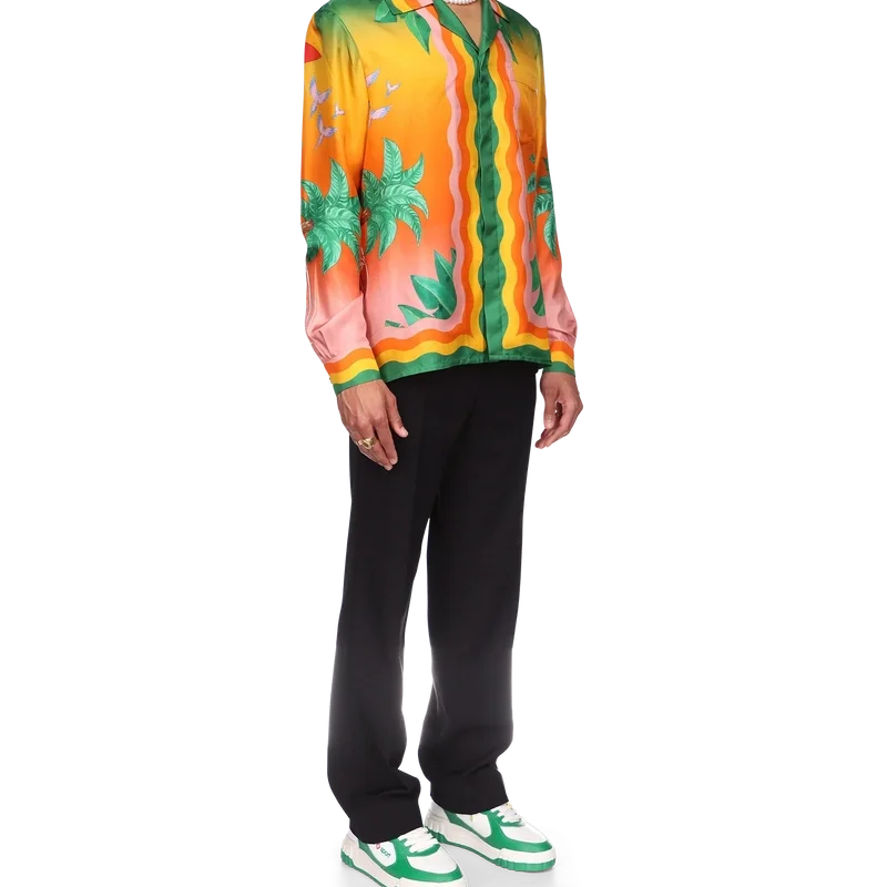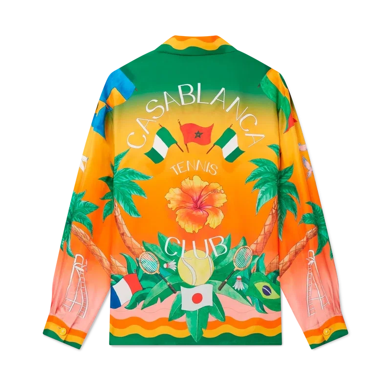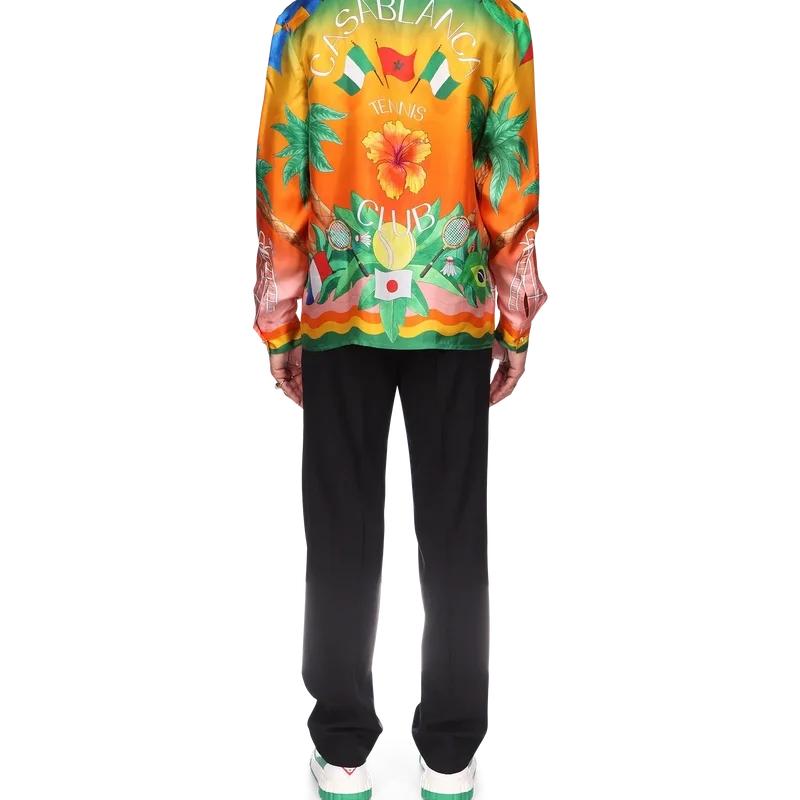 Tennis Club En Fleur-silkes skjortan är en långärmad modell med heltryckt mönster som innehåller husets numera signaturmönster med färgövergångar som återkommer i nya färgställningar inspirerade av Nigeria, med centrala designelement som en hibiskusblomma på ryggen. Kompletterad med husets Memphis-inspirerade detaljer på kragen, manschetterna, fållen och knäppningen samt guldkantade pärlknappar.<!–