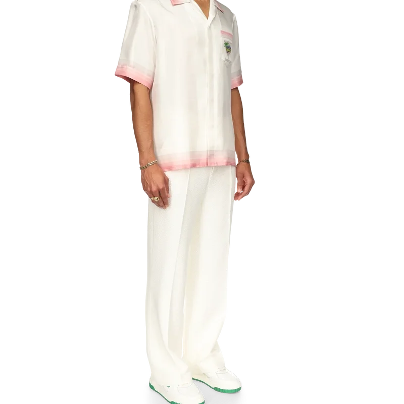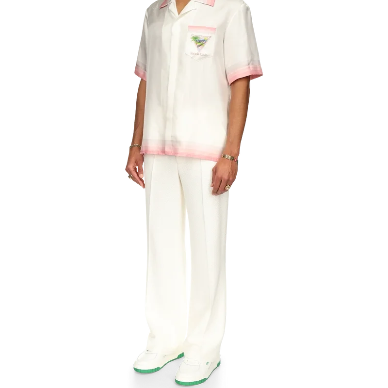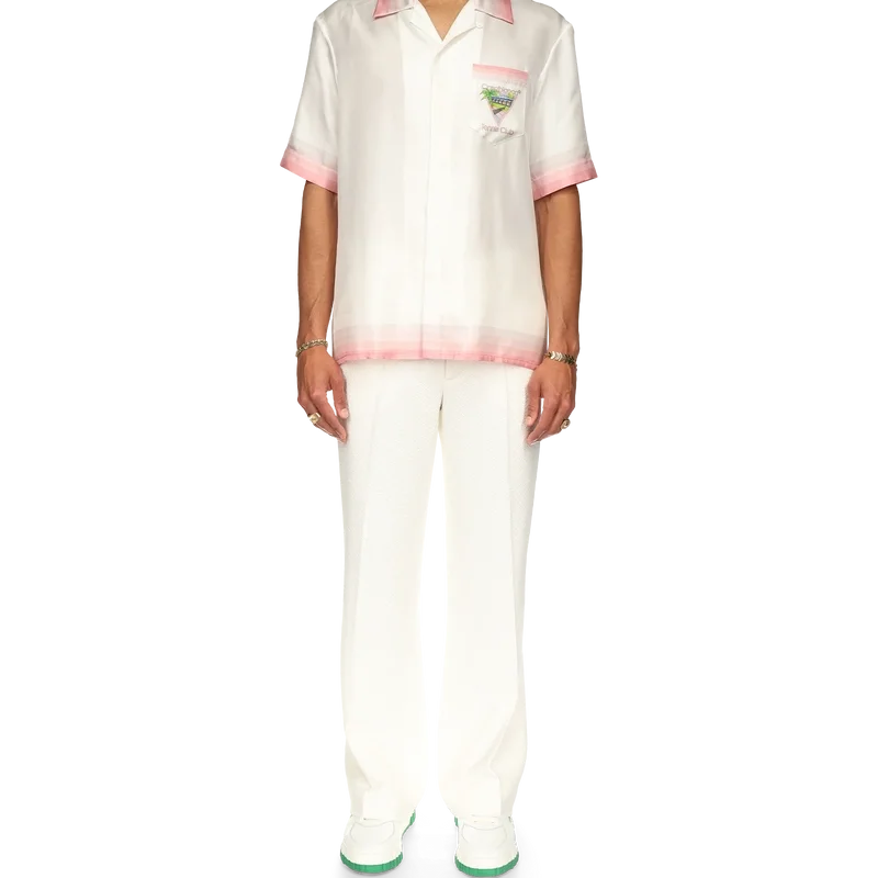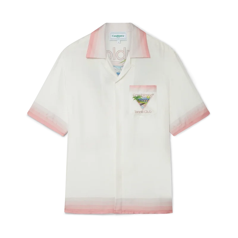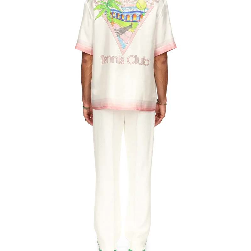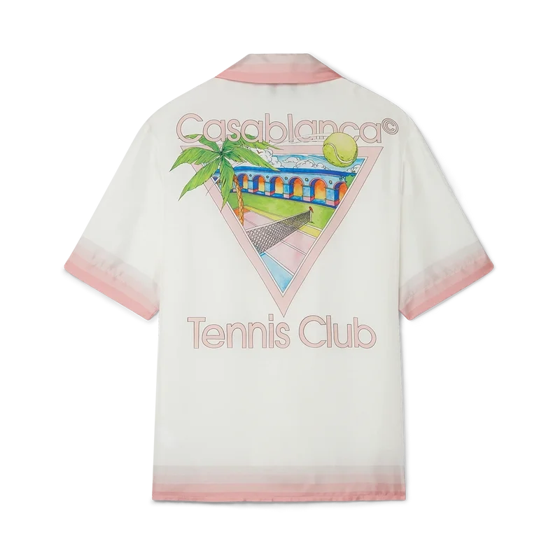 Tennis Club Icon-silkeskjortan är en kortärmad skjorta med tryck som visar husets signaturmotiv, omtolkat för denna säsong med inslag av tennis, natur och arkitektur. Denna skjorta är tillverkad i silkesatintyg och har detaljer i form av randiga gradienter på kragen, manschetterna, nederkanten och bröstfickan, knäppning med knappar samt en etikett med Casablanca-logotypen – designad för en avslappnad passform.
