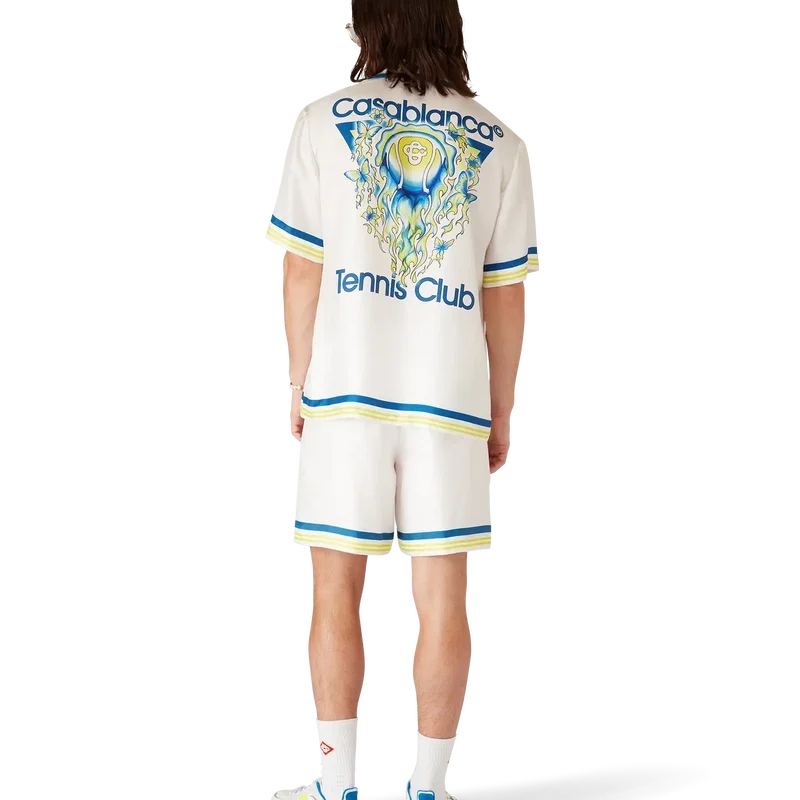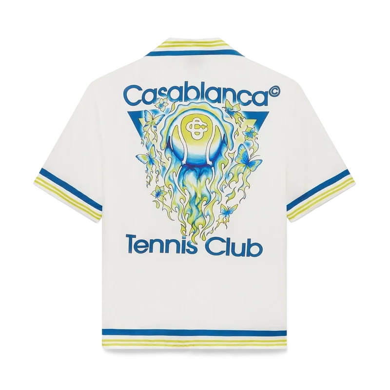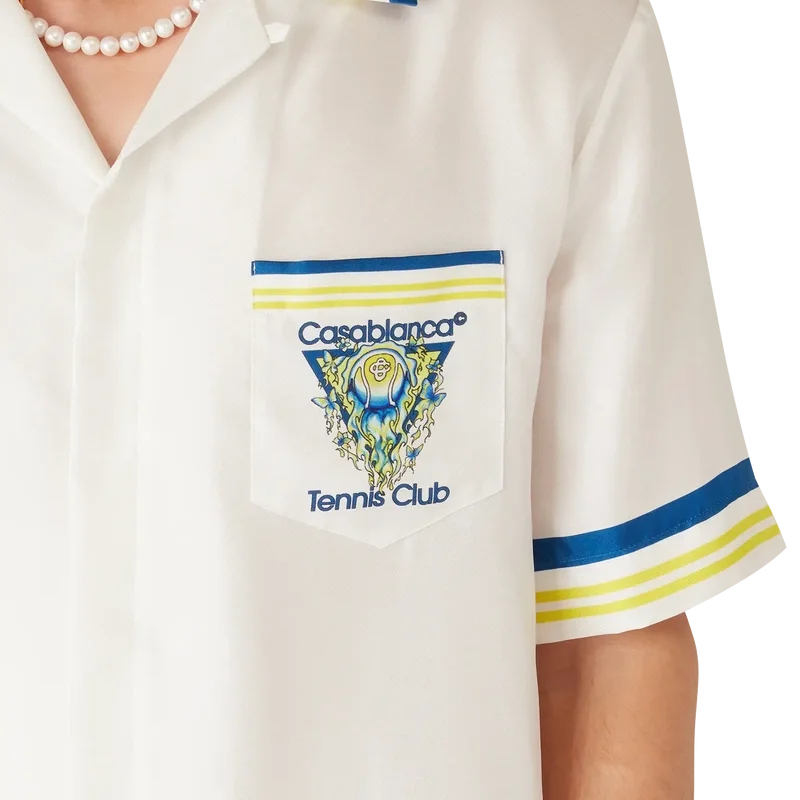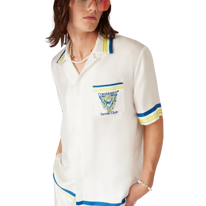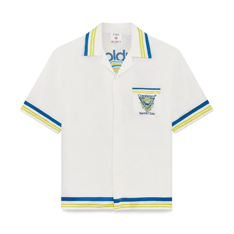 Tennis Club kortärmad silkesskjorta är ett tryckt mönster med husets karakteristiska tennisbollsmotiv i flykt, vilket återspeglar den grundläggande balansen mellan kraft, hastighet och kontroll. Kompletterad med kubansk krage, knäppning, Corozo-knappar med sammanflätat CC-logo, bröstficka samt randiga detaljer på krage, manschetter och nederkant.