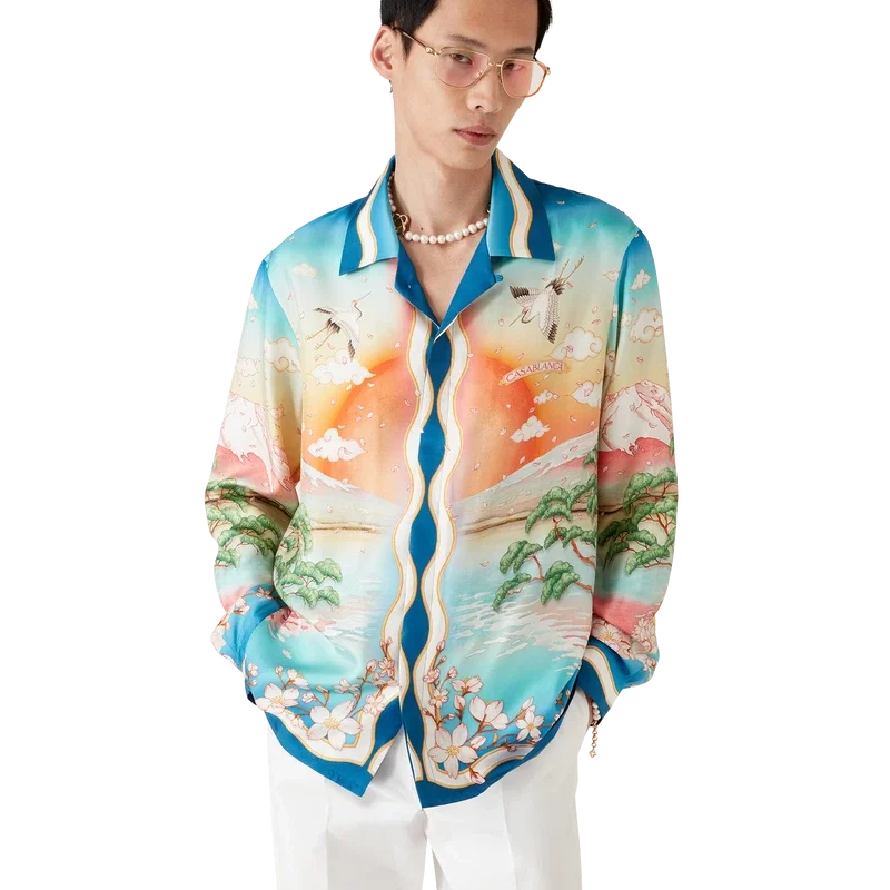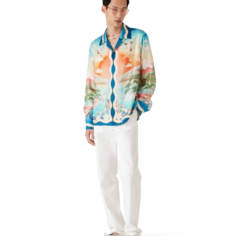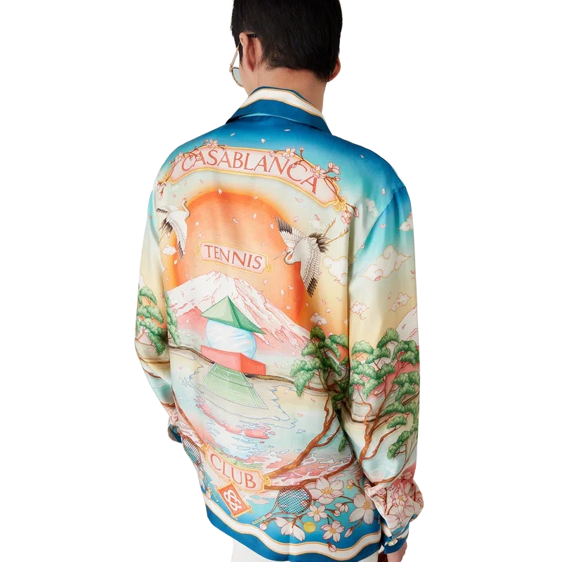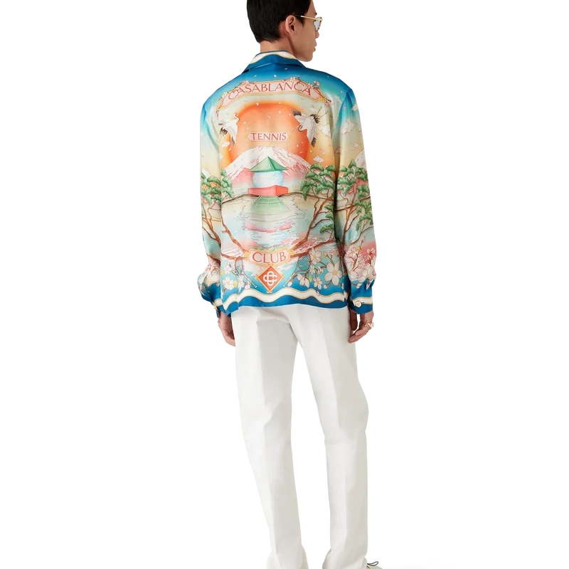 Tennis Club-silkeskjortan är en långärmad skjorta med heltryckt design som visar säsongens version av Tennis Club med vårt klassiska layout men med traditionell japansk konst – vilket gör den till ett plagg med en stark berättelse och ett vackert sätt att förena konstnärliga stilar – tillverkad av silketwill. Kompletterad med knäppning, sammankopplade Cc-logotypknappar i corozo, signaturknappar med guldkant och pärlor vid krage och manschetter, samt Memphis Wave-inspirerade randdetaljer på fåll, manschetter, knäppning och krage.