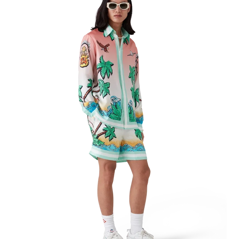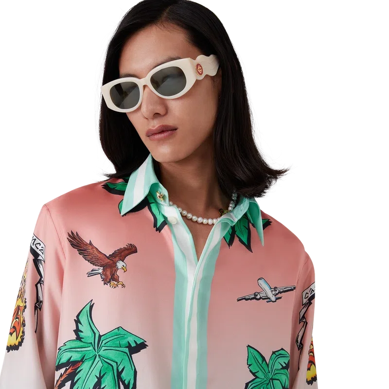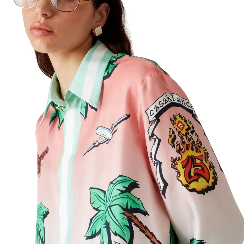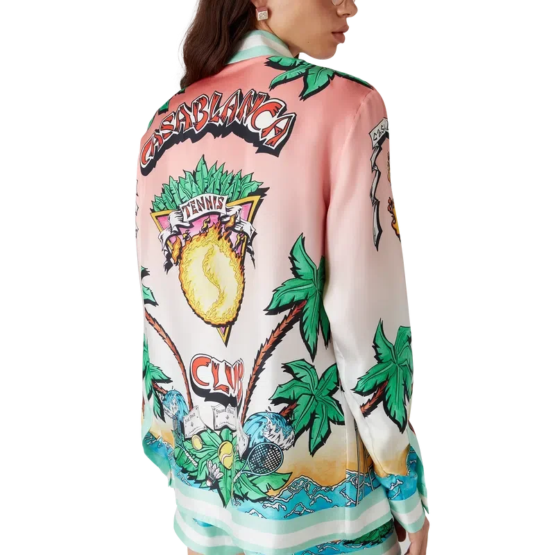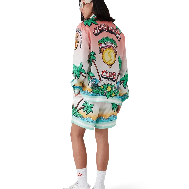 Tennis Club Silk Shirt är en heltryckt design med konstverk som omtolkar husets Tennis Club-tryck i ett surftema, i stil med en grafisk skiss ritad med tuschpennor, tillverkad av silketwilltyg. Avslutad med kubansk krage, bröstficka, dold knäppning med sammanlänkade Cc Corozo-knappar och en guldkantad emaljknapp på varje manschett.