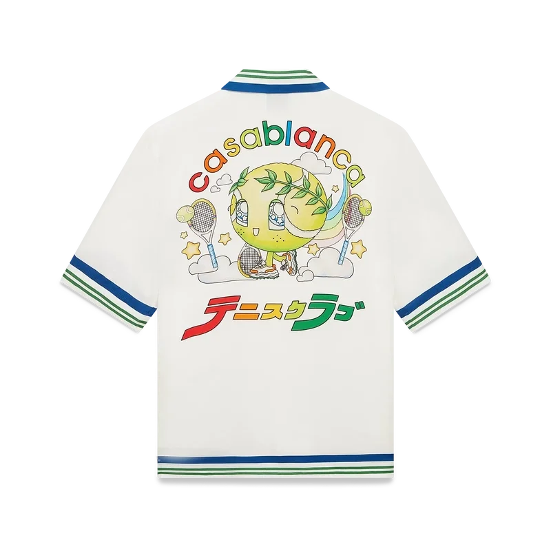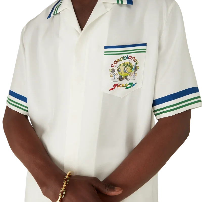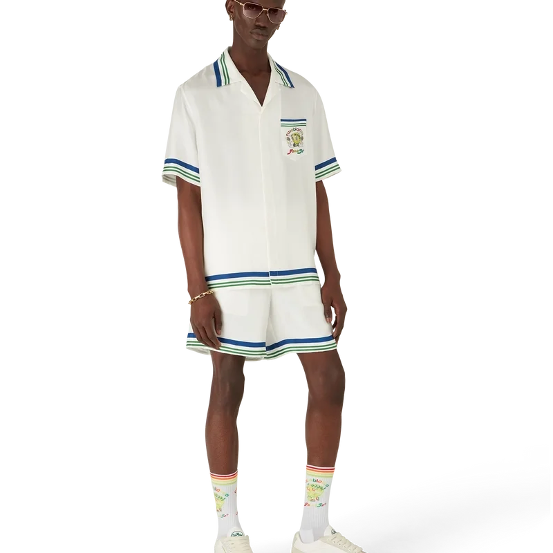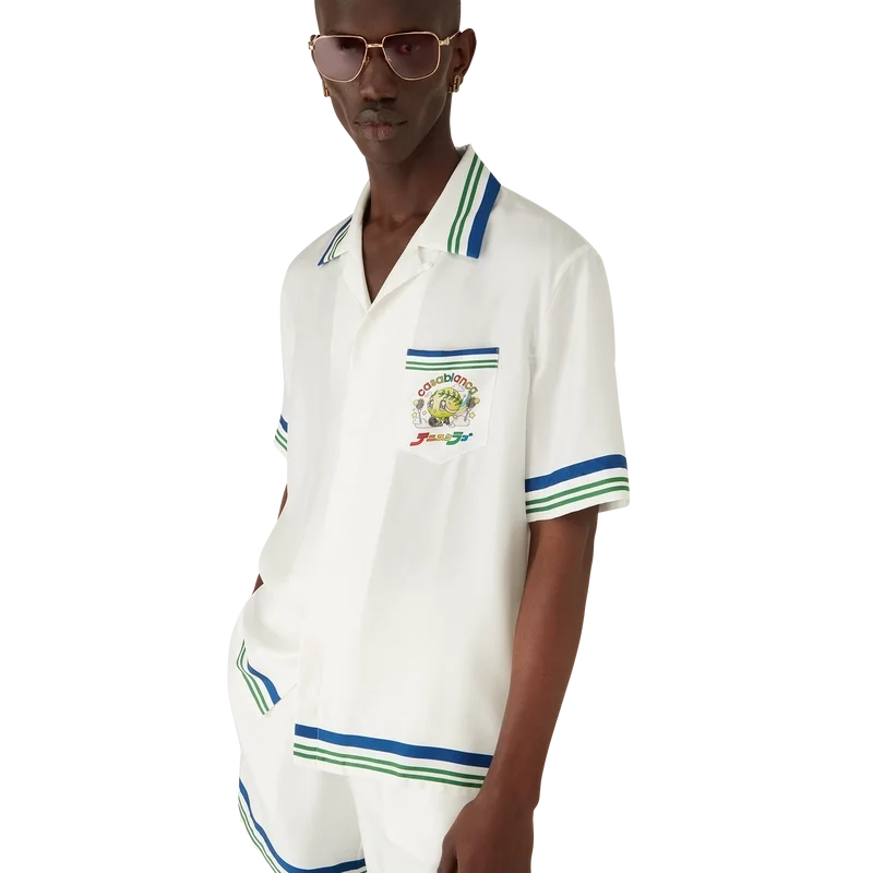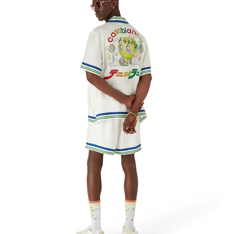 Tennis Mascot shorts i silketwill har ett tryckt mönster med säsongens motiv av den kawaii-inspirerade tennisbollen – denna karaktär är en viktig del av vårt universum. Den innehåller element som lagerblad, Atlantis-sneakers, racket och kawaii-ögon. Vi har valt att använda denna karaktär som det centrala motivet för alla herrmodeller i kollektionen. Skjortan har kubansk krage, knäppning, Corozo-knappar med sammanflätat CC-logo, bröstficka samt blå, vita och gröna randiga detaljer på krage, manschetter, nederkant och ficka.