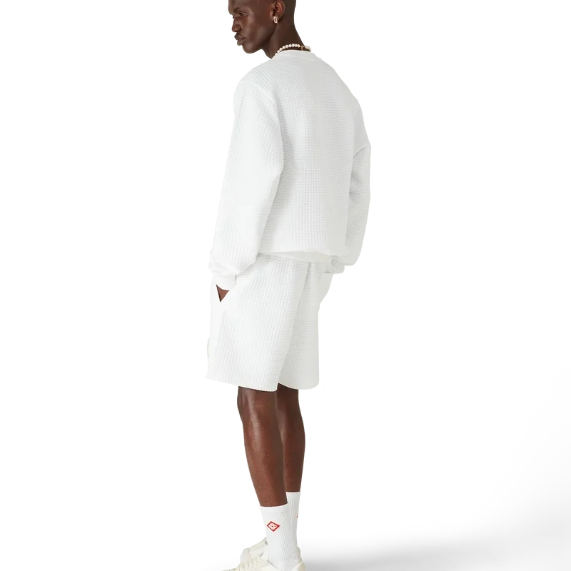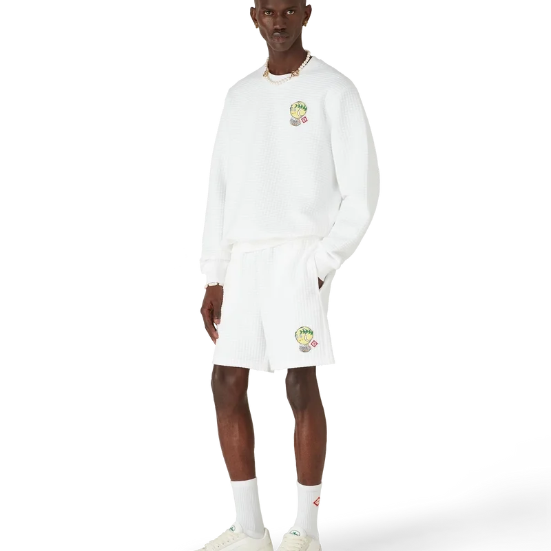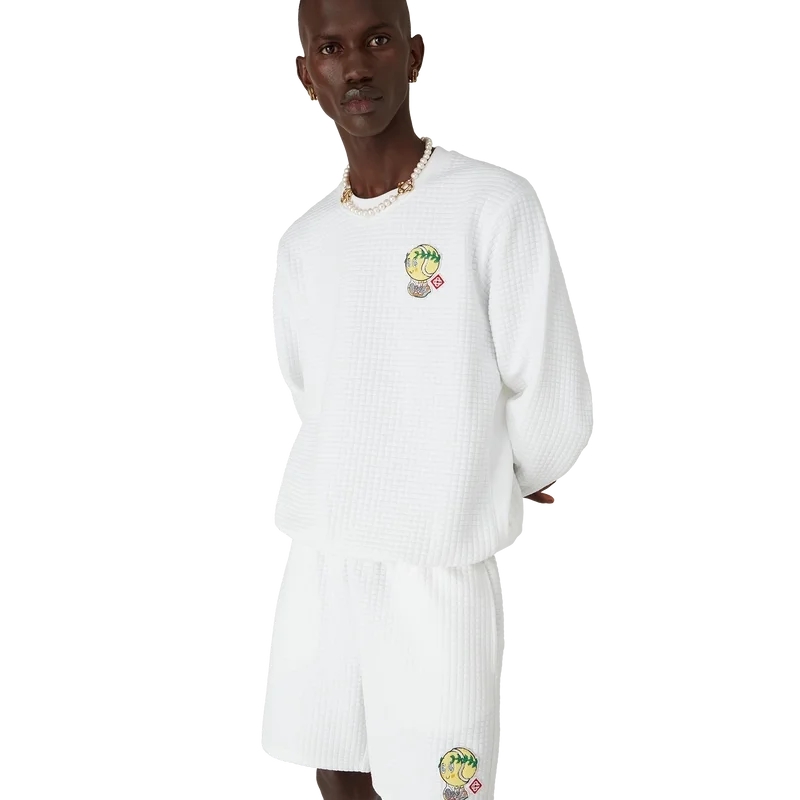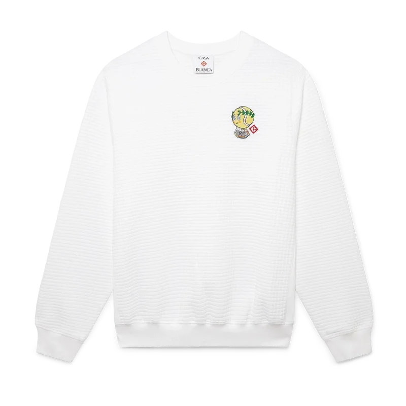 Tennis Mascot Quilted Sweatshirt är en långärmad broderad tröja, tillverkad av ett rutmönstrat quiltat tyg med säsongens motiv av den kawaii-inspirerade tennisbollen – denna karaktär är en viktig del av vårt universum. Den innehåller element som lagerblad, Atlantis-sneakers, racket och kawaii-ögon. Vi har valt att använda denna karaktär som det centrala motivet för alla herrmodeller i kollektionen. Avslutas med en klassisk rund hals.<!–