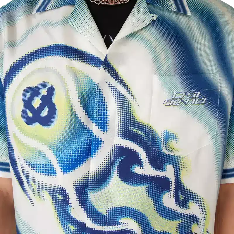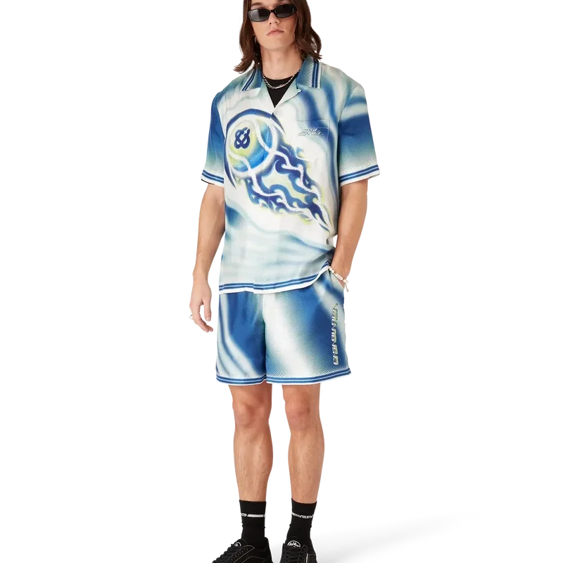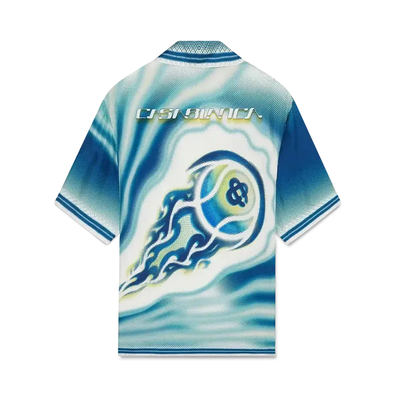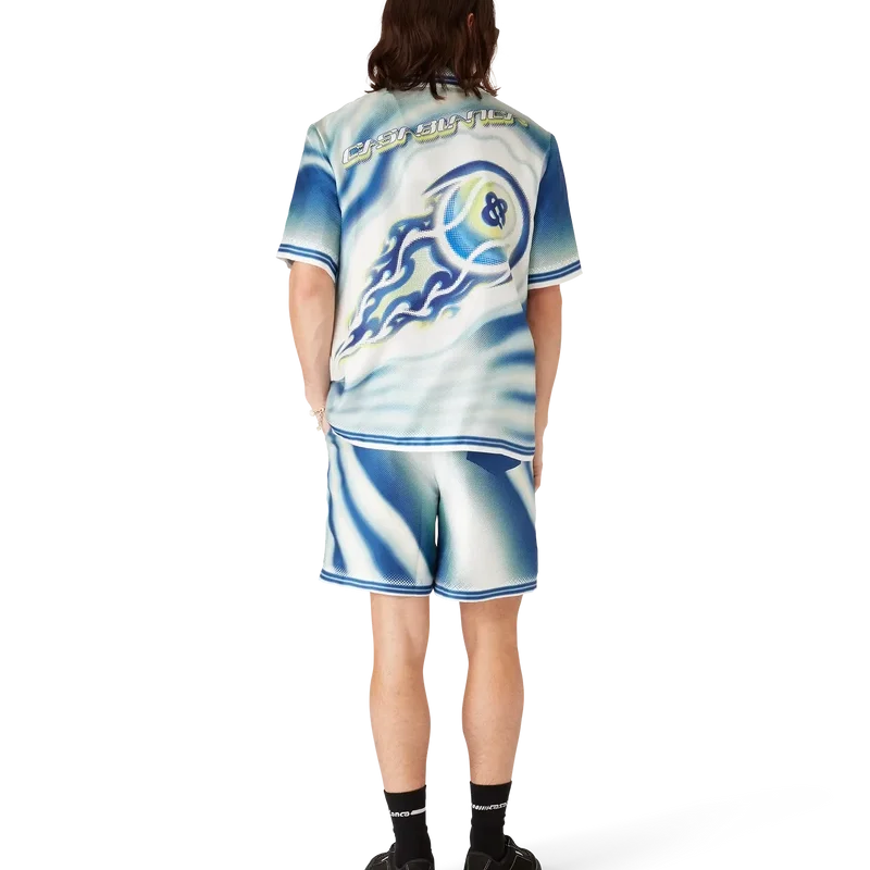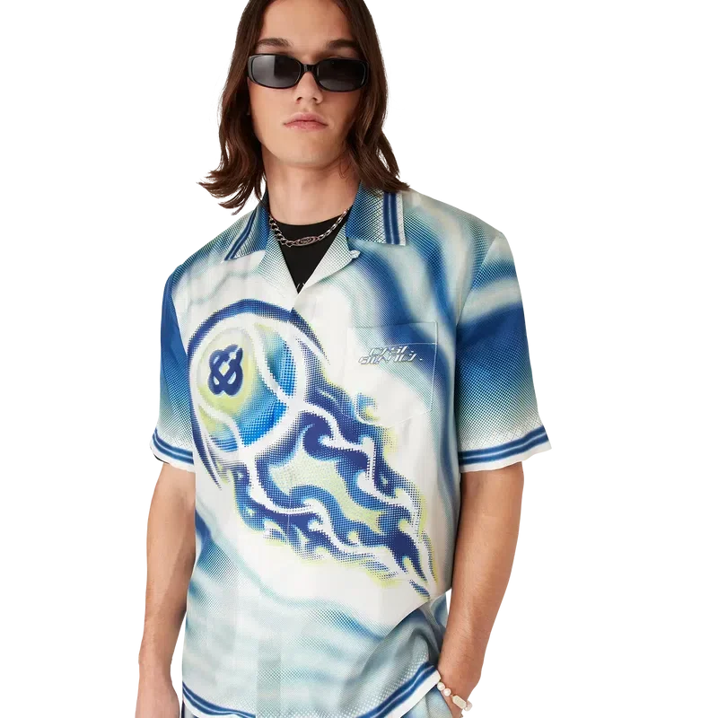 The Art of the Serve kortärmad silkskjorta har ett heltäckande tryck med husets karakteristiska motiv av en tennisboll i luften, vilket speglar den grundläggande balansen mellan kraft, hastighet och kontroll. Kompletterad med kubansk krage, Casablanca-logotyp, knäppning, Corozo-knappar med sammanflätade Cc-logotyper, bröstficka och randiga kanter på krage, manschetter och nederkant.<!–