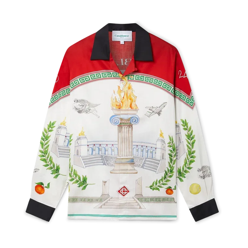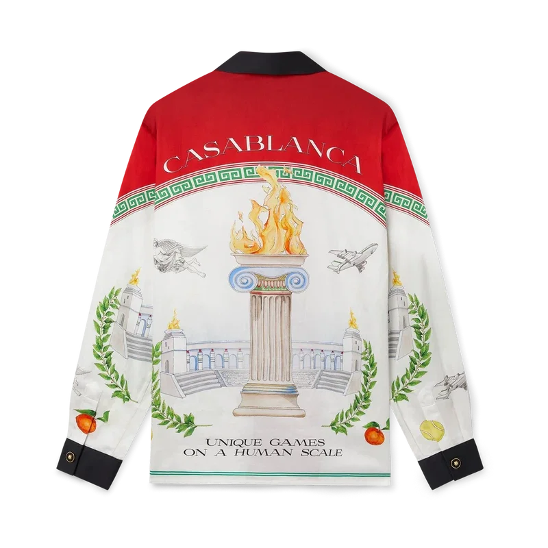 Unique Games bomullsskjorta är en långärmad skjorta med heltryckt mönster, tillverkad i bomullstyg med husets säsongsbetonade konstverk inspirerat av antikens Grekland. Kompletterad med husets signaturknappar med guldkant, knäppning, kubansk krage, kontrasterande krage och manschetter samt randiga detaljer i nederkanten, med grekiska vågdetaljer över bröstet och ryggen.