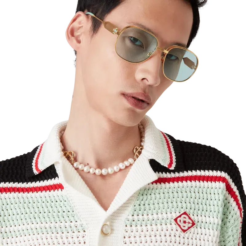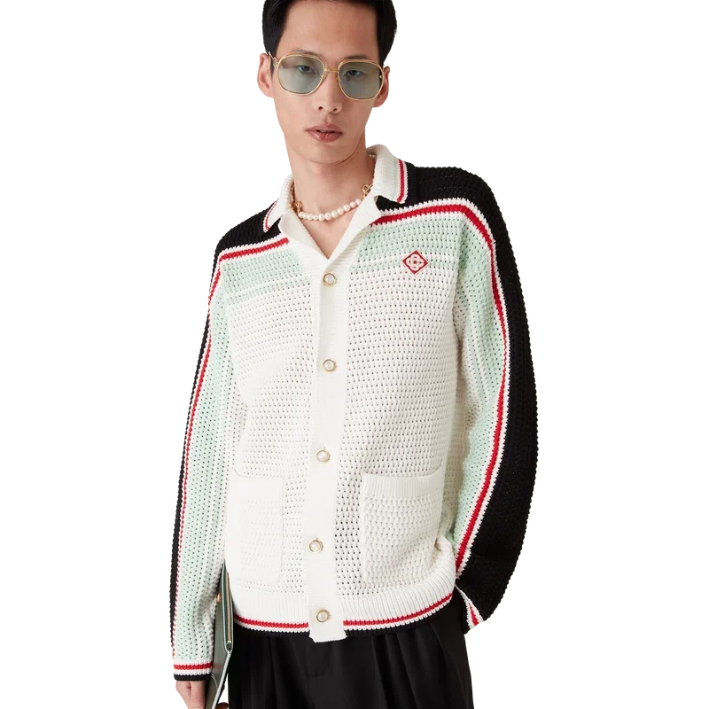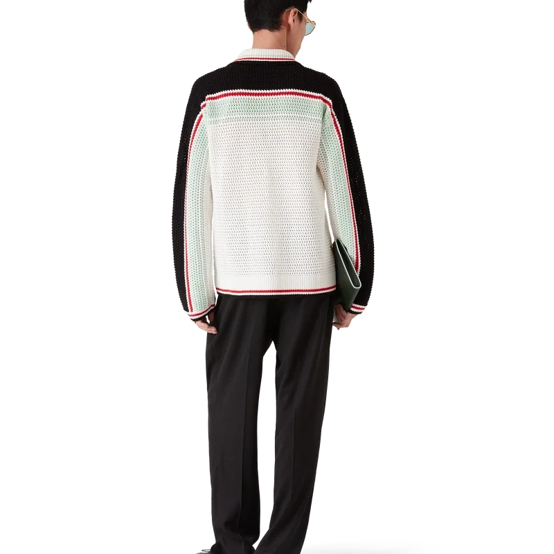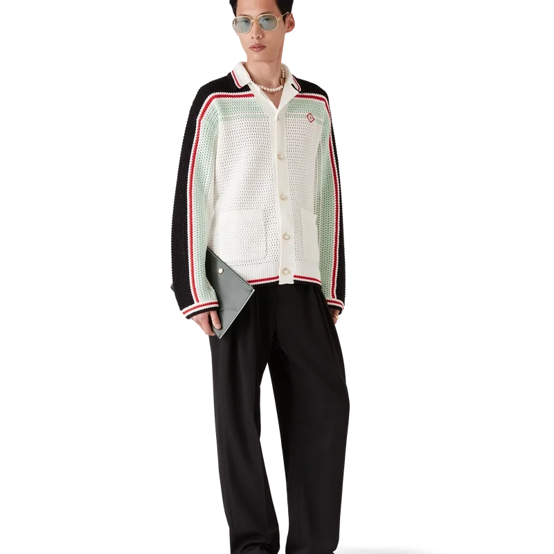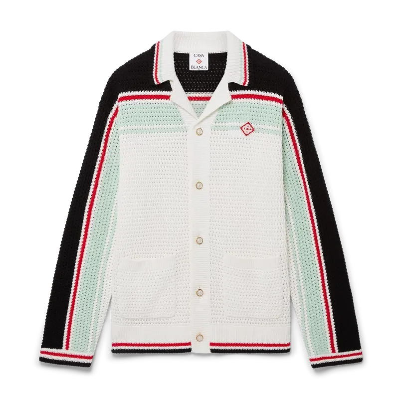 Den virkade bomullstennisshacketen är en långärmad modell med struktur, tillverkad av ett virkat bomullstyg med husets signaturdiamantlogo, som anknyter till kollektionens tema om resor och semester. Den har ribbad krage, muddar, fåll och knäppning, påsydda fickor fram, knäppning med knappar, märkets signaturknappar med guldkant och pärlor samt detaljer i svarta, röda, mintgröna och vita ränder över bröstet, på ryggen och längs ärmarna, samt randiga kanter på muddar, fåll och krage.