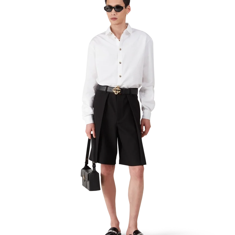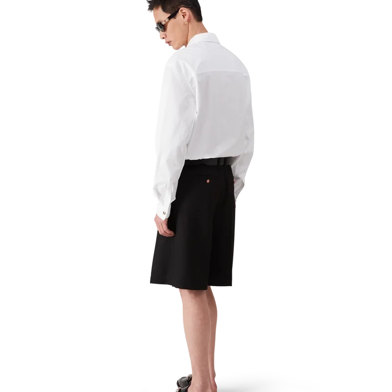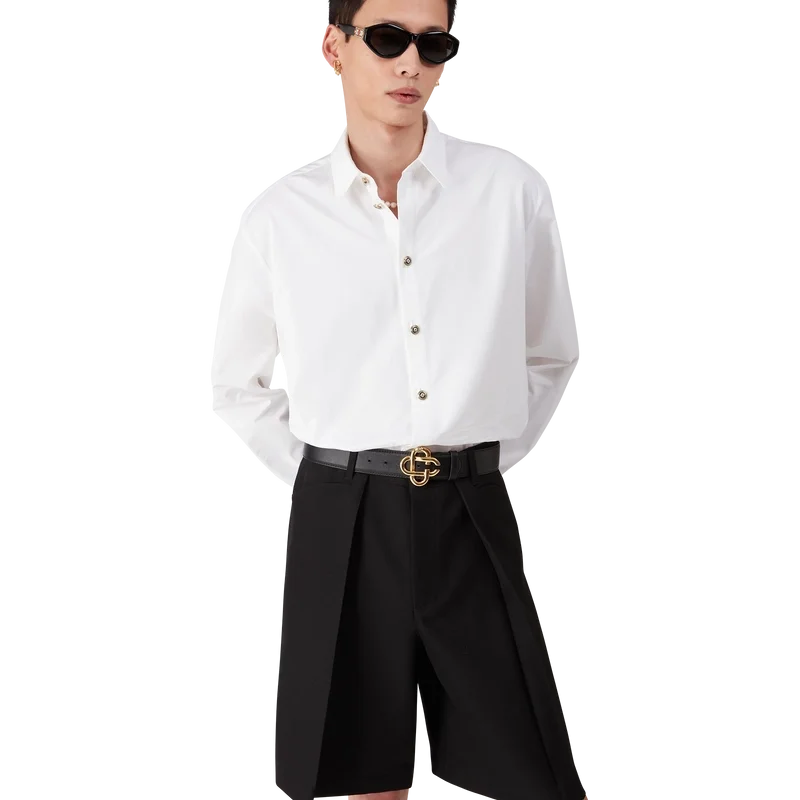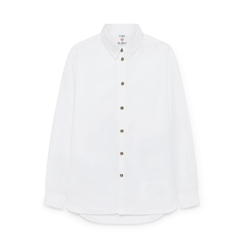 Den vita bomullsskjortan är en långärmad modell tillverkad av bomullstyg avskjortkvalitet. Den har spetskrage, knäppning, platta emaljknappar och en rundad nederkant.