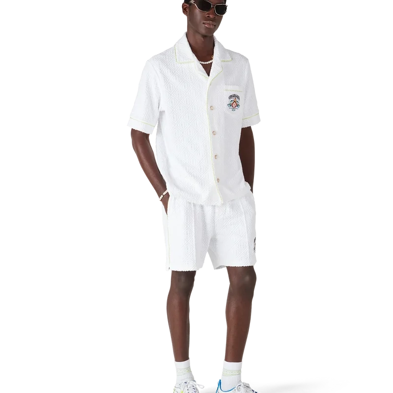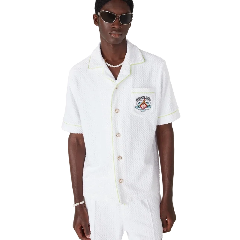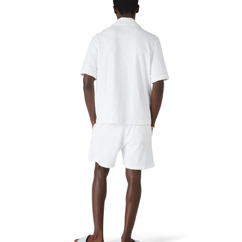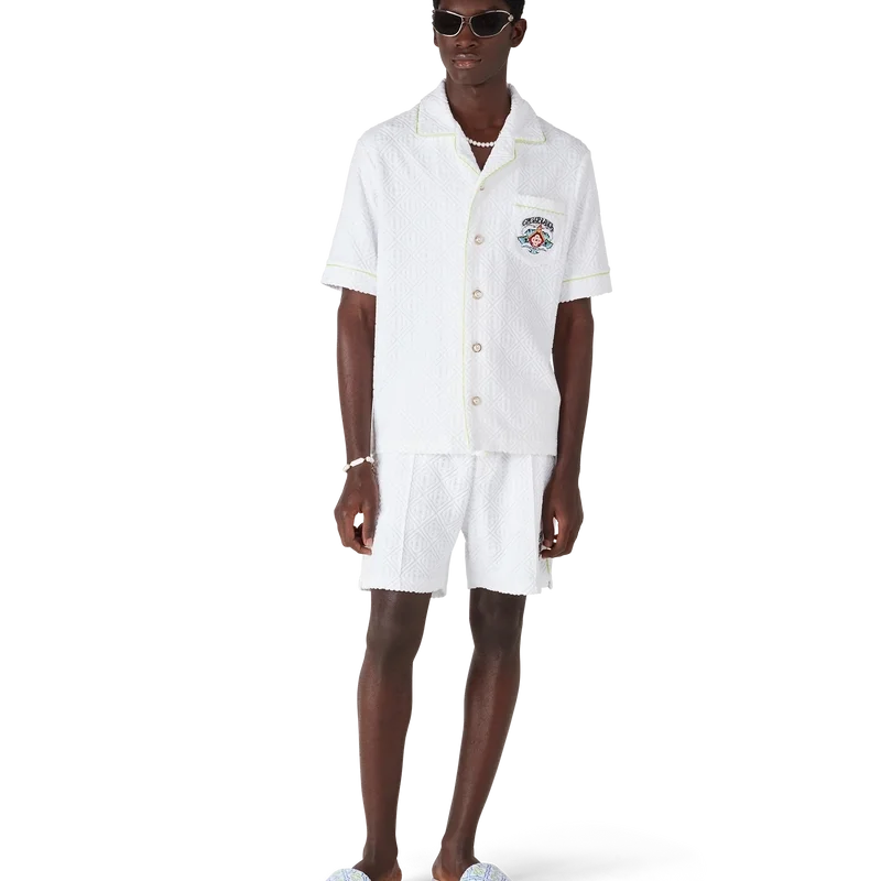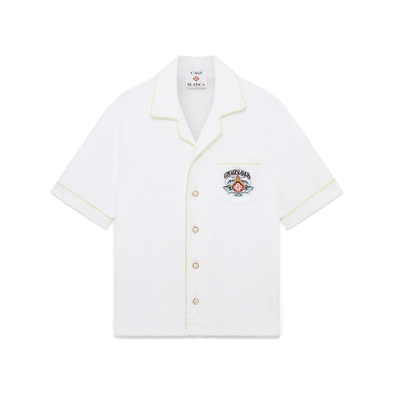 Frotté-skjortan med monogram är en elegant kortärmad modell med säsongens Innocence-motiv som föreställer en havsscen vid solnedgången med en ö i mitten, utförd i en stil som är influerad av klassisk surf-T-shirtkonst. Motivet fångar den gyllene timmens eteriska skönhet över tropiska vatten och presenterar en idealiserad vision av ett strandparadis genom husets raffinerade sport- och fritidslins. Kompletterad med en kubansk krage, en bröstficka, knäppning, signaturknappar med guldkant och pärlemor samt pipingdetaljer på krage, manschetter och knäppning.
