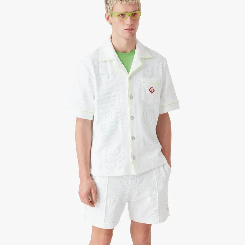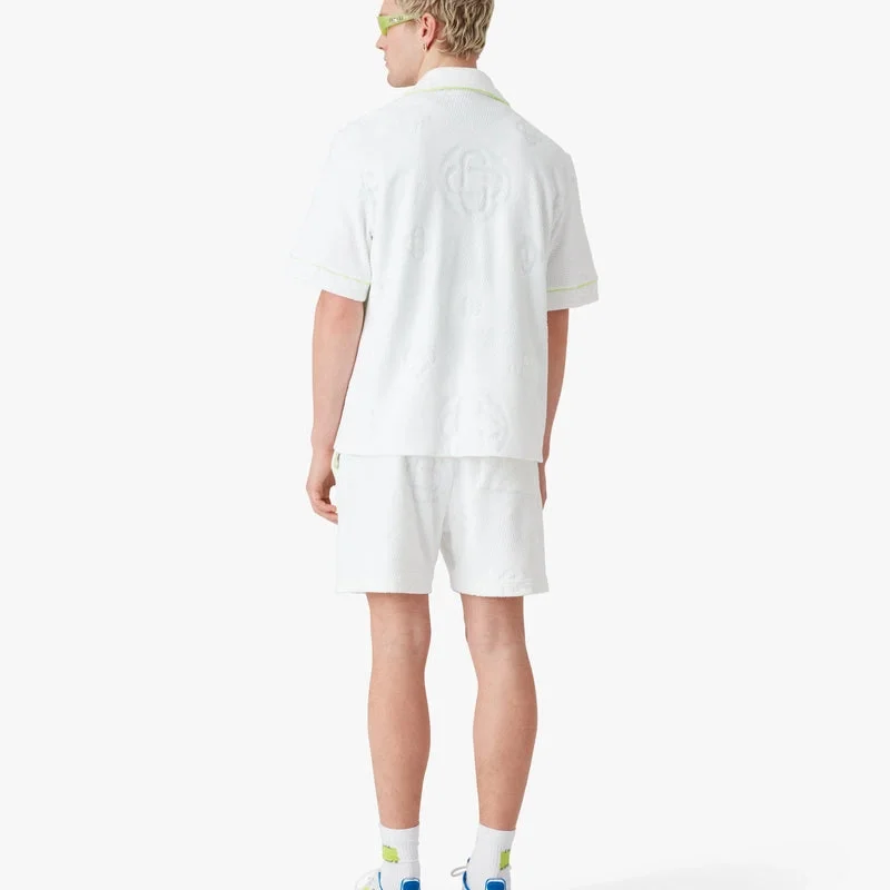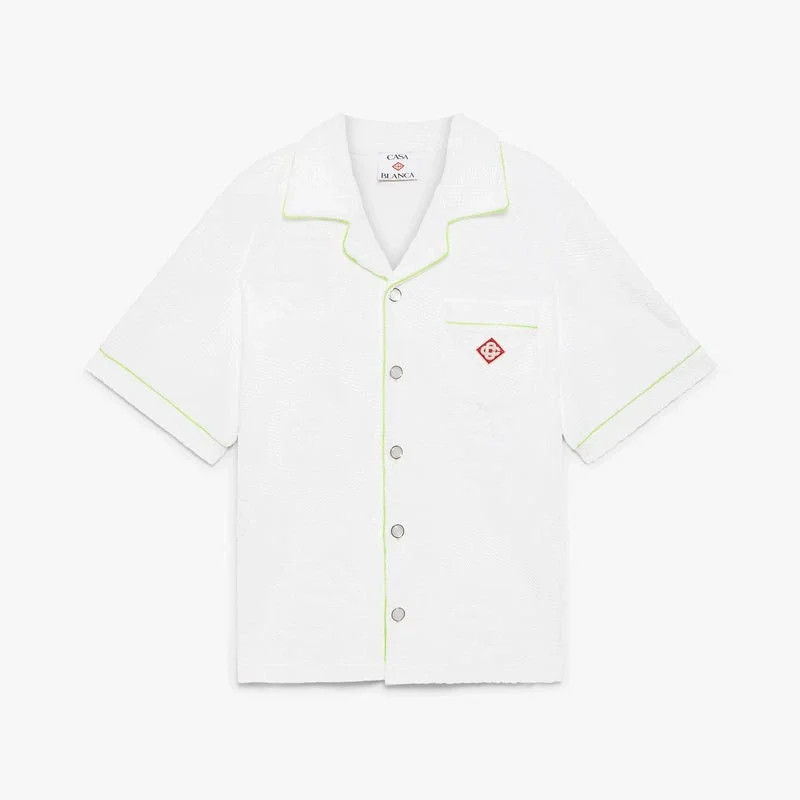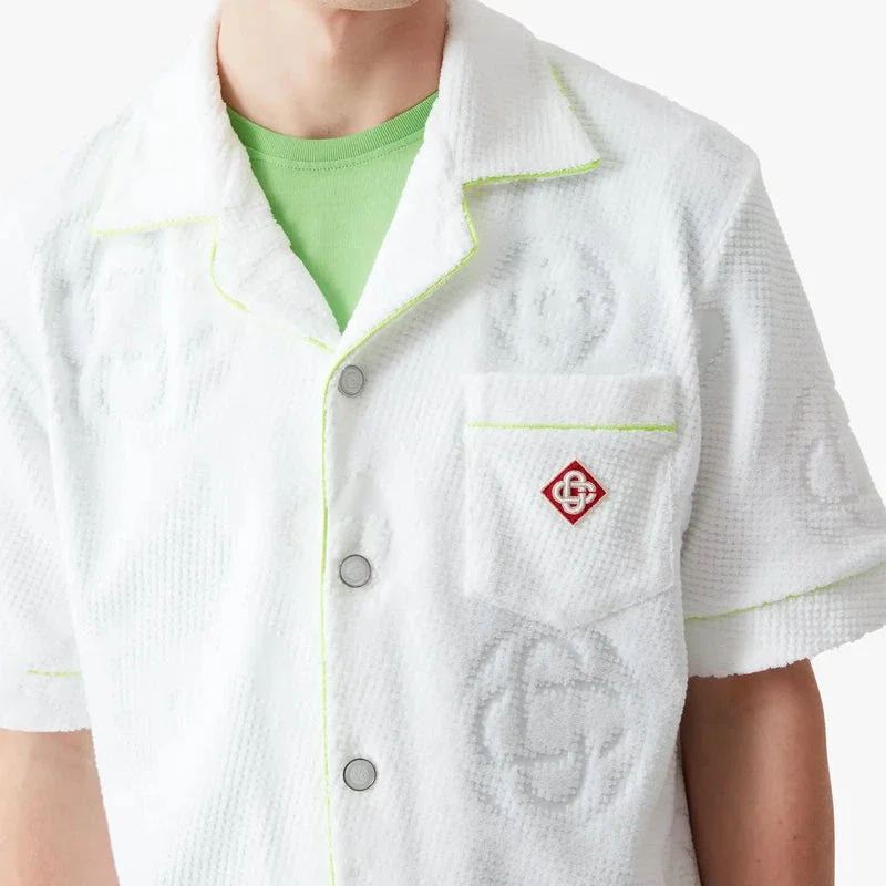 Den kortärmade skjortan i frotté med monogram har en raffinerad design med husets ikoniska monogrammönster över hela plagget och Casablanca-diamantlogotypen. Den kompletteras med en kubansk krage, knäppning, signaturknappar med guldkant och pärlemor, en bröstficka samt kontrasterande pipingdetaljer på knäppningen och fickan.