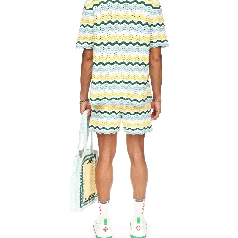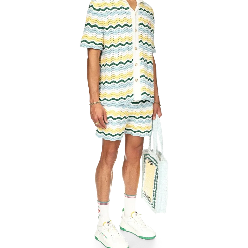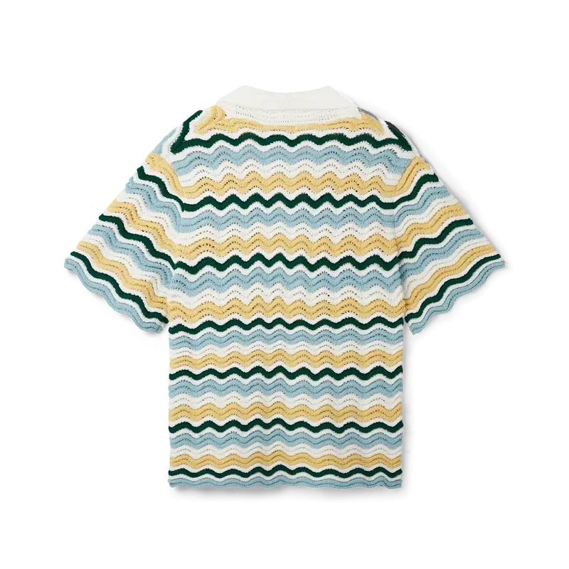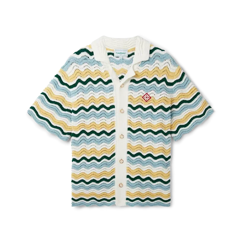 Wavy Boucle-skjortan är en signaturmodell från Casablanca, tillverkad av ett mjukt, texturerat virkat tyg med öppen väv. Den har vår signaturknäppning med guldkantade pärlknappar, öppen krage, korta ärmar och Casablanca Paris-märkesetikett – designad för att bäras med klassiska passformer.