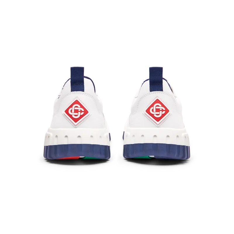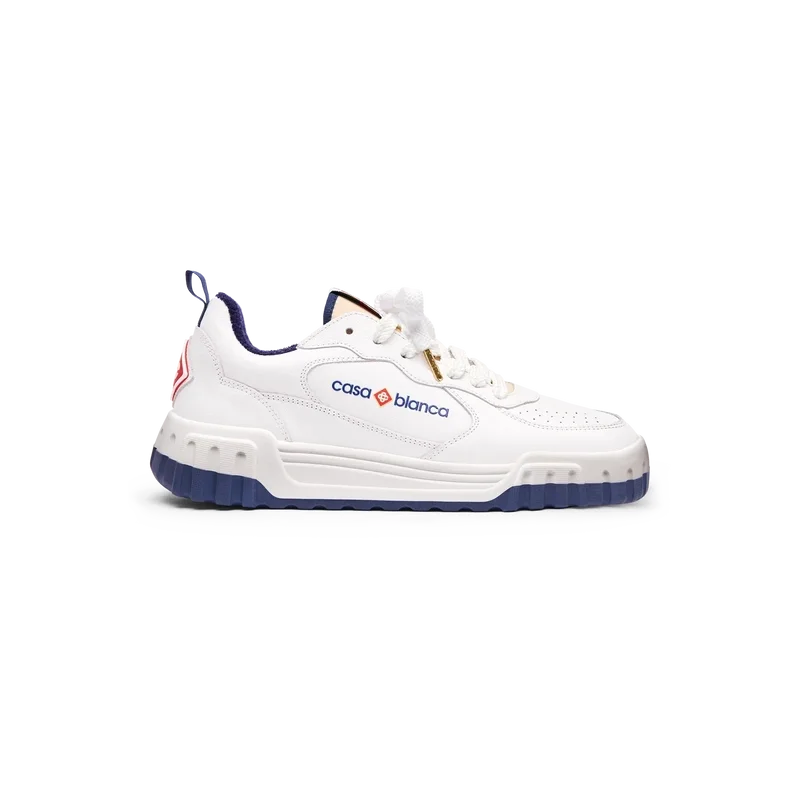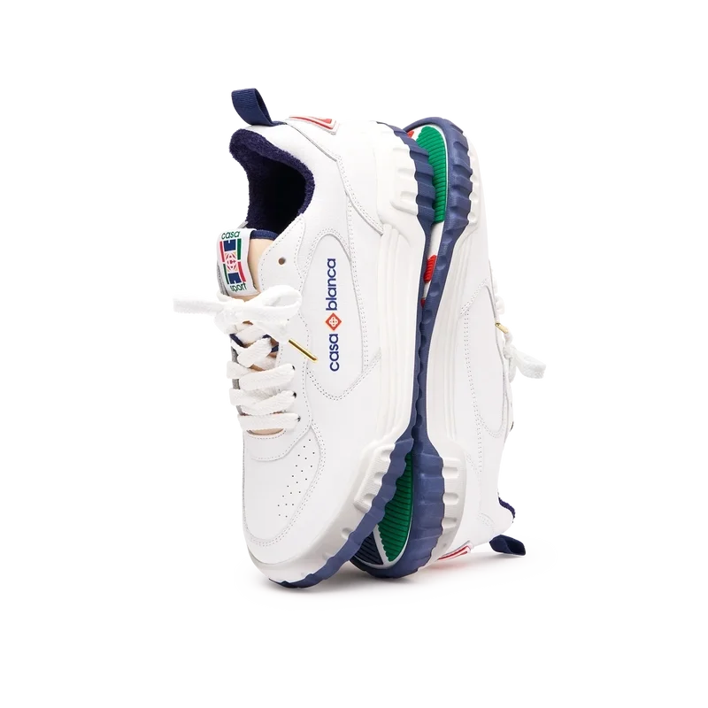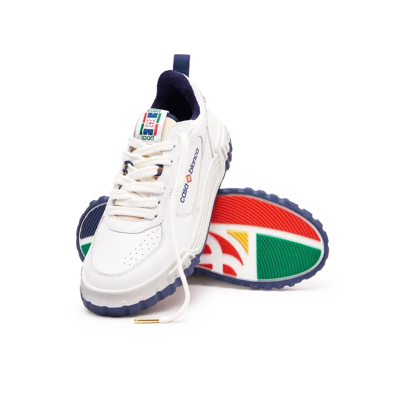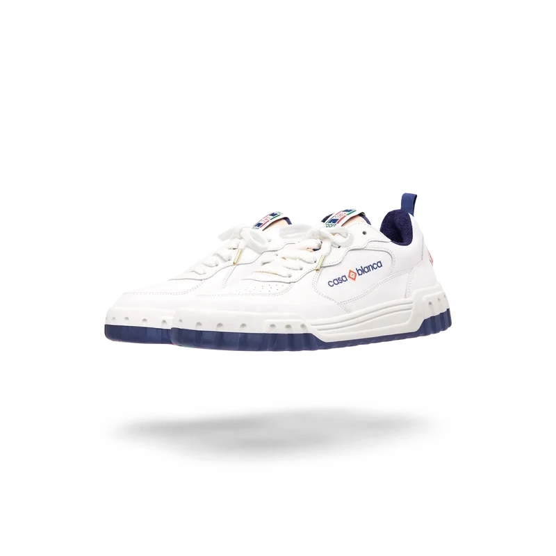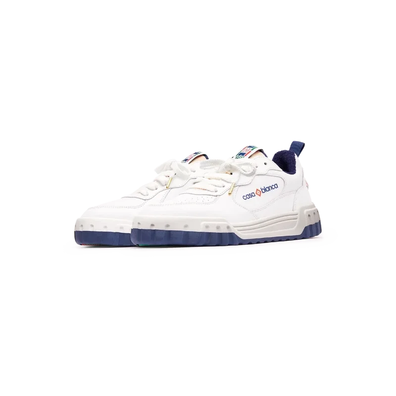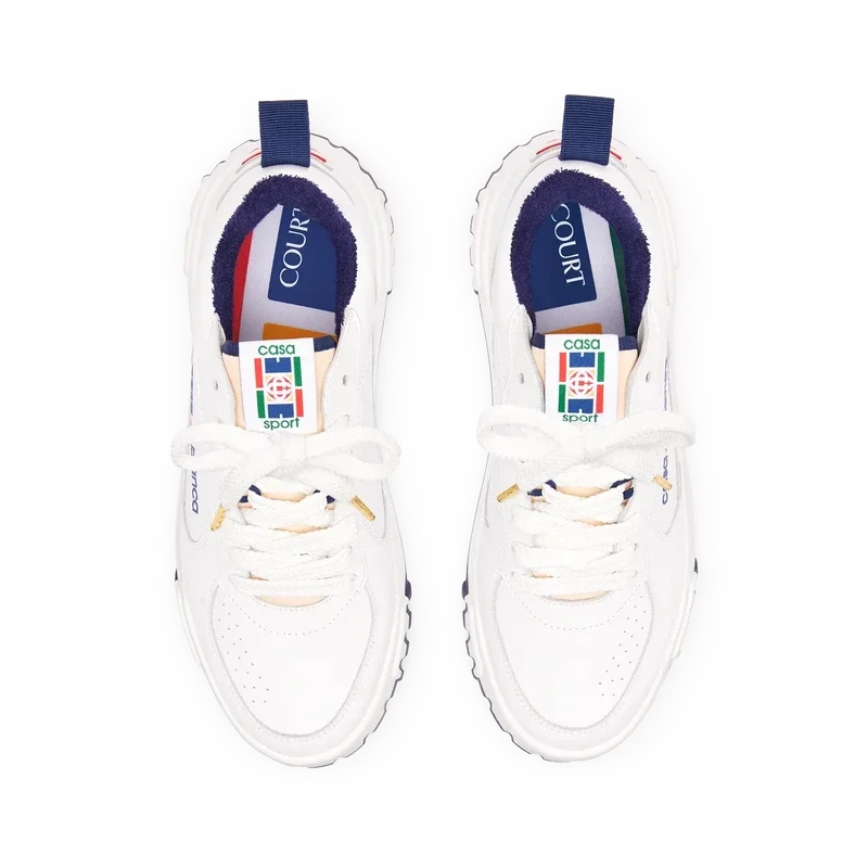 Skorna har integrerade, flödande panellinjer som en hyllning till de ikoniska silhuetterna från 90-talet. Casablancas varumärke är tydligt synligt överallt, inklusive märkets signaturdiamantmotiv på hälen, silikonordmärke på sidorna samt den vävda tungan och innersulan med tennisbanemotiv, vilket ger upphov till namnet Court.