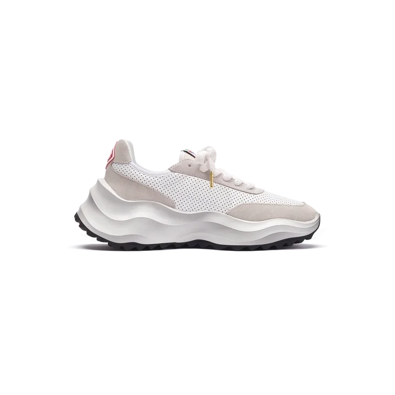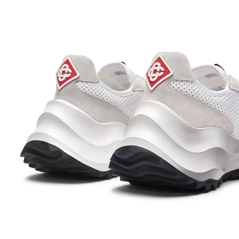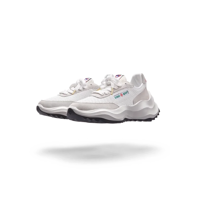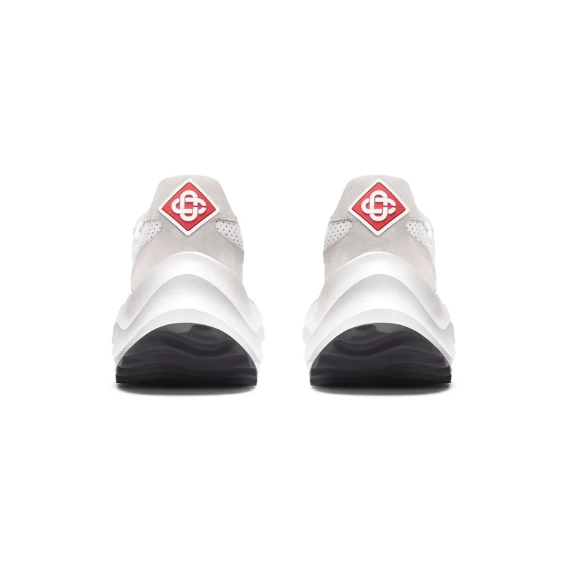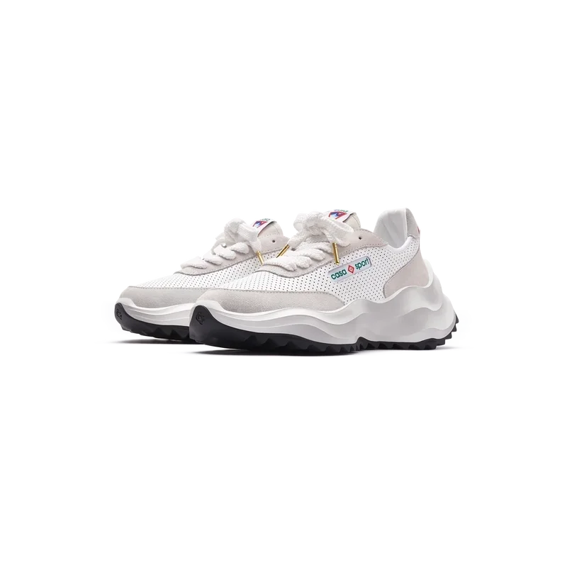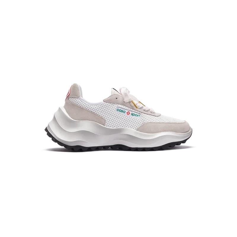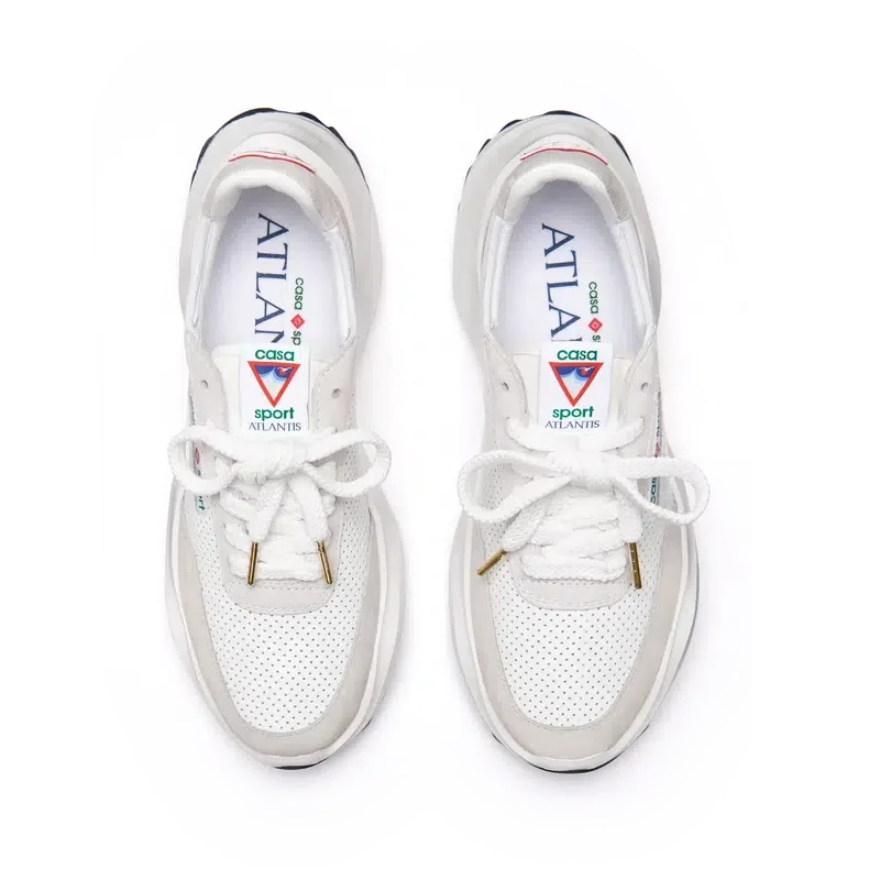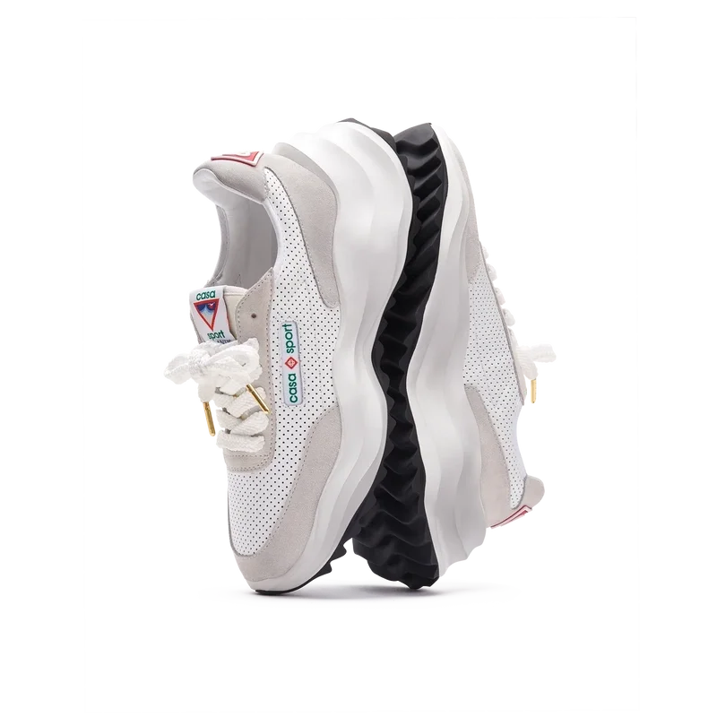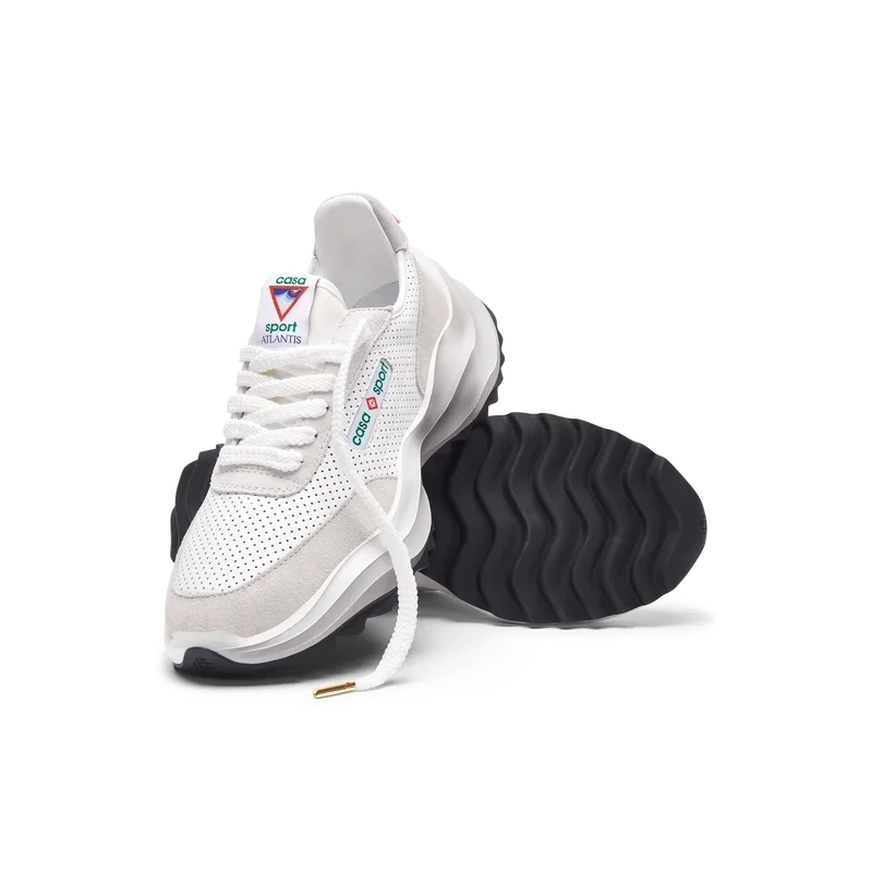Ton-i-ton off-whiteÖverdrag i mocka, perforerad läderöverdel, kontrasterande mockaskosnören, Casablanca-diamantmärke i gummi på hälfliken, vävd Casa Sport-fönsterflik med märkeslogotyp på sidopanelen, vävd Atlantis-tungetikett, skulpterad EVA-vågformad mellansula, yttersula i gummi, guldfärgade skosnörspetsar