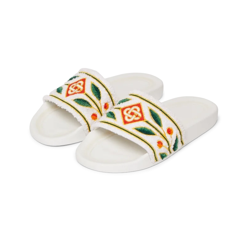 De broderade terry-tofflorna för herr är tillverkade av frotté och har husets diamantlogotyp och signaturmotivet Laurel på ovansidan. De kompletteras med en formad fotbädd för ökad komfort och en strukturerad gummiserad sula som kombinerar prestanda med fritid.