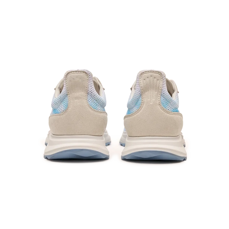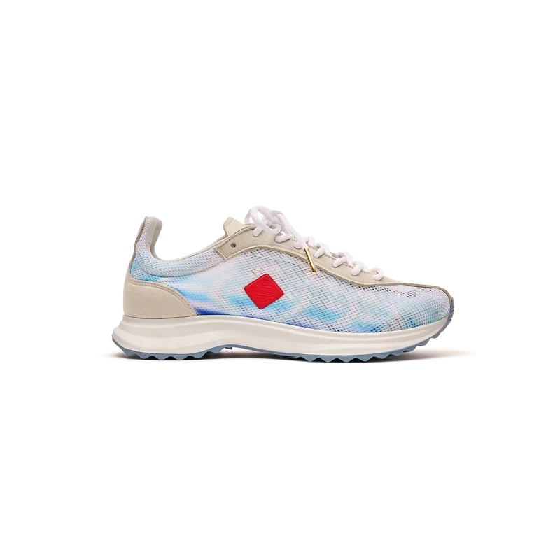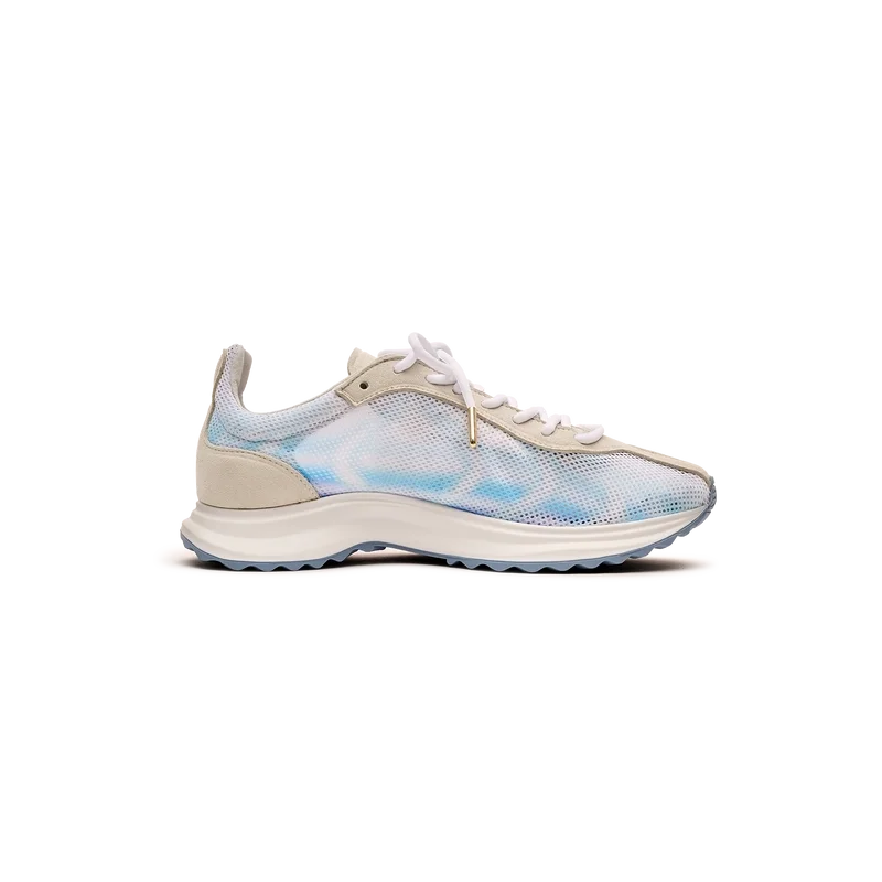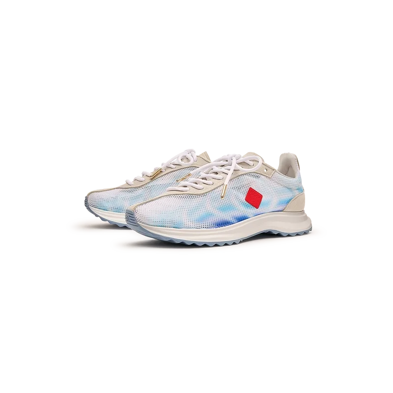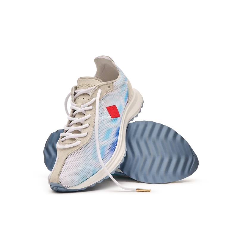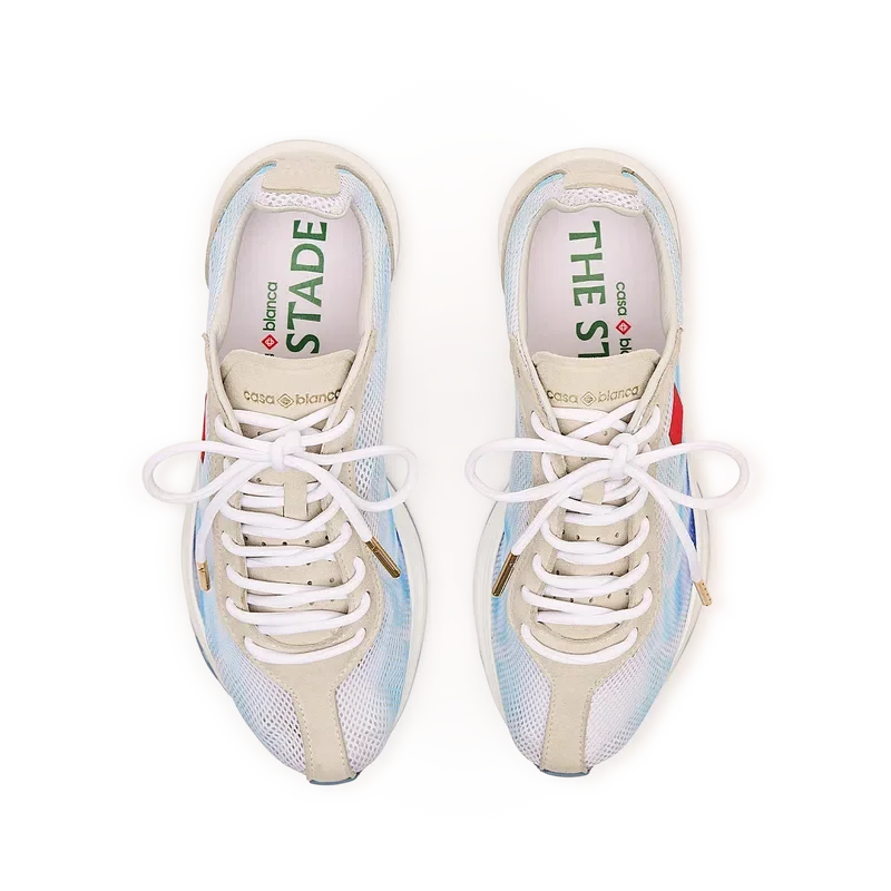 Herr-sneakersen Stade Blue har fått sitt namn från det antika grekiska måttet för distansen i ett löpningslopp, vilket senare blev ordet för stadion. Stilen är inspirerad av prestationslöparskor och är en överföring av modern teknik från antik tradition, där koden för modernt löpande med lättviktigt mesh och glödande tryck bidrar till moderniteten. Sulan har skulpterade kurvor, vilket är en referens till vår Atlantis-sko och en stabil del av Casablanca-designen.