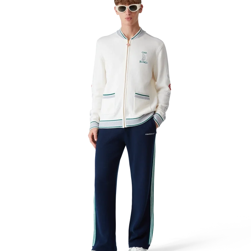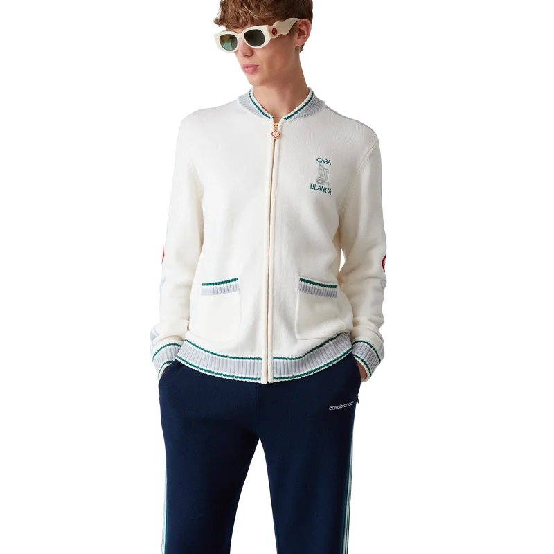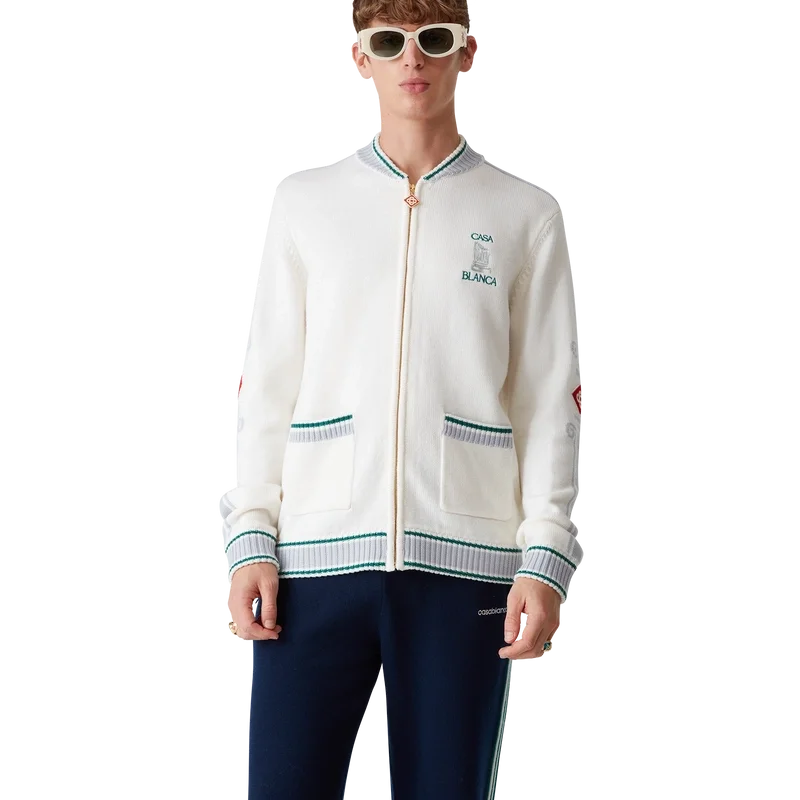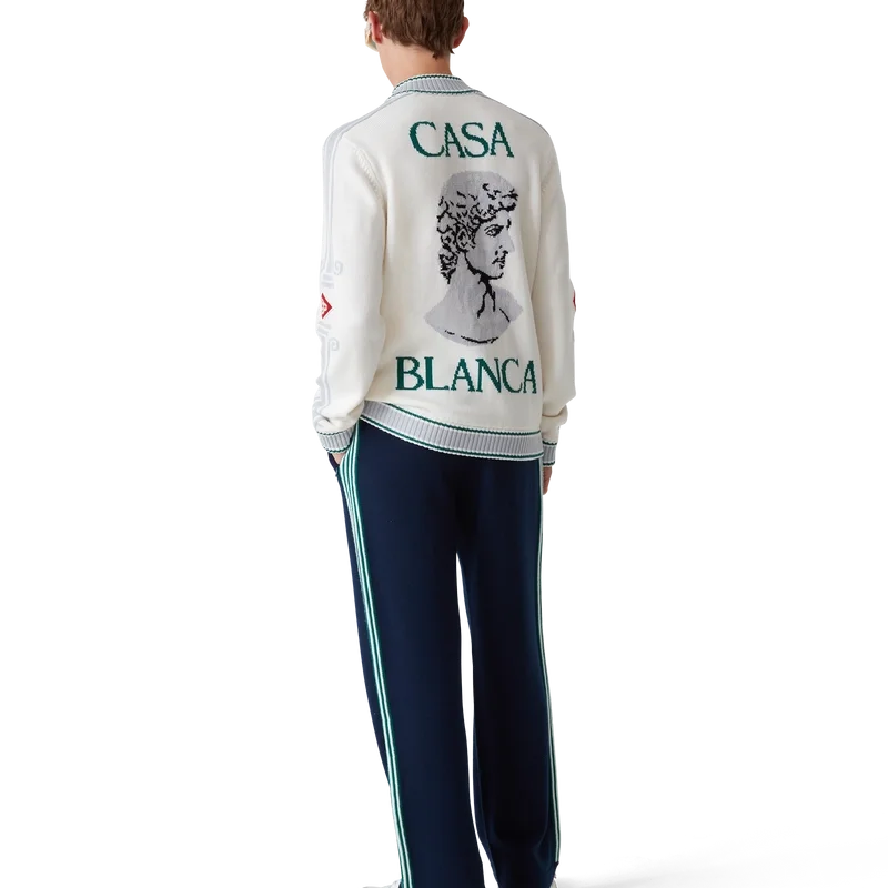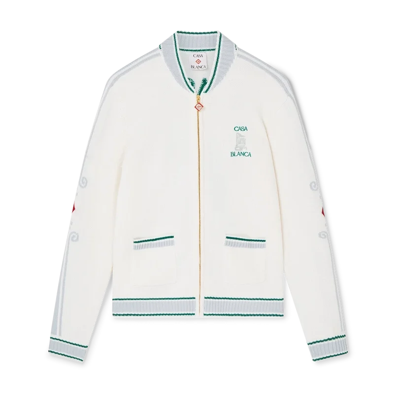 Casa Club-jackan är en klassisk långärmad modell tillverkad av merinoullstyg med säsongsbetonade motiv inspirerade av den fortsatta studien av den klassiska skönheten och den samtida charmen i det antika Grekland. Kompletterad med dragkedja fram, kolonnmönster längs ärmarna, påsydda fickor fram, ribbad krage, manschetter och nederkant.