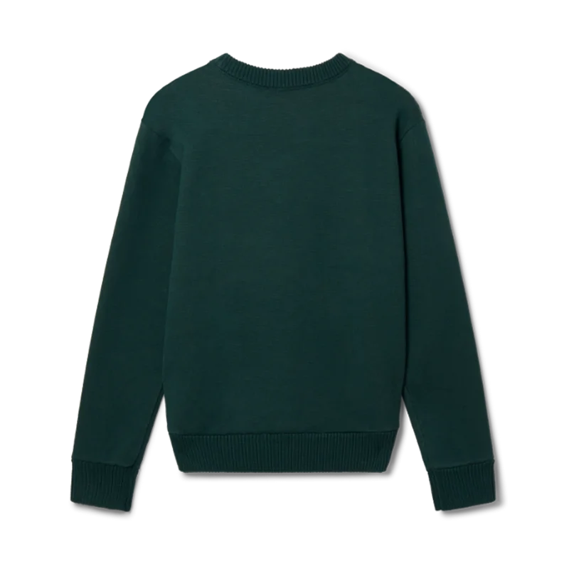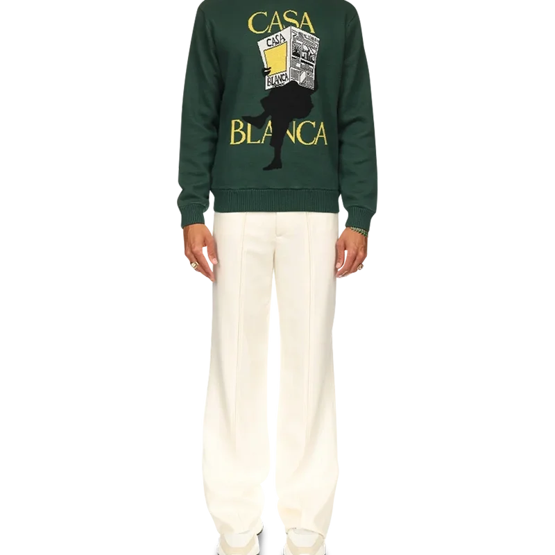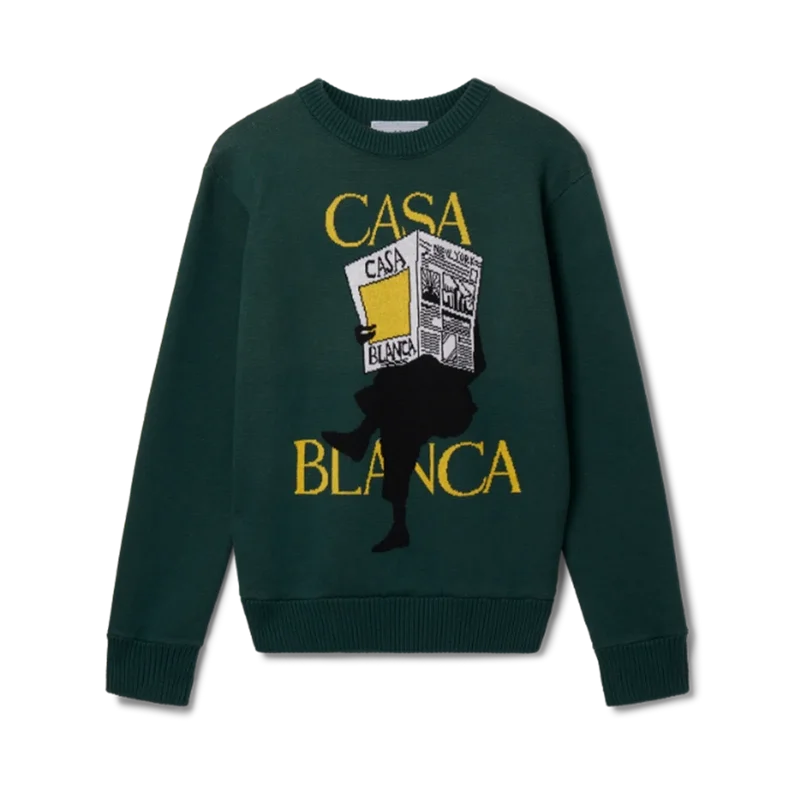 Casa Times Intarsia-tröjan är en långärmad stickad tröja, tillverkad av stickat bomullstyg och prydd med husets säsongsbetonade konstverk. Avslutad med en klassisk rund hals, ribbad krage, muddar och nederkant samt en etikett med Casablanca-logotypen.