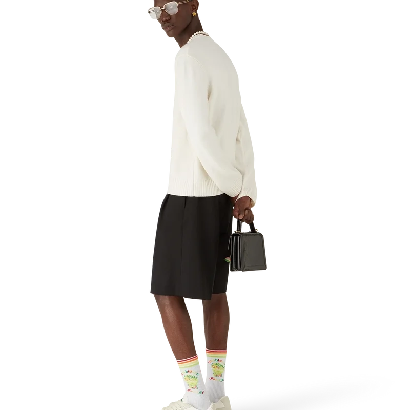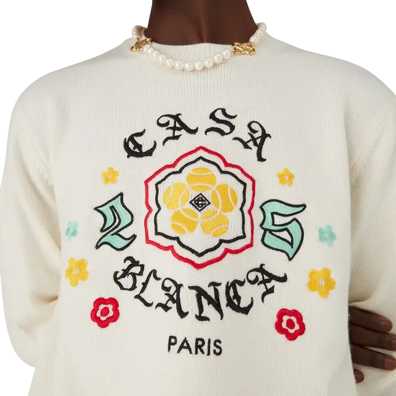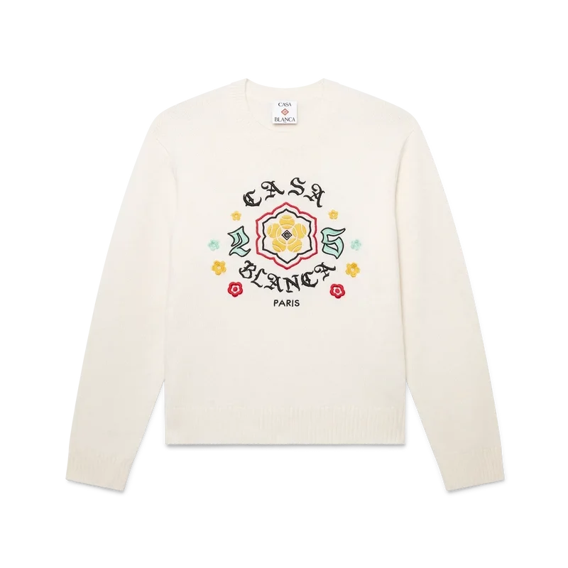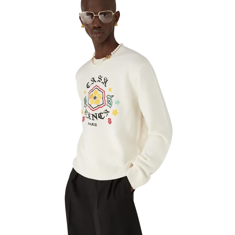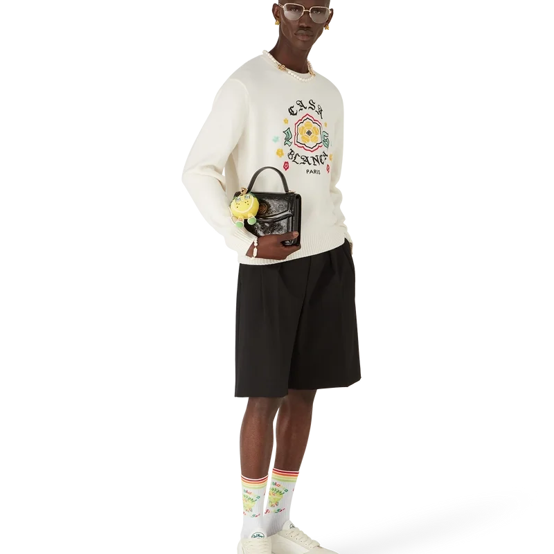Emblem Merino Knit Crew Neck är en långärmad tröja med säsongens konstverk, där vi hämtade inspiration från den japanska subkulturen BōSōZoku för ett av våra huvudteman. Kontrasten mellan grafiska element och text kändes väldigt Casablanca för oss. Vi har skapat vår egen tolkning av BōSōZoku-konsten och infogat fraser som beskriver varumärket, såsom ”Looking at the Beauty of the World”. Layouten är okonventionell, men kompositionen är noggrant balanserad, vilket ger den en unik men harmonisk känsla. Avslutas med klassisk ribbad hals, muddar och nederkant.