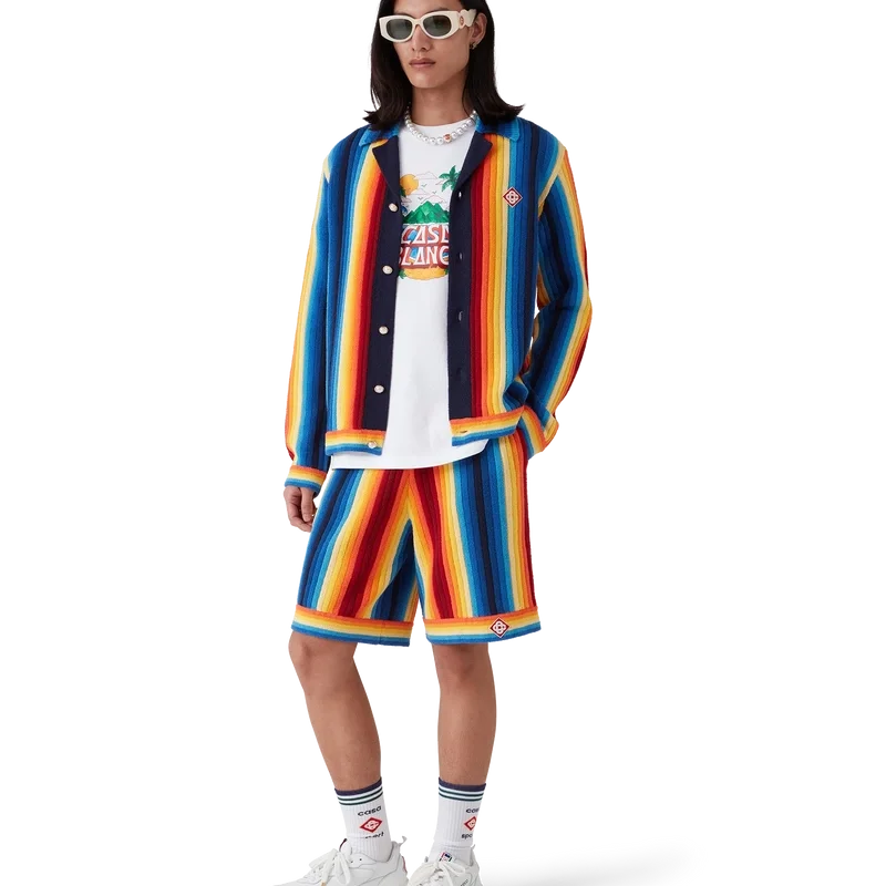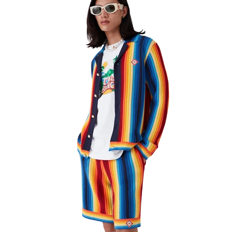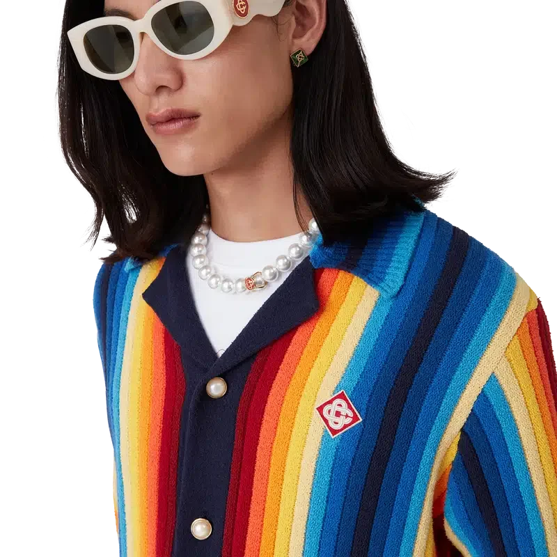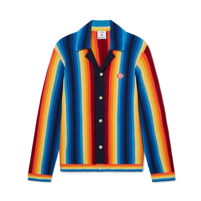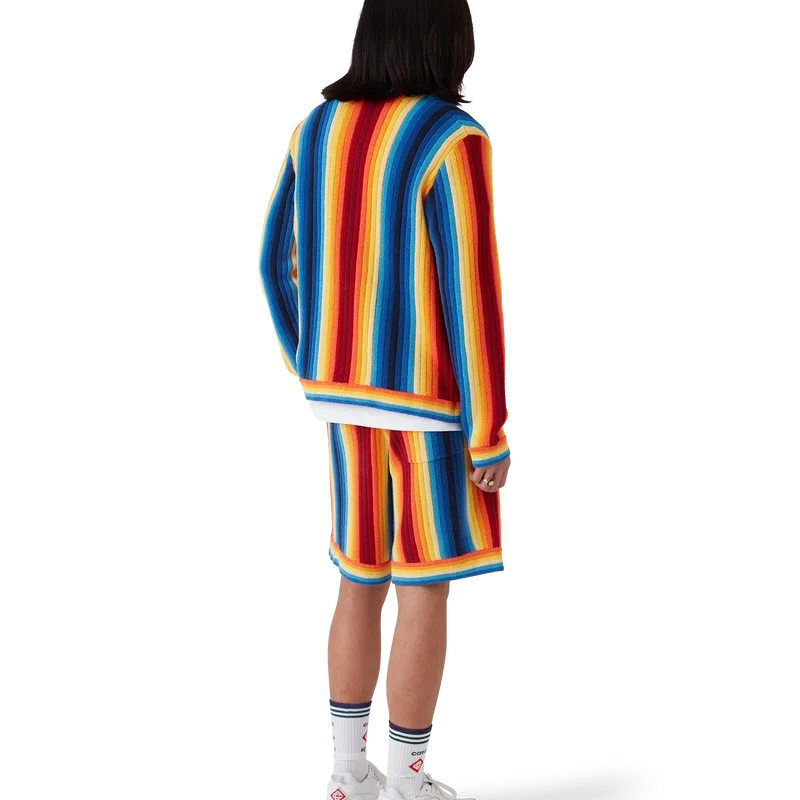 Frottéjackan med gradientrandig design är en långärmad modell tillverkad av stickat frottétyg med gradientmönster. Den har knäppning, signaturknappar med guldkant och pärlor samt ribbad krage, muddar och nederkant.