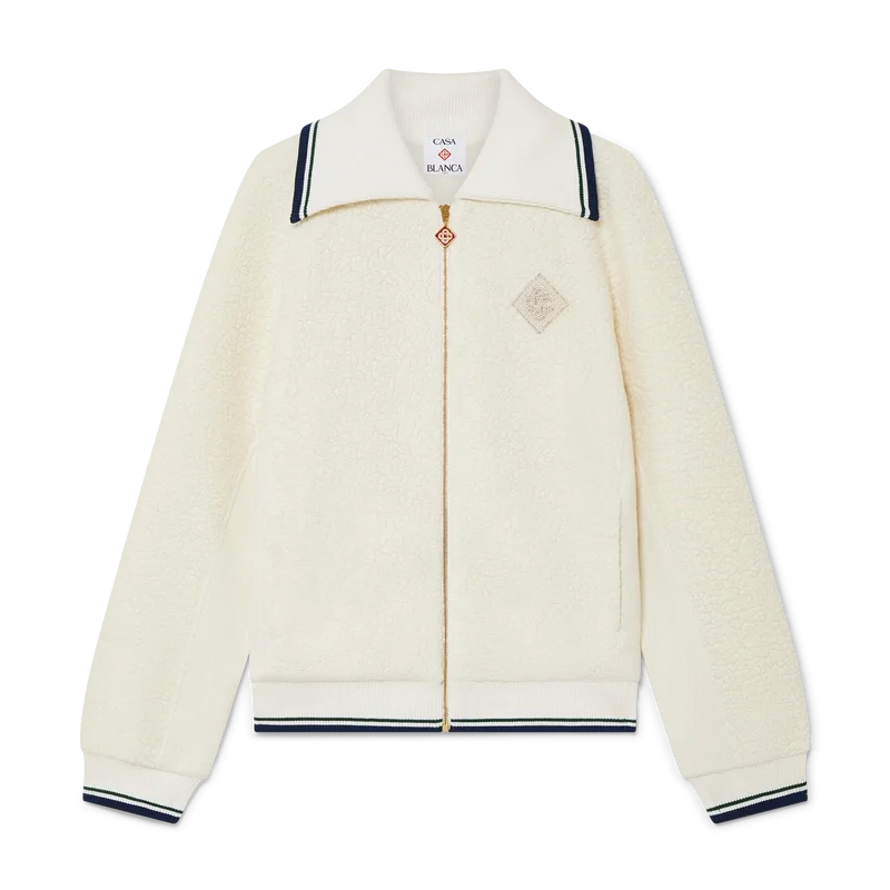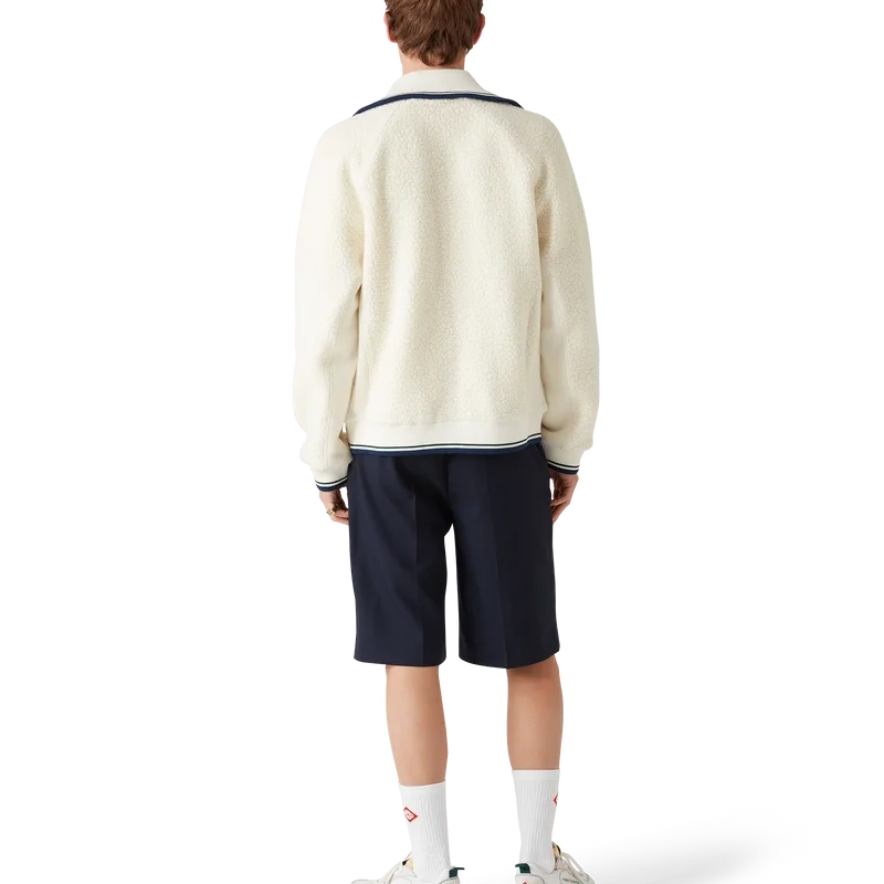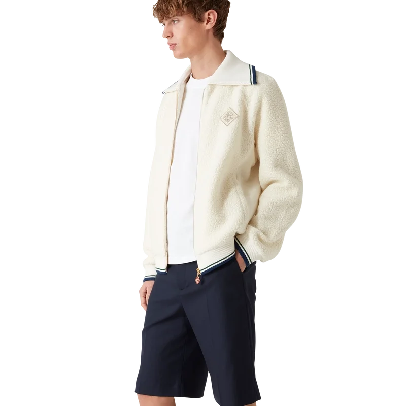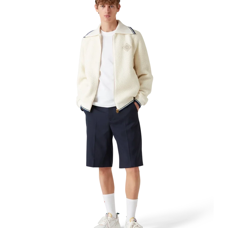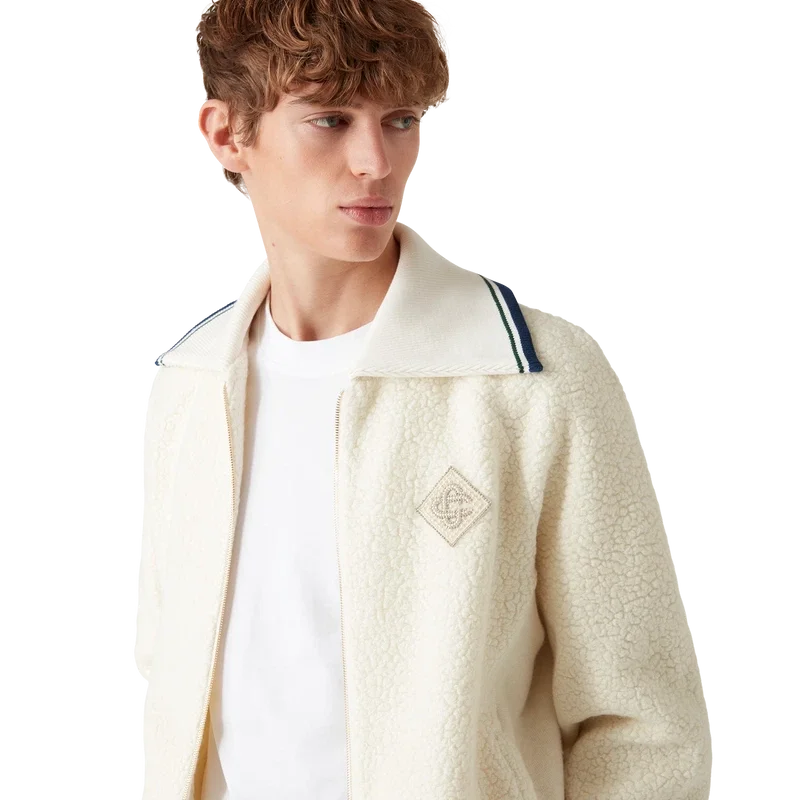 Kashmirtröjan med dragkedja är en långärmad modell tillverkad av kashmirblandat tyg. Den har dragkedja, husets diamantlogo – omtolkad för denna säsong – foder, sidfickor, ribbad krage, muddar och nederkant med randiga detaljer.